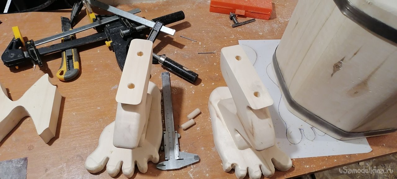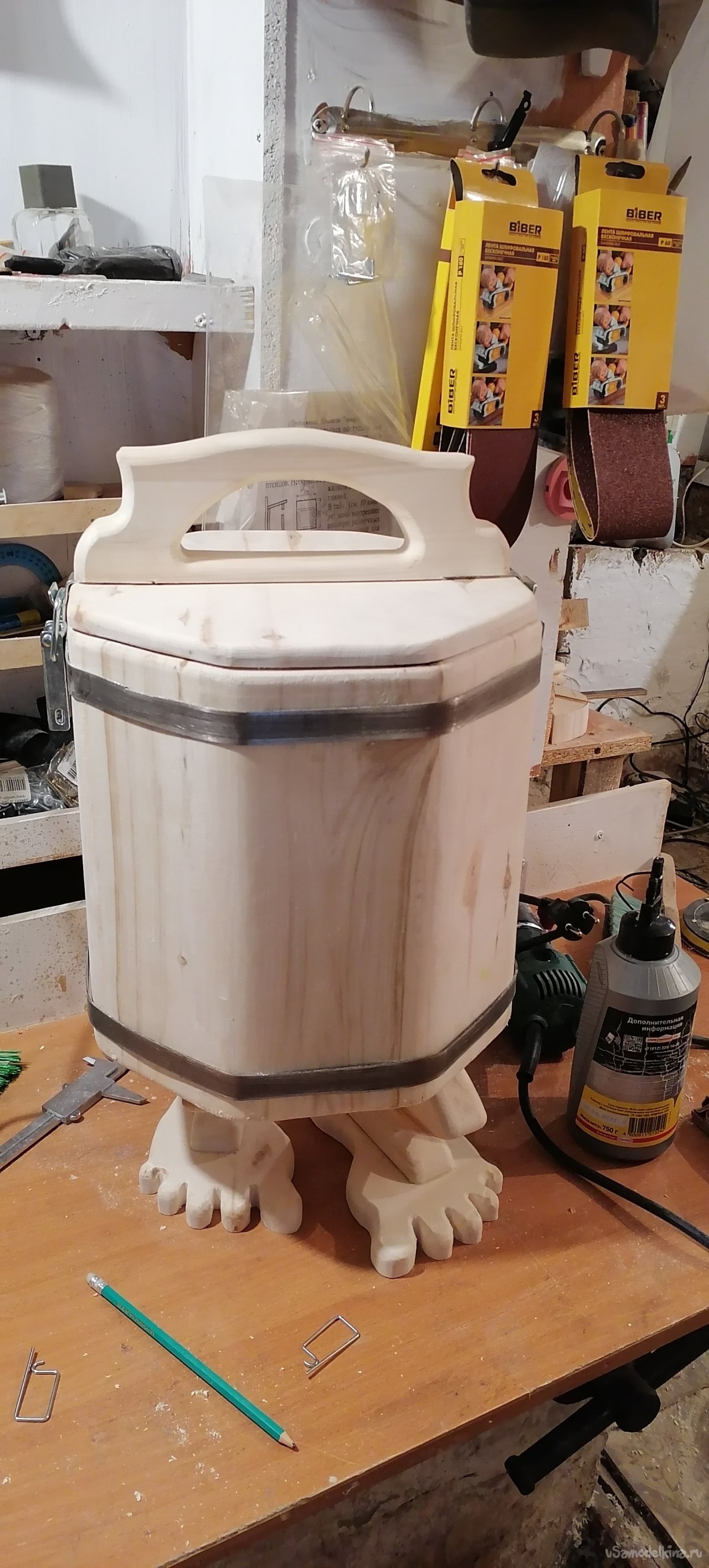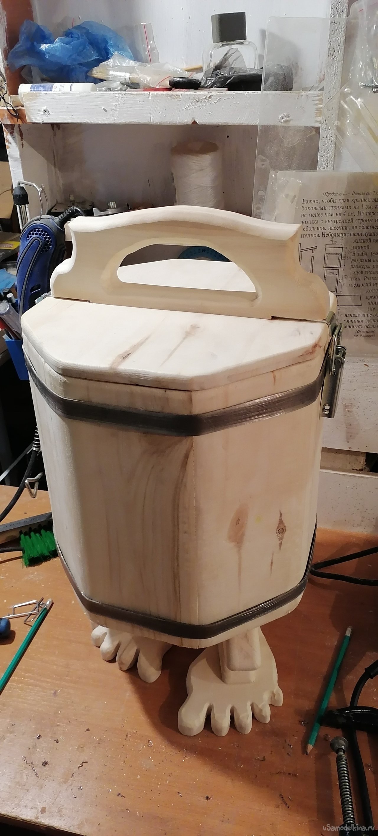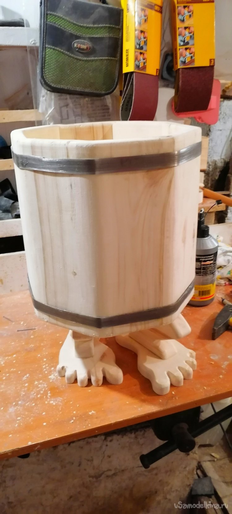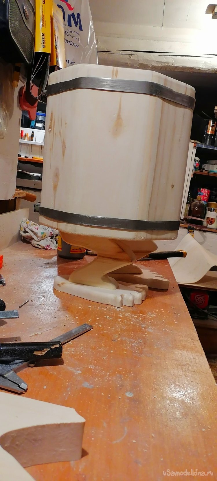 Но моему запарнику не хватало "изюминки". Я решил придать ему оригинальный вид, сделав ножки в виде стилизованных лап. Это придало ему некую "живость", будто он вот-вот оживет и начнет танцевать. Ножки я тоже вырезал из дерева, тщательно обрабатывая их, чтобы они были прочными и устойчивыми.