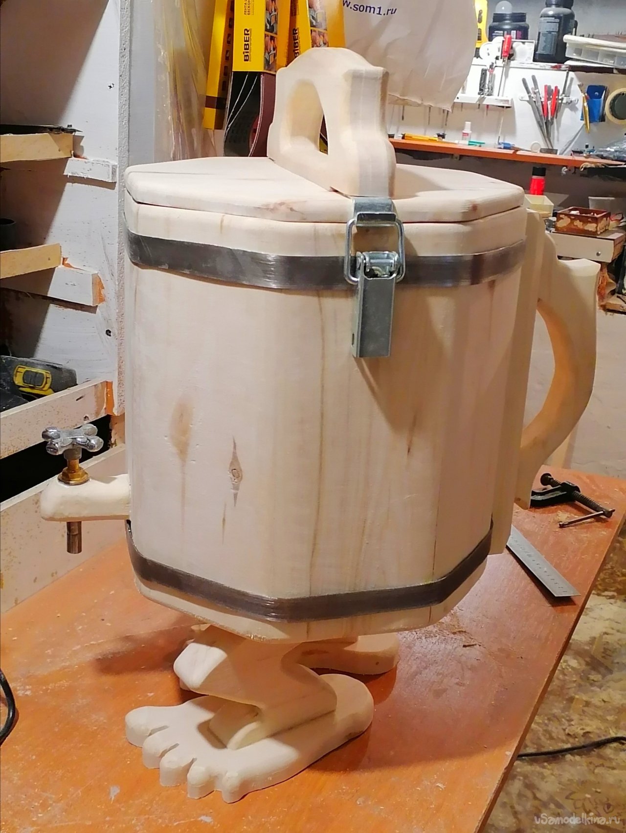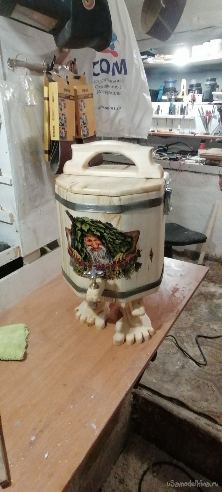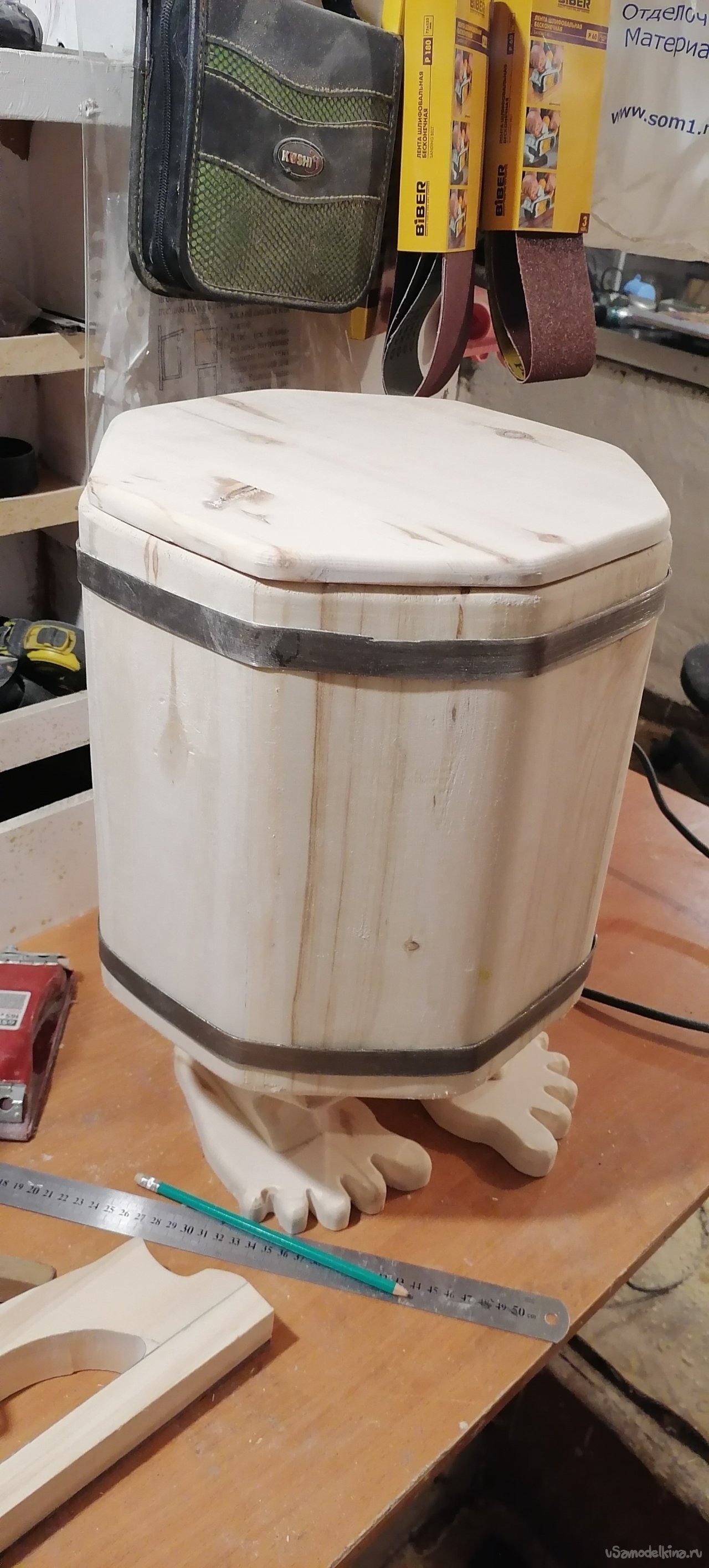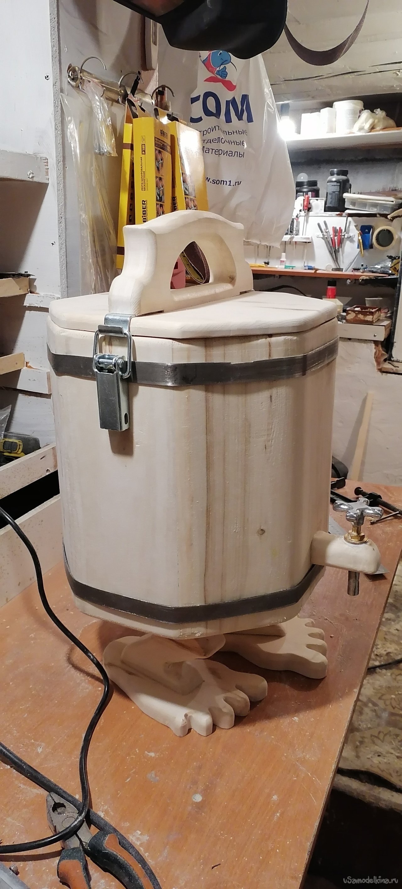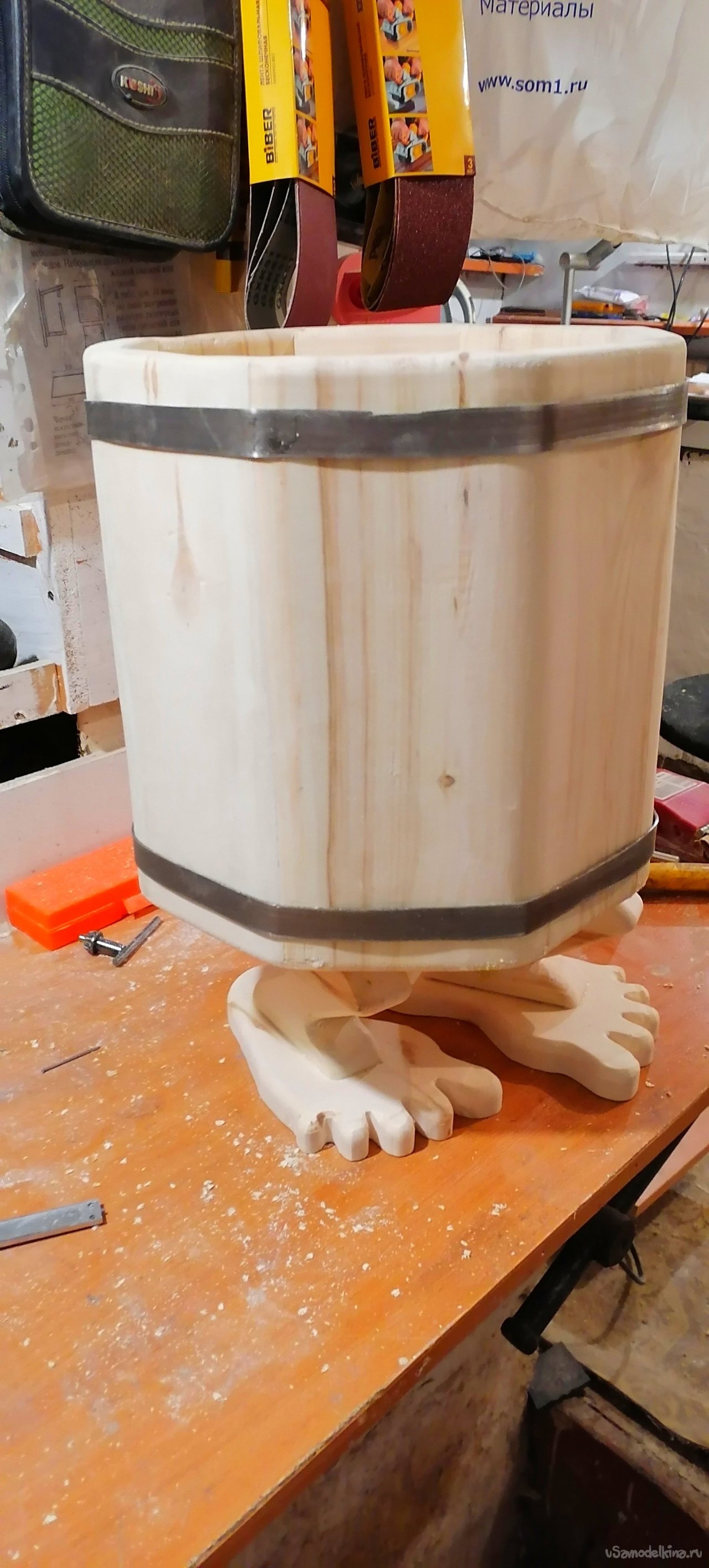 Но моему запарнику не хватало "изюминки". Я решил придать ему оригинальный вид, сделав ножки в виде стилизованных лап. Это придало ему некую "живость", будто он вот-вот оживет и начнет танцевать. Ножки я тоже вырезал из дерева, тщательно обрабатывая их, чтобы они были прочными и устойчивыми.