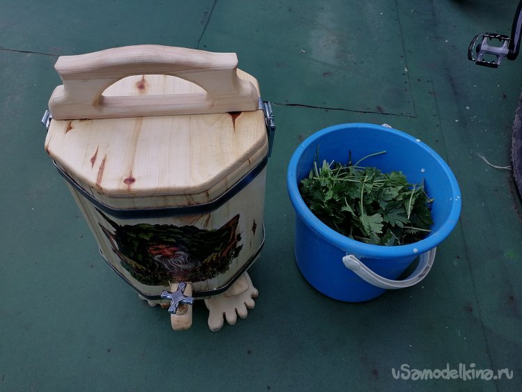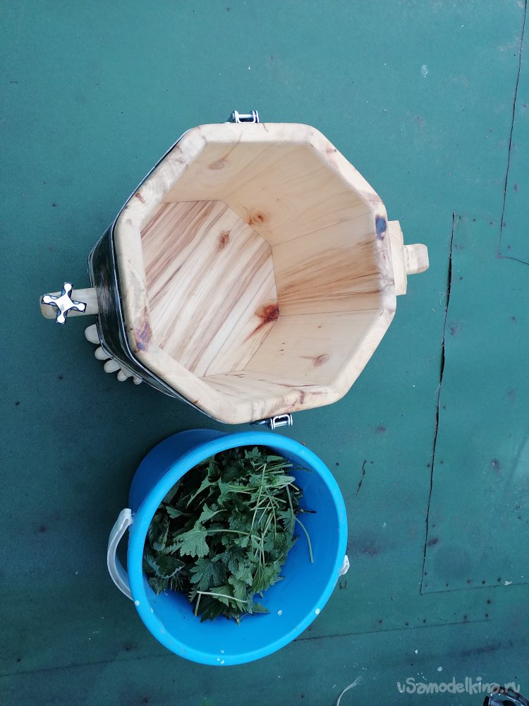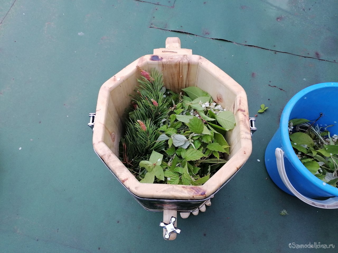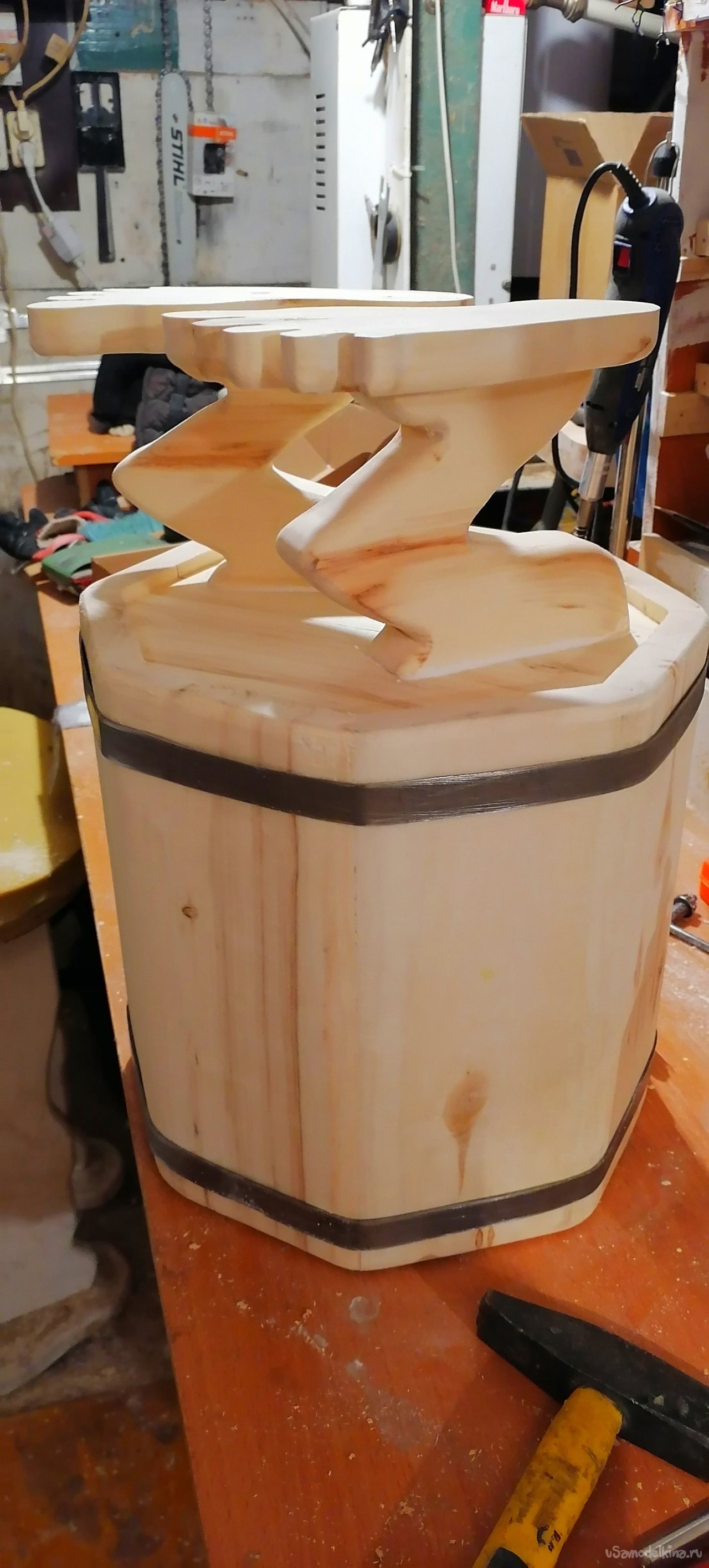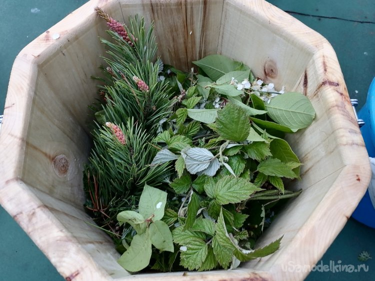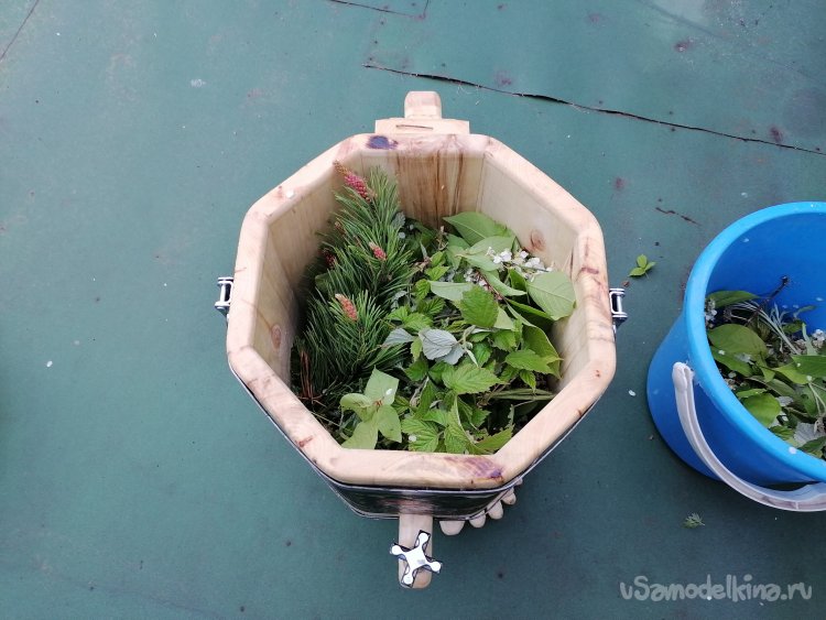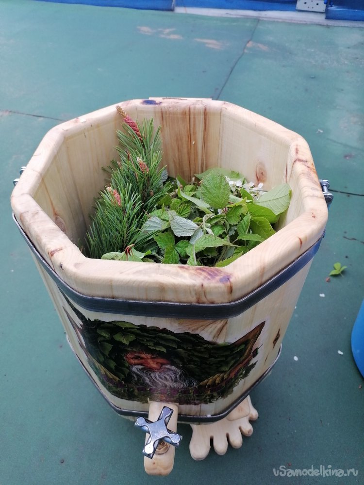 Размеры моего творения получились следующими: общая высота – 55 сантиметров. Диаметр ведра – около 30 сантиметров, а высота самого ведра без ножек – примерно 30 сантиметров. Эти размеры оптимальны для использования в парной, они позволяют удобно разместить необходимое количество трав или веник, а также легко манипулировать запарником.