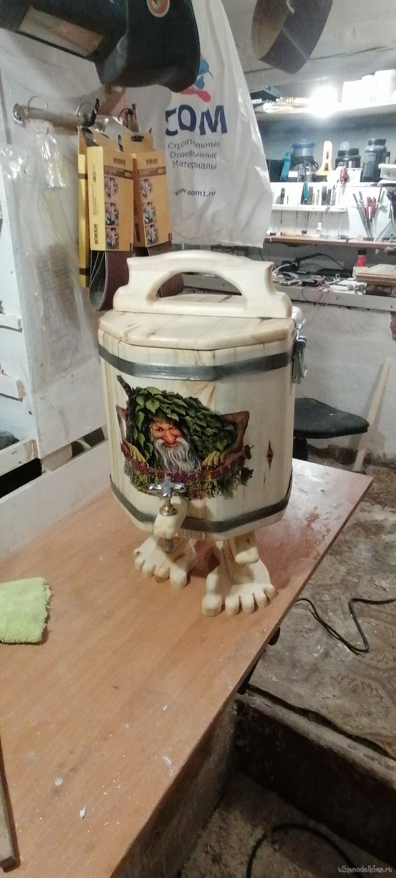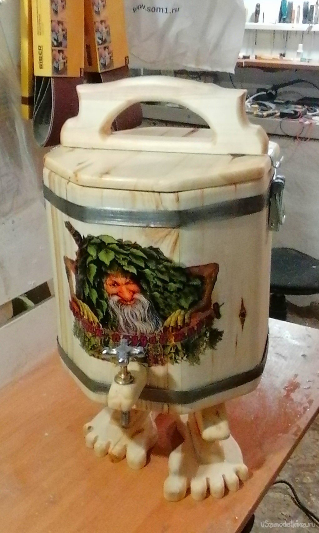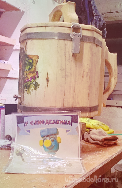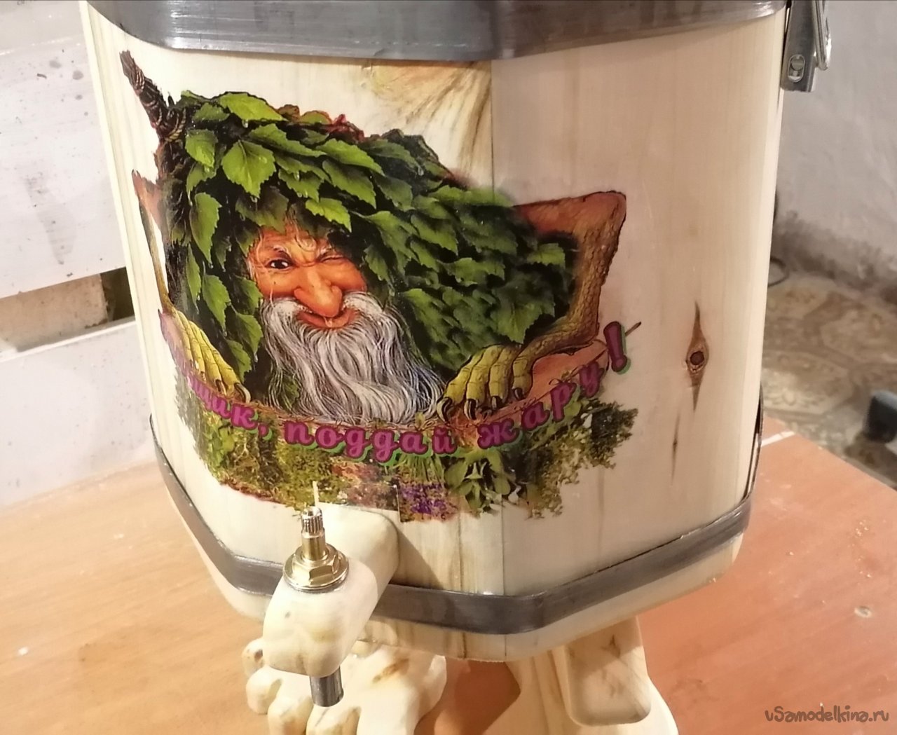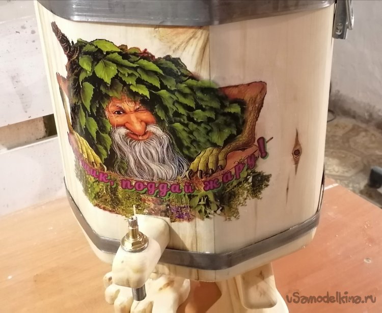 А потом пришла очередь декора. Я хотел, чтобы мой запарник рассказывал историю, чтобы он был не просто предметом, а частью банной мифологии. И тогда я решил изобразить на нем банного духа – сказочного персонажа, укрытого веником. Это было самое интересное и творческое задание. Я тщательно продумал композицию, нанес рисунок.