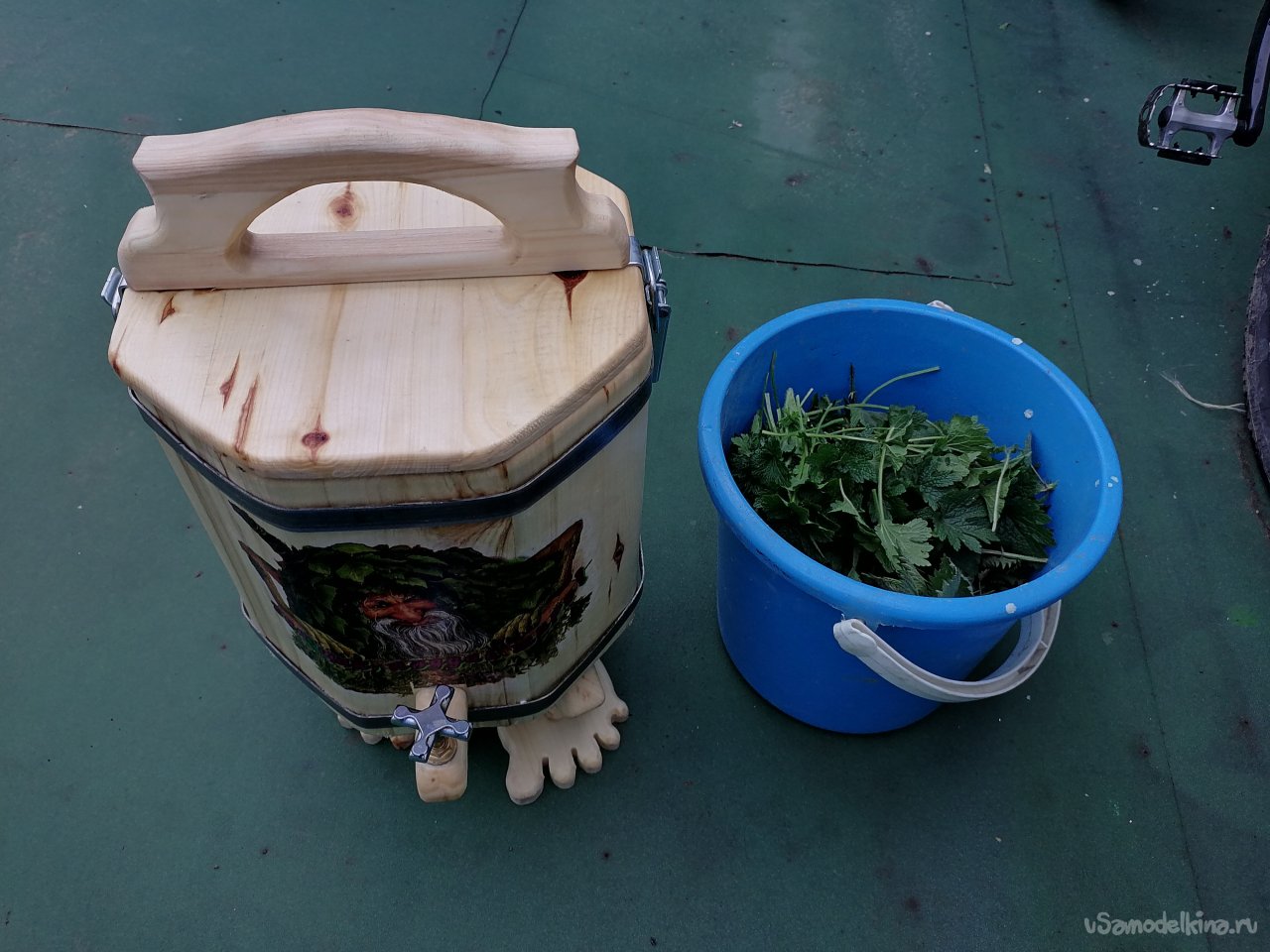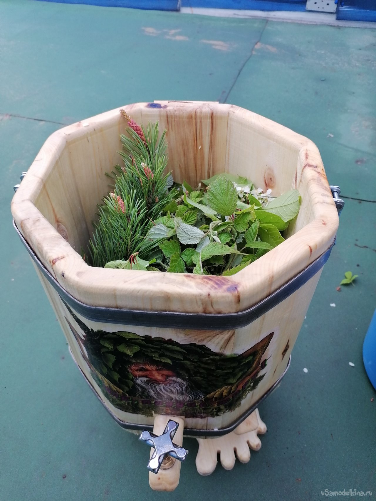Декорирование запарника изображением банного духа – это был самый творческий и вдохновляющий этап. Я долго думал над тем, как должен выглядеть этот персонаж. В итоге я решил изобразить его укрытым веником и снизу травами, чтобы подчеркнуть его связь с природой и банными традициями.