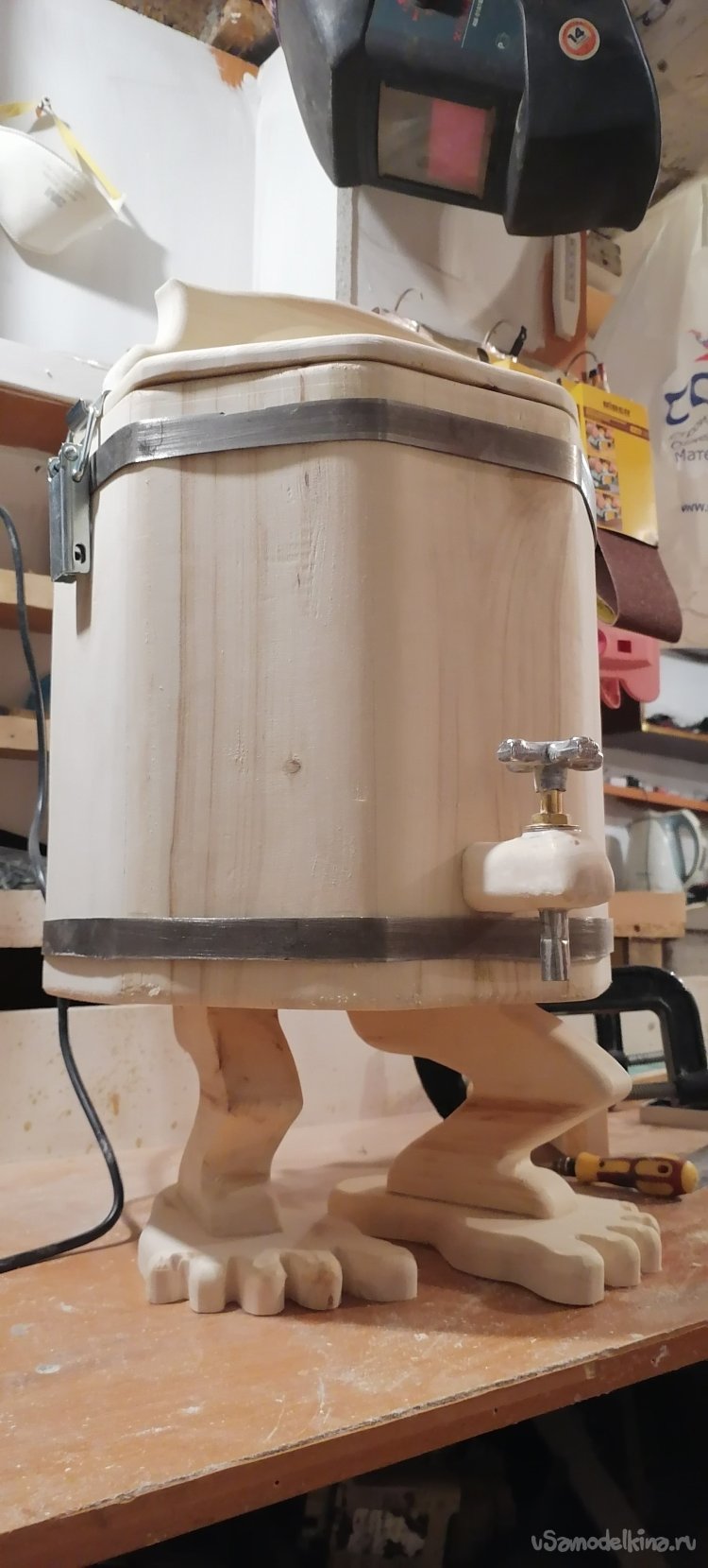 Создание ножек в виде лап – это был мой способ добавить запарнику индивидуальности и характера. Хотел, чтобы он выглядел не просто как предмет, а как живое существо, которое стоит на своих лапах, готовое служить. Я вырезал их из дерева, тщательно обрабатывая каждую деталь, чтобы они были прочными и устойчивыми. Это придало запарнику некую игривость и оригинальность.