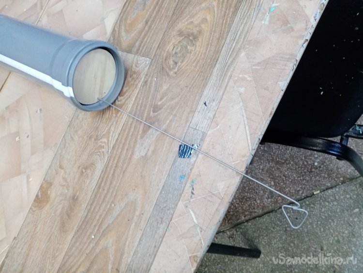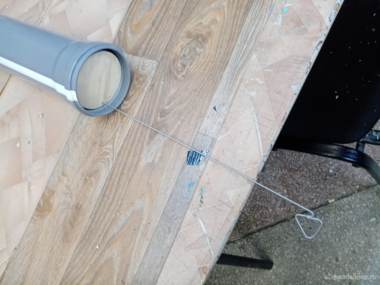 Опускаю площадку в трубу и размечаю длину проволоки с таким расчетом, чтобы она лежала на краю трубы.