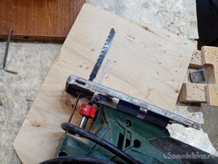 В бой вступает ручной электрический лобзик. Нужно немного настроить агрегат. Первое дело меняю пилку на другую, с мелким зубом. Затем немного наклоняю плоскость реза. Чтобы на краю получился небольшой конус. И еще пилить буду по внутреннему ободу разметки. Чтобы учесть толщину стенки трубы. Можно конечно пойти простым путем. Меряю внутренний диаметр трубы штангельциркулем и при помощи циркуля вычерчиваю круг нужного диаметра.