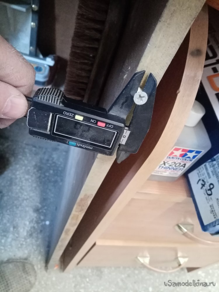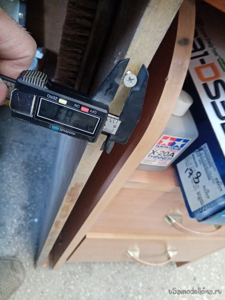 Для подвески на нужное место буду сверлить отверстие. Промеряю цифровым штангенциркулем диаметр шляпки и диаметр стержня шурупа.