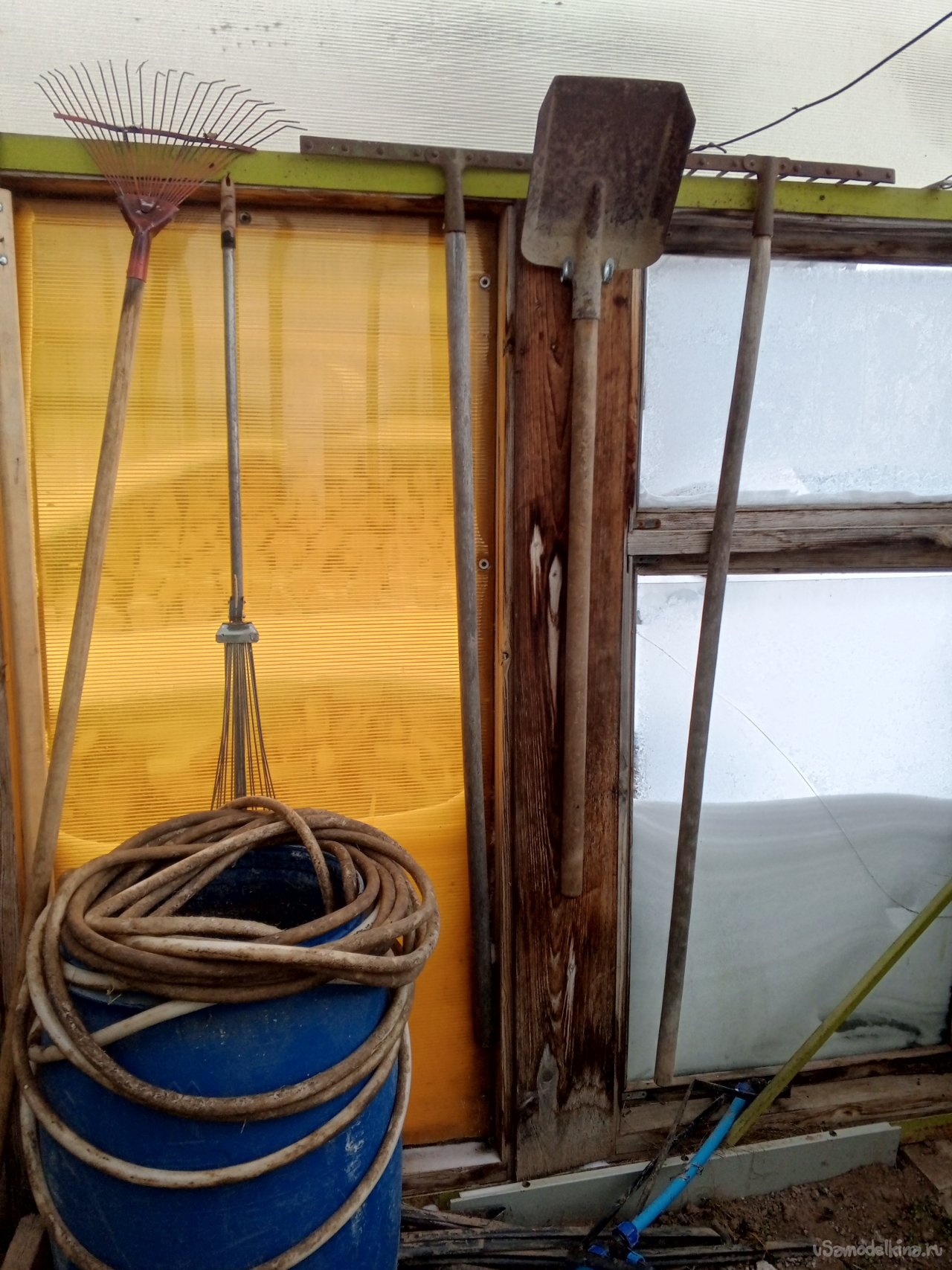 В теплице имеется «уголок» под шанцевый инструмент и «попались на глаза» мне грабли, такие клепанные, еще с времен СССР, сделаны, уже можно сказать на века, и черенки длинные. Попробовал я грабли не по назначению использовать и даже не ожидал, «пошло дело».