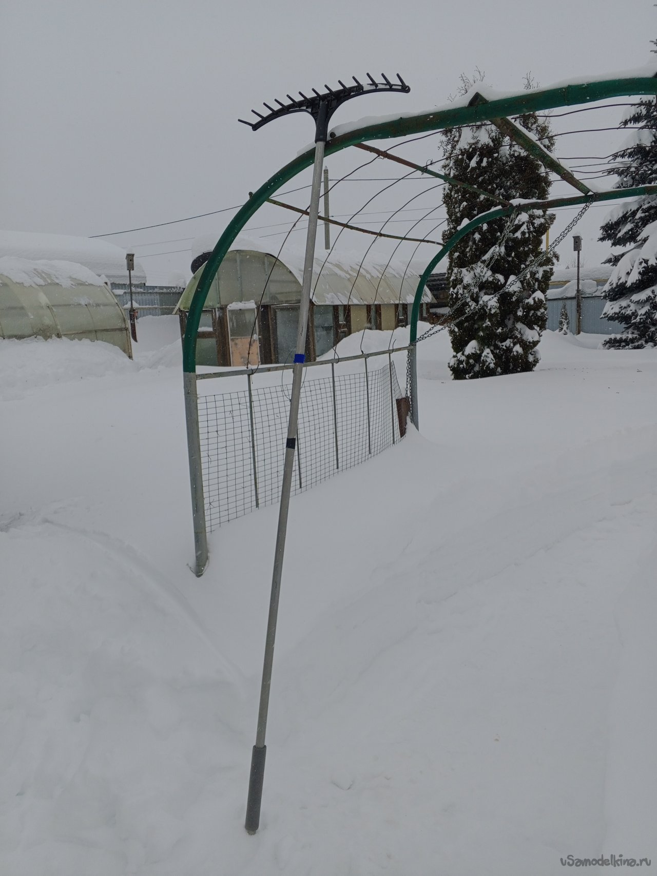 Перевернув грабли «вверх ногами», проталкивал их под низ сугроба, а за счет зубьев откалывал довольно крупные куски. Единственное что, старался не зацепить металлом поликарбонат и крепежные элементы. С первой чисткой снега, грабли справились очень даже неплохо, конечно, и по сугробам пришлось полазить. Впереди намечались большие снегопады. Вот тут-то и «пришла, мысля» сделать стяжку – снегоуборщик, по принципу граблей.