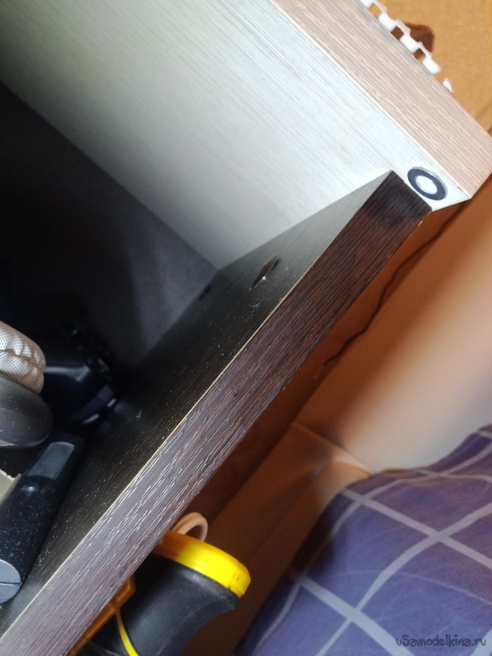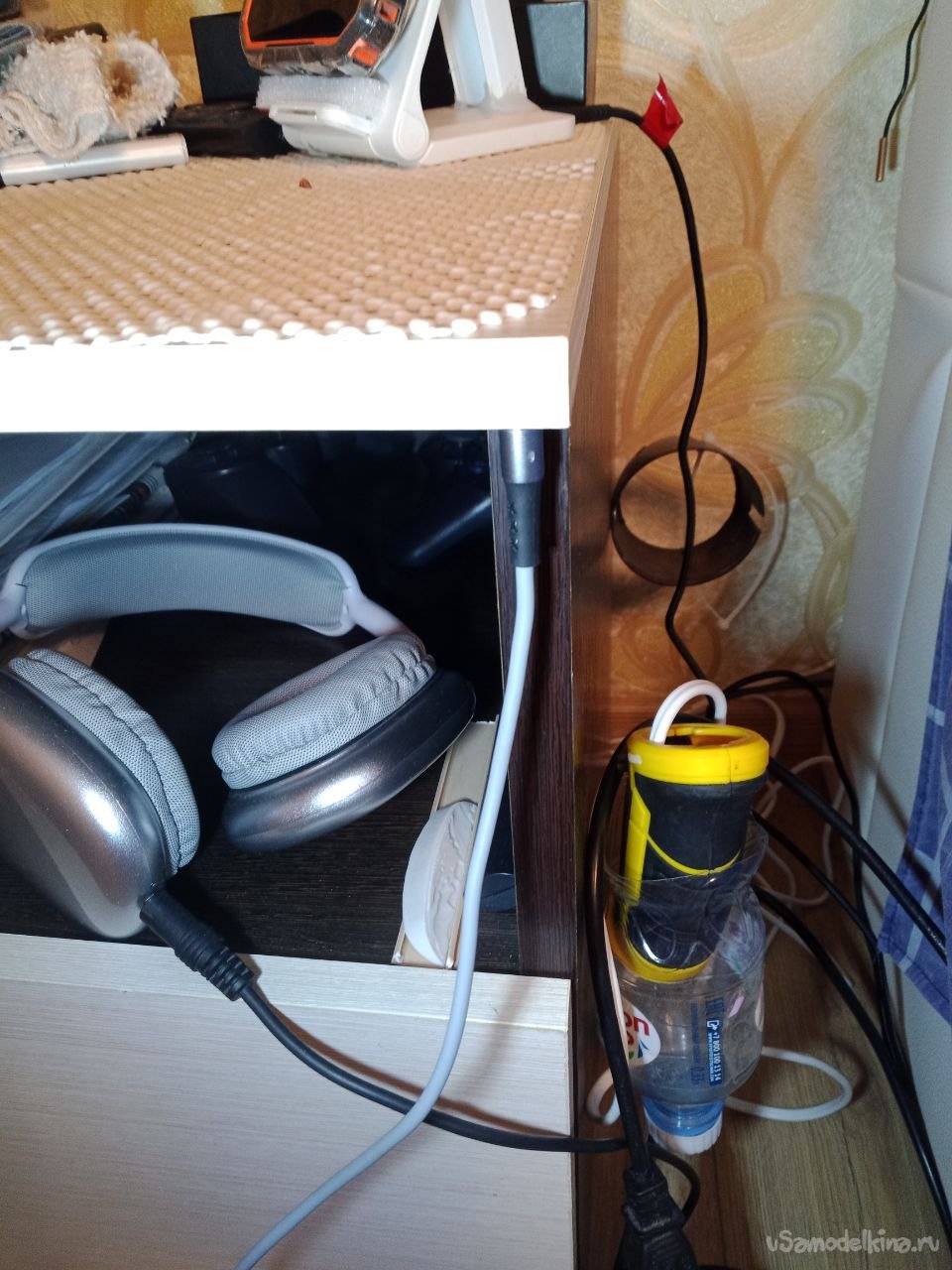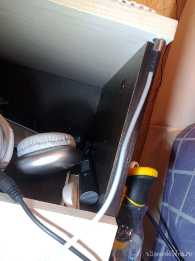 А так выглядит "парковка" для магнитной зарядки. Чтобы не на полу лежала, а культурно располагалась и быстро доставалась. К крышке прикроватной тумбочки снизу двухсторонним скотчем приклеена шайба, к ней и прикрепляется штекер, он же магнитный.