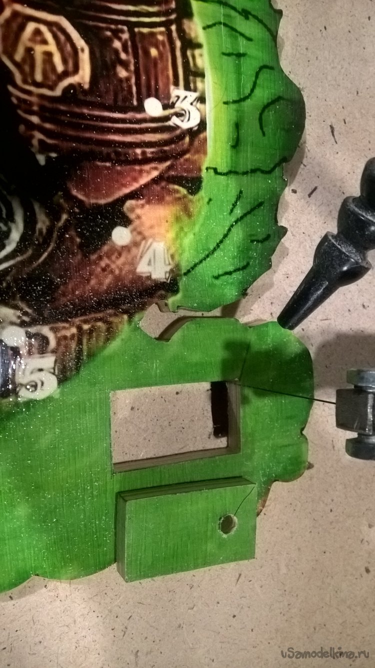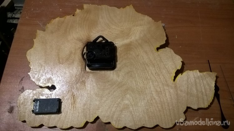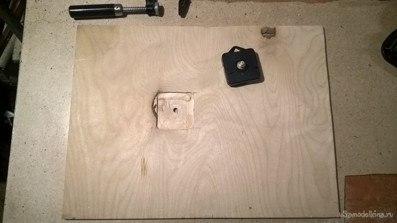 - Сердце часов — механизм. С обратной стороны с помощью фрезера я выбрал идеально ровное углубление под кварцевый часовой механизм. После сверления центрального отверстия настал самый волнительный момент финальной сборки: установка механизма, насадка стрелок. Я специально выбрал металлические стрелки лаконичного дизайна, а секундную — ярко-красную. Этот маленький алый штрих оживил всю композицию, добавив ей динамичной точки внимания.