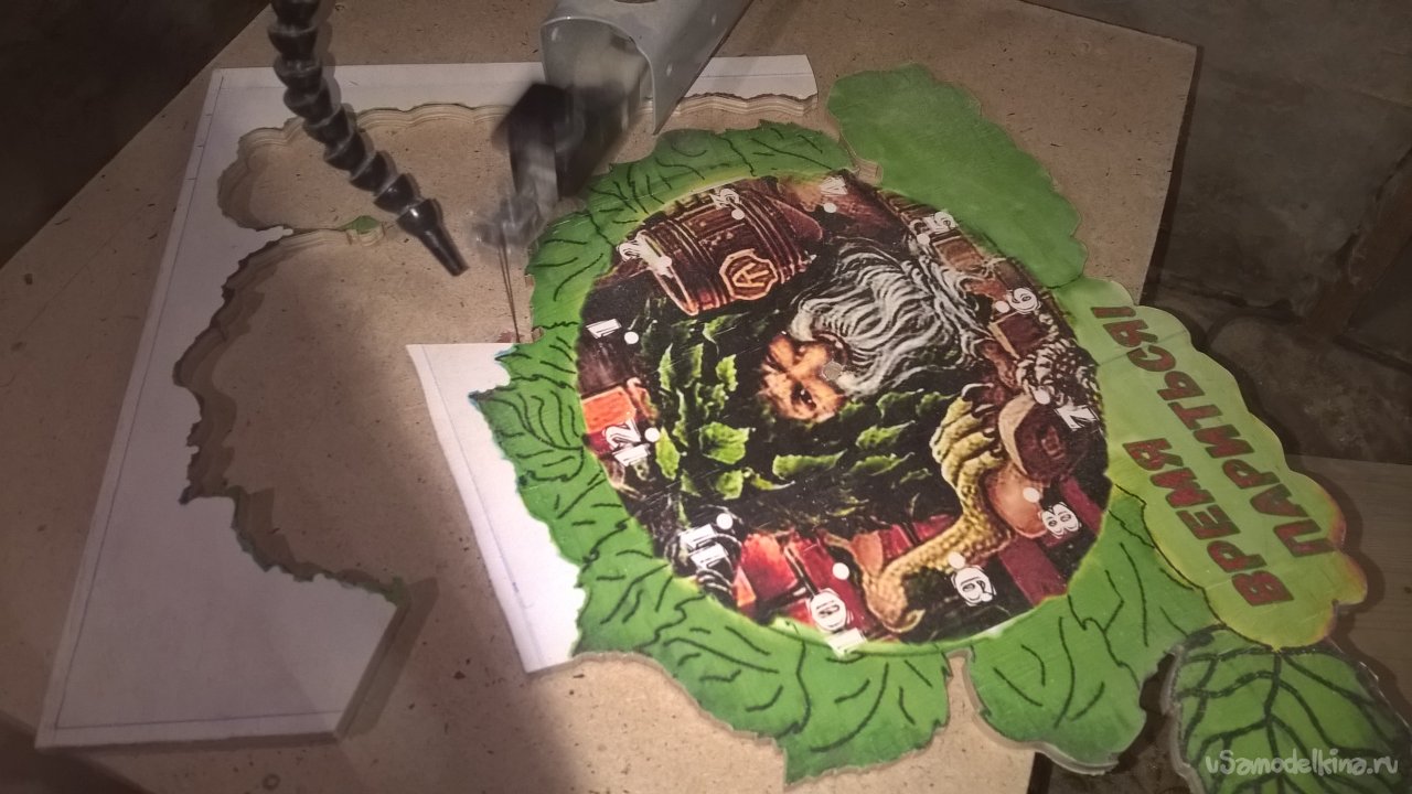 Окружение должно было его дополнять, но не перегружать. Я выбрал фон в тёплых, медово-охристых и древесных тонах, имитирующий свет от печи и структуру старого дерева. Обрамление из зелёных листьев связало персонажа с формой самого корпуса.