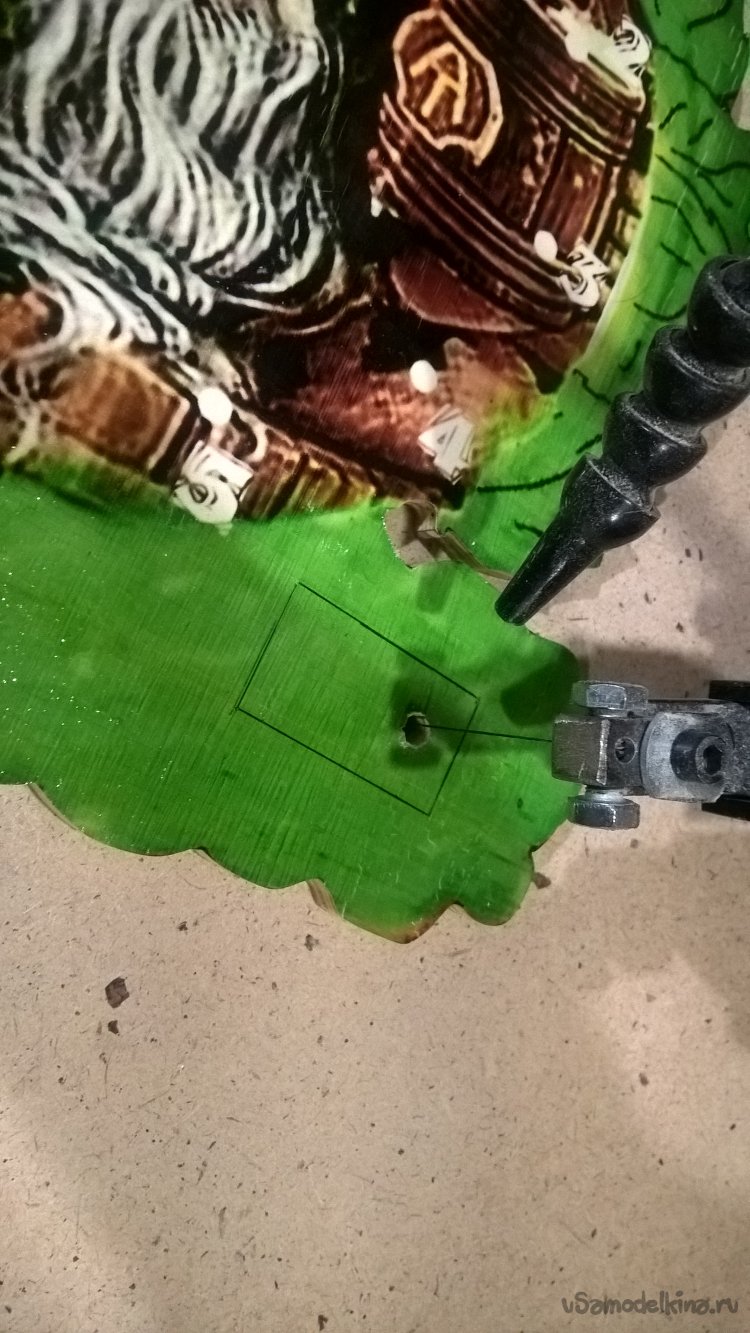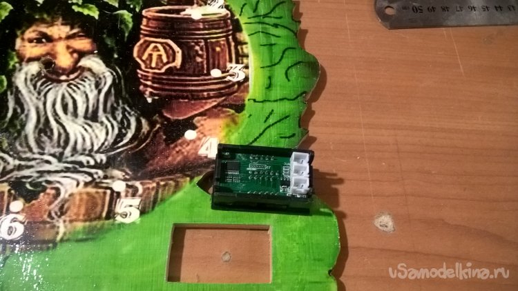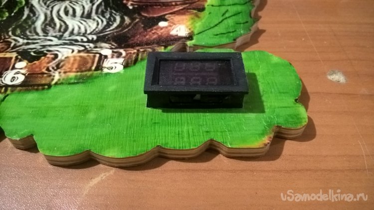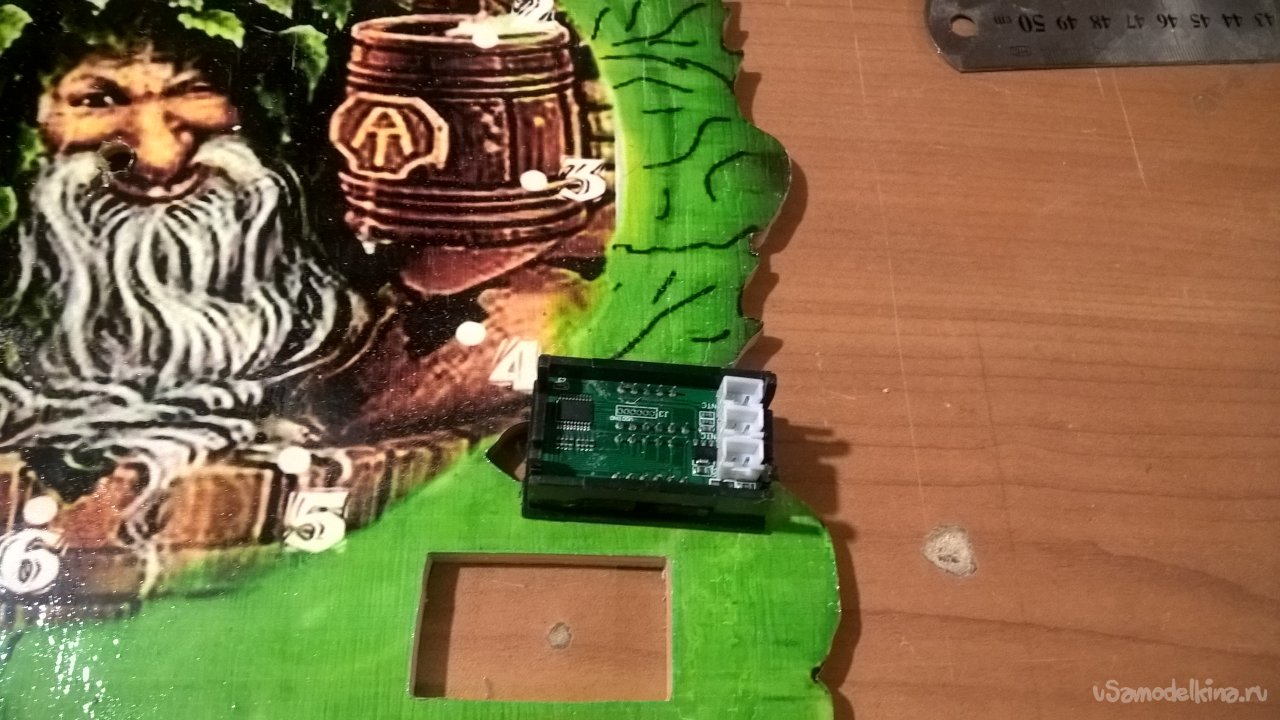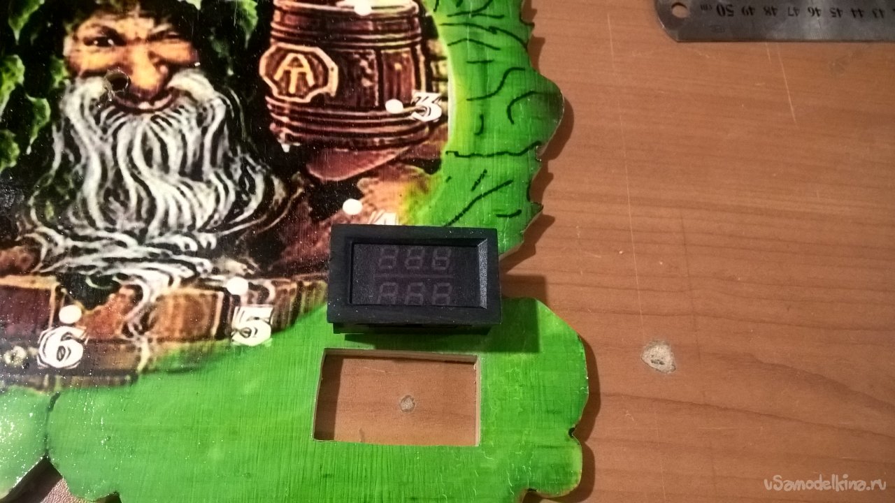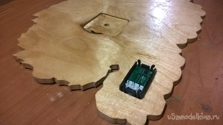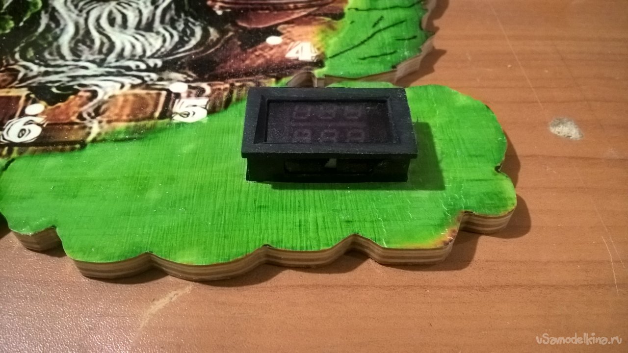 - Внедрение технологий. Мне хотелось, чтобы часы были не только красивы, но и умны. В правом нижнем углу, не нарушая композиции, я вырезал аккуратное прямоугольное окошко. В него был установлен компактный цифровой термометр с двумя выносными датчиками. Теперь можно, бросив взгляд на часы, видеть температуру и в парной, и в предбаннике, не бегая с отдельным прибором. Это тот случай, когда практичность усиливает эстетику, делая объект более совершенным.