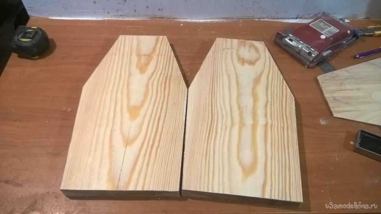 Я разметил на доске переднюю и заднюю стенки. Высота — 40 см от прямого низа до верхней точки под углом. Ширина — 15 см (это и будет внутренняя ширина дна). Важно помнить: расстояние от летка до дна должно быть не менее 20-25 см для гнезда. Боковины я выпилил так, чтобы их верхний срез повторял угол ската, а высота по переднему краю была равна высоте передней стенки в самом низком углу.