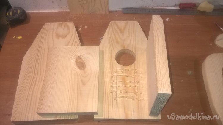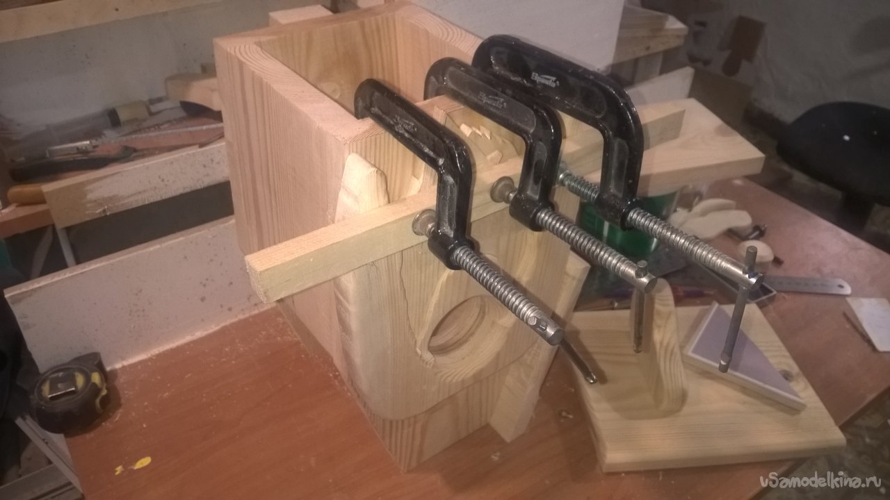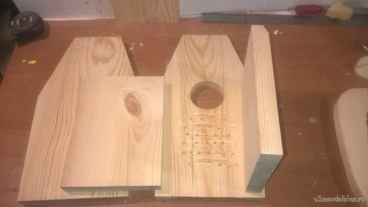 Сначала я собрал коробку домика насухо, без клея, стянув струбцинами. Проверил углы, примерил дно и крышу. Все стало на свои места. Затем разобрал и собрал уже на саморезы, предварительно капнув в стыки клей ПВА. Это обеспечит прочность и герметичность.