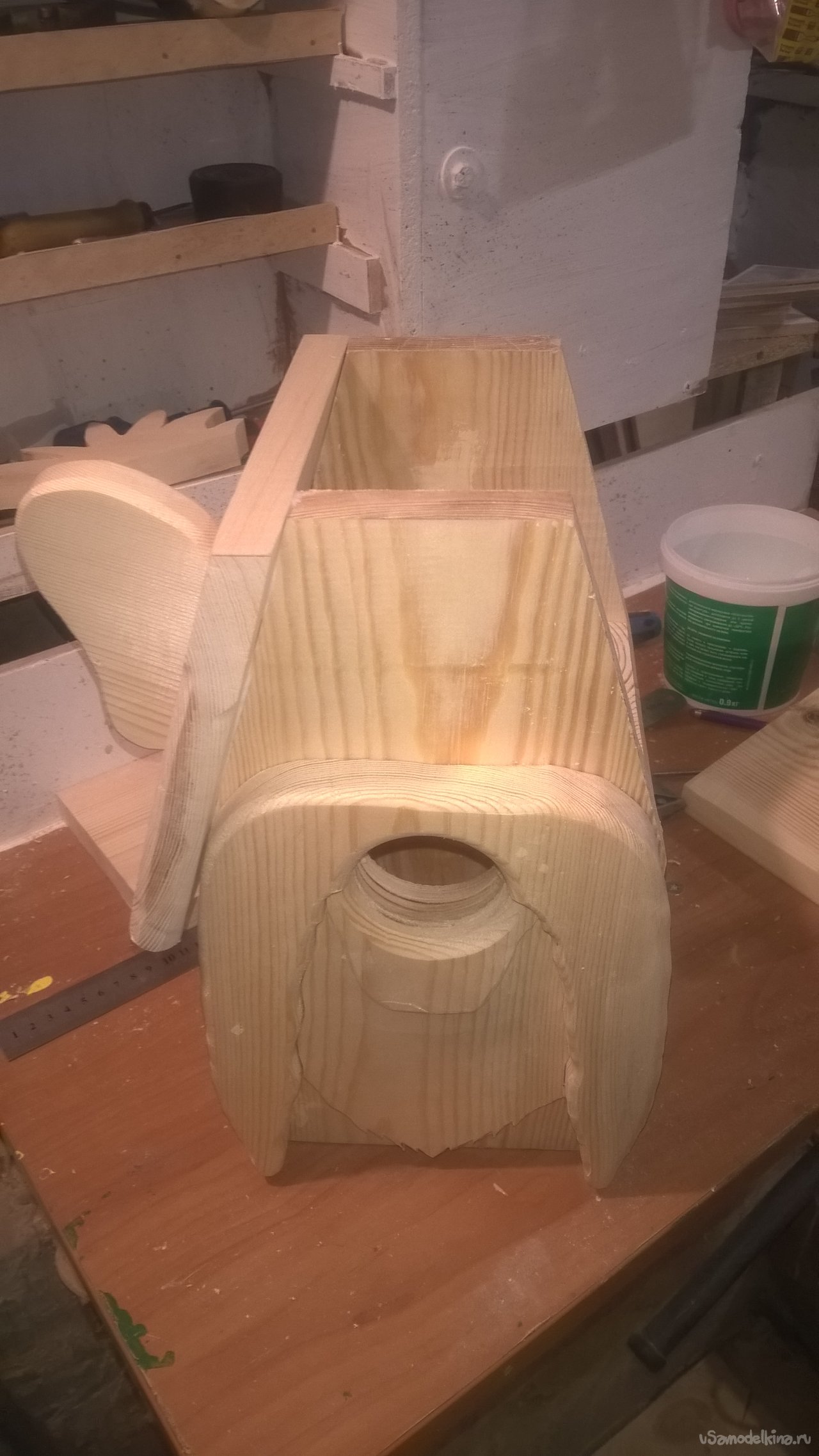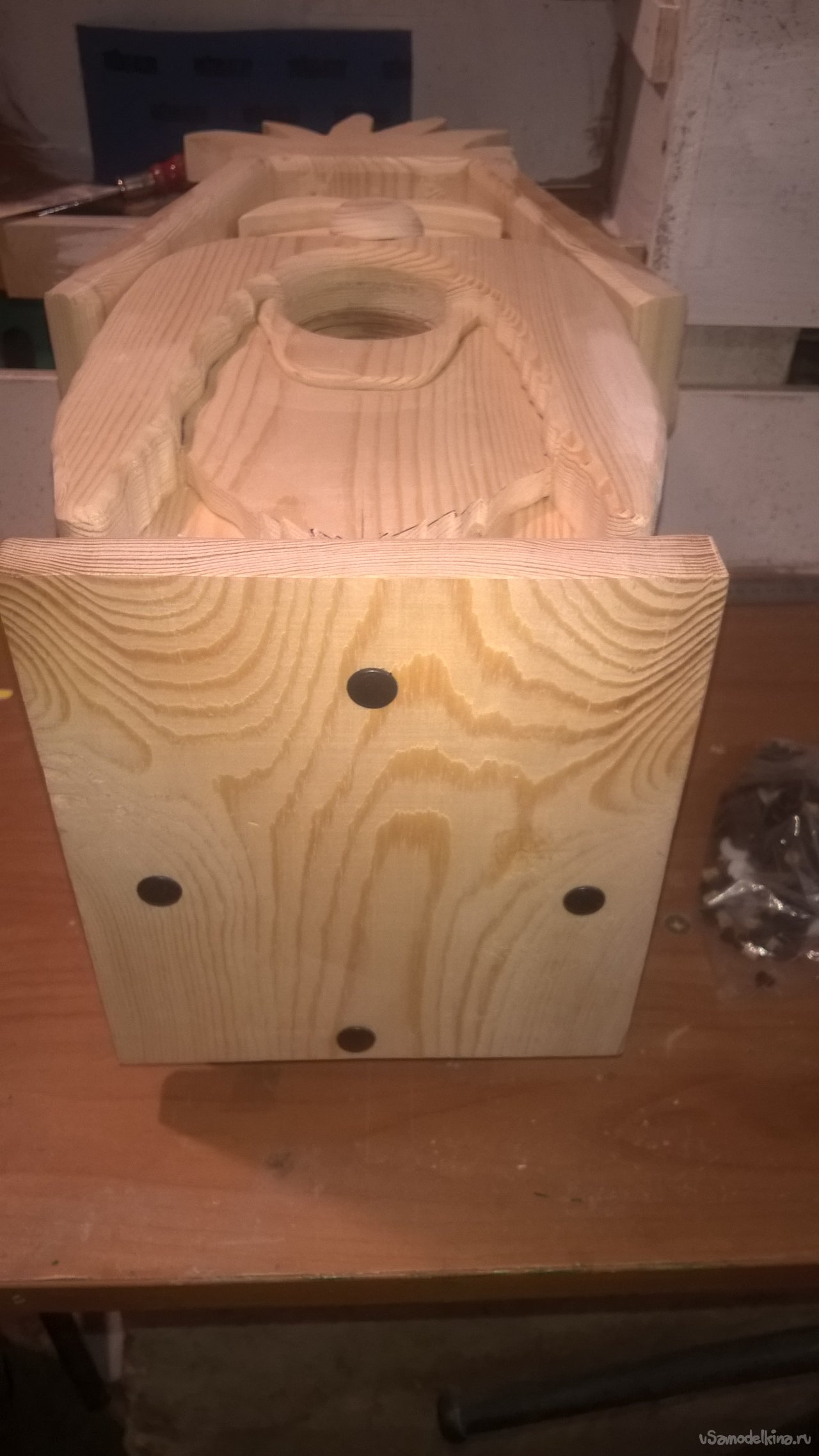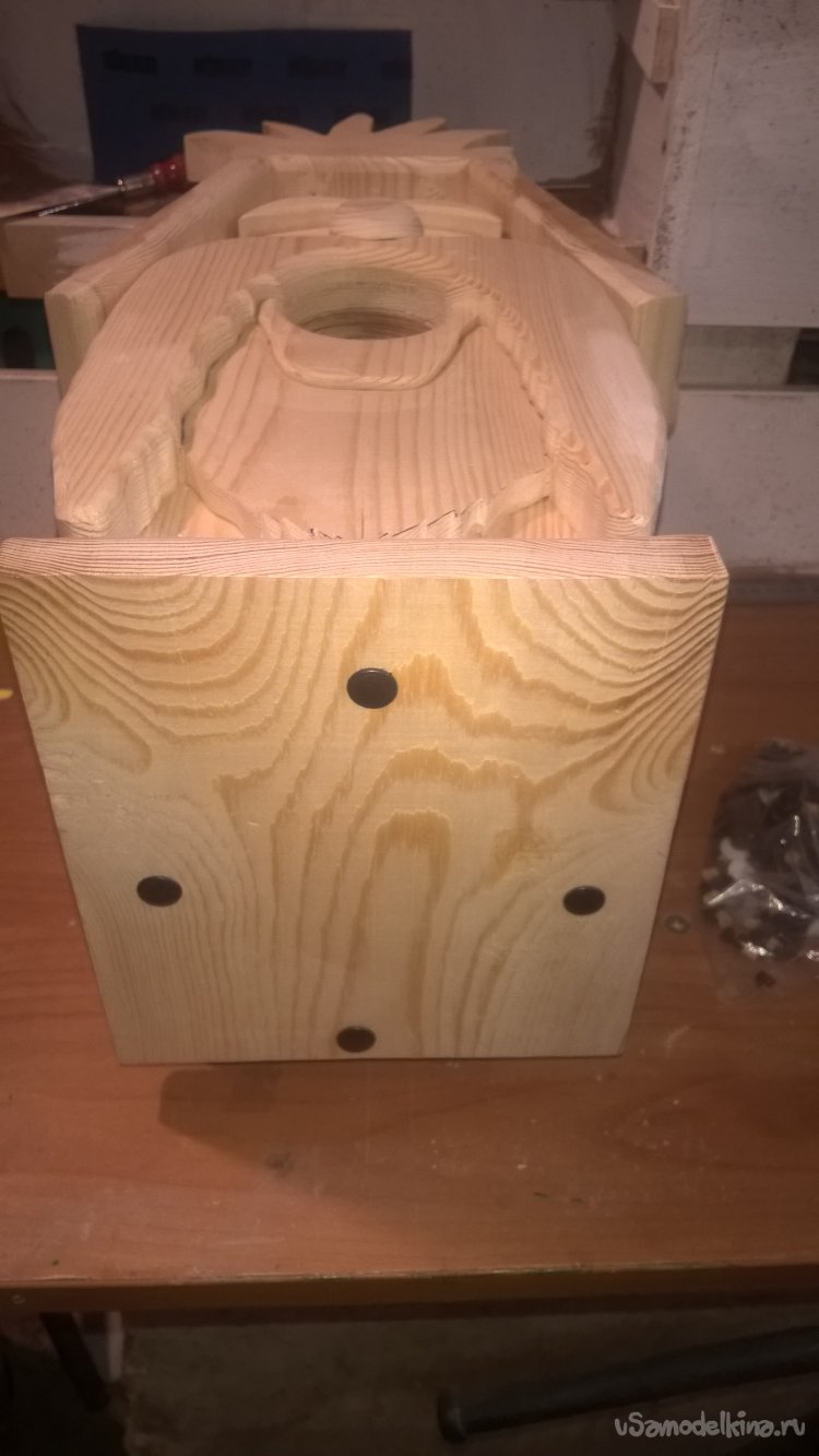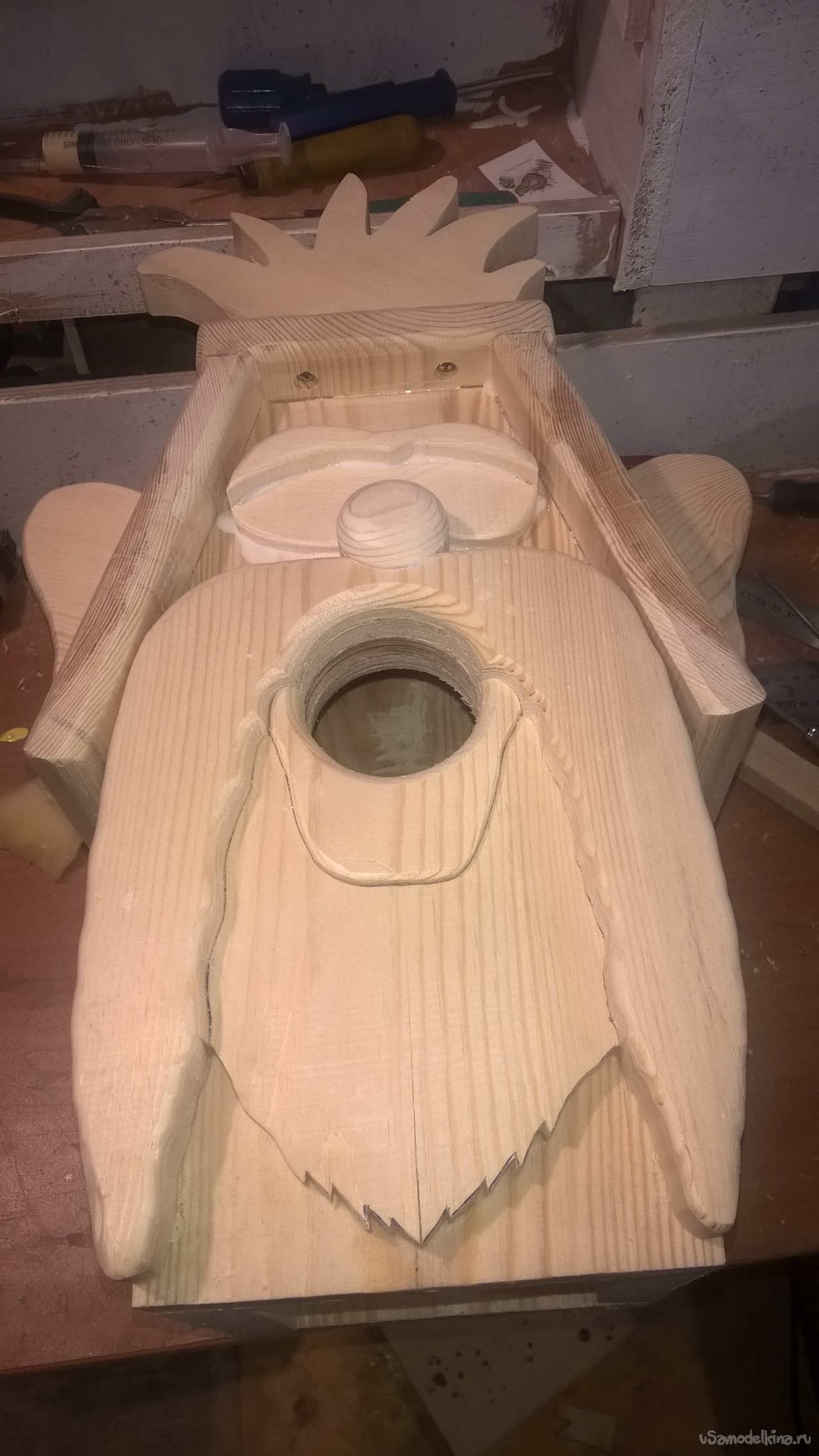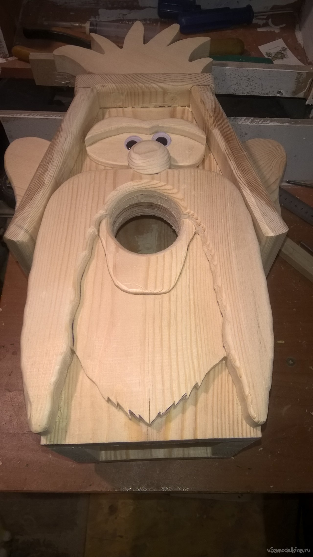 Потом наступил самый волнующий момент — сборка лица. Я разложил все детали на передней стенке, как пазл, двигая их, отходя, смотря со стороны. Сначала занял свое место нос. Потом под ним — борода. Бороду посадил на обильный слой клея, а для верности изнутри, в местах, которые потом закроются крышей и боковинами, притянул короткими саморезами.