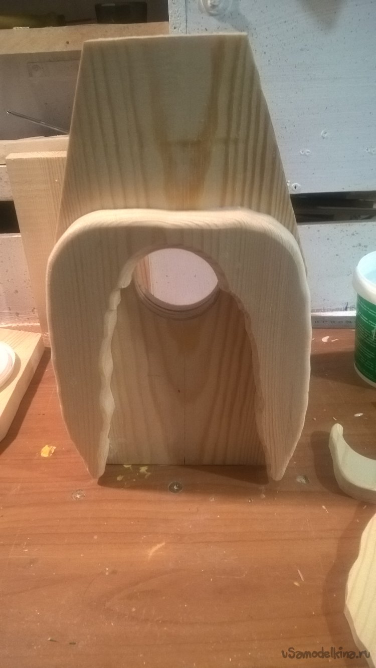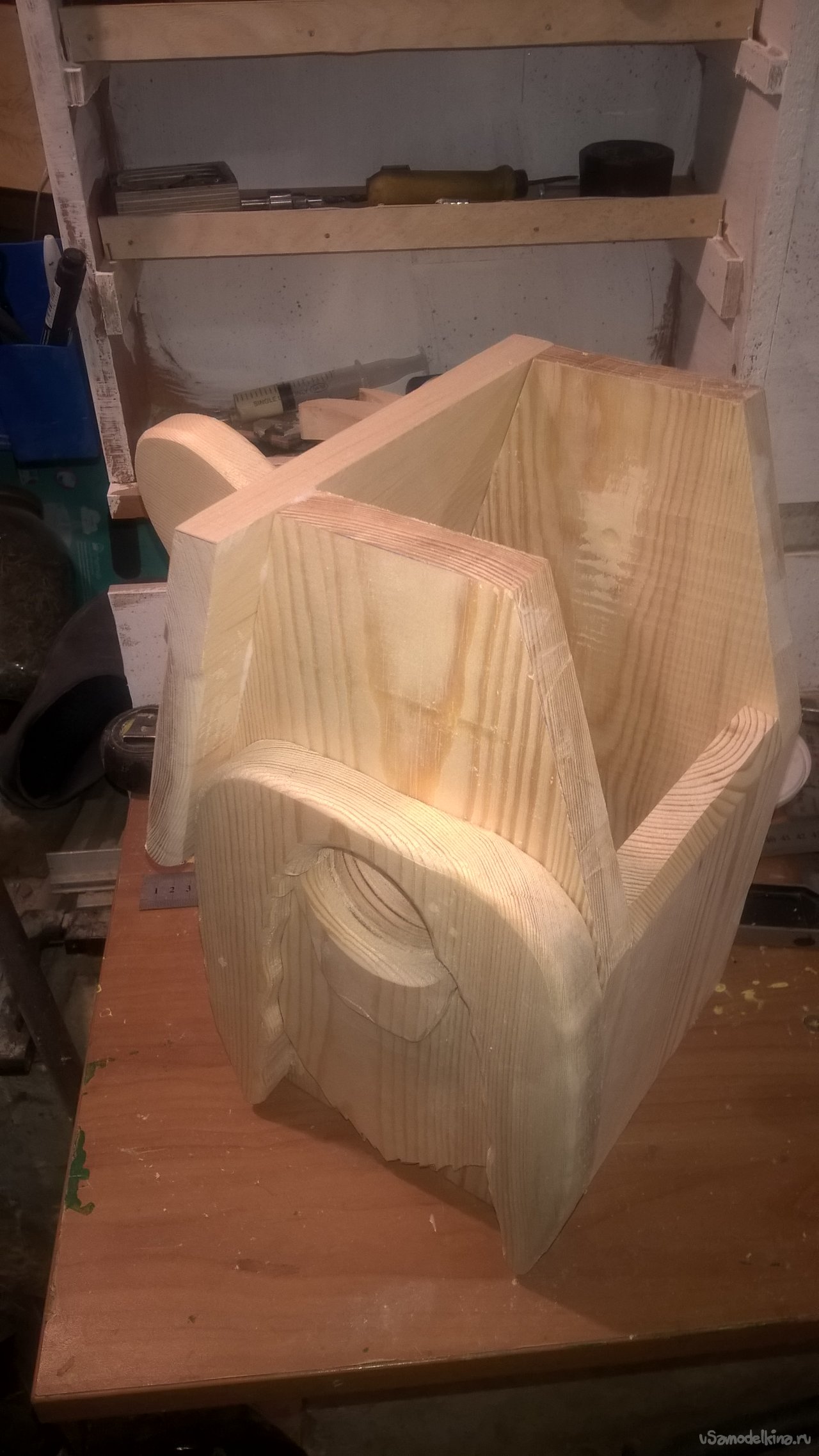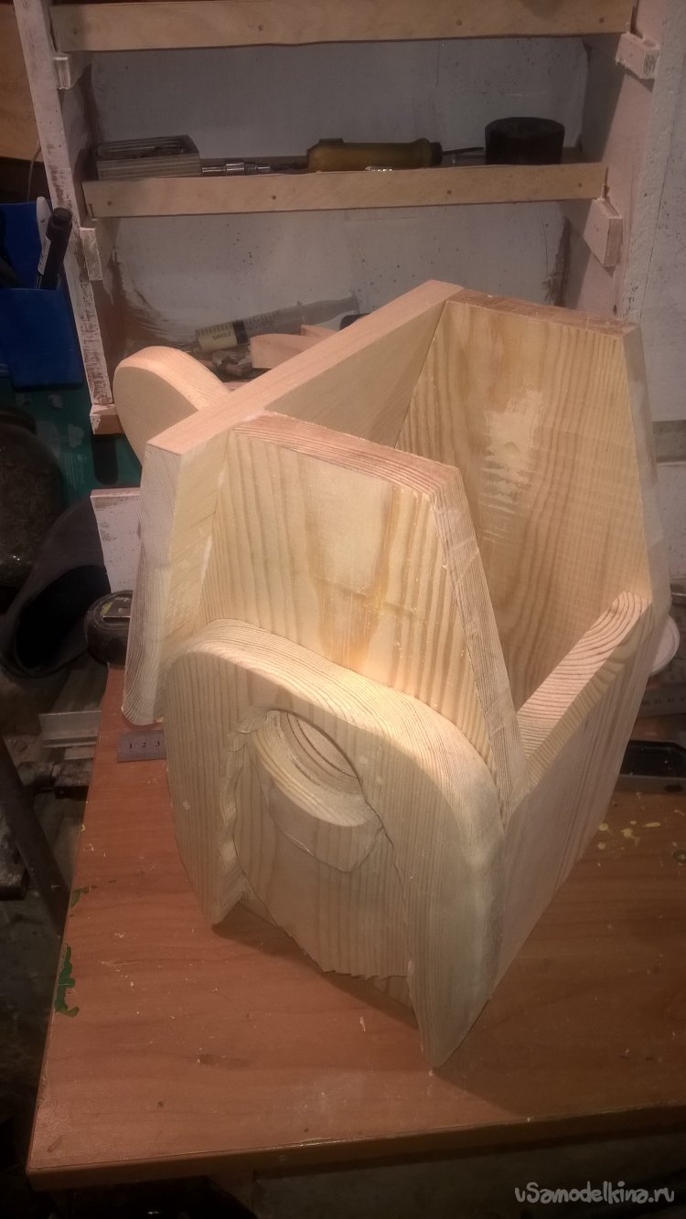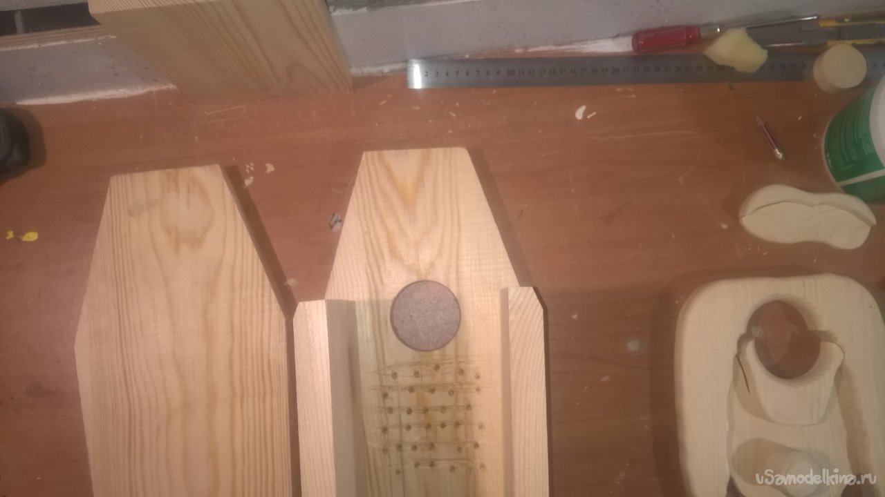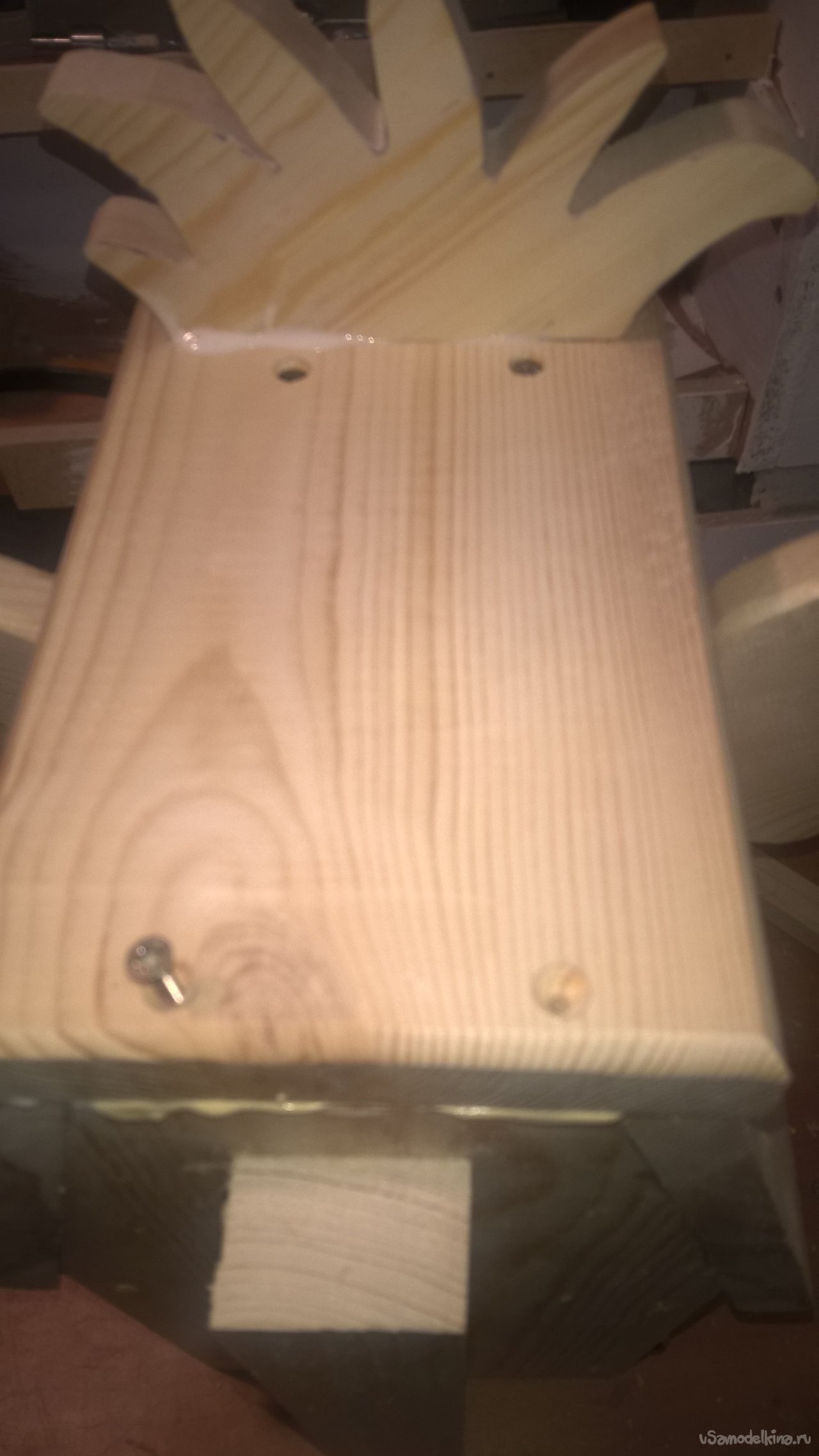 Потом наступил самый волнующий момент — сборка лица. Я разложил все детали на передней стенке, как пазл, двигая их, отходя, смотря со стороны. Сначала занял свое место нос. Потом под ним — борода. Бороду посадил на обильный слой клея, а для верности изнутри, в местах, которые потом закроются крышей и боковинами, притянул короткими саморезами.
