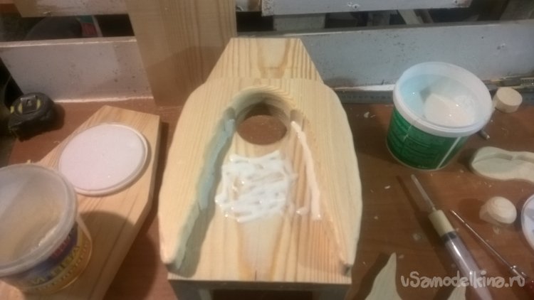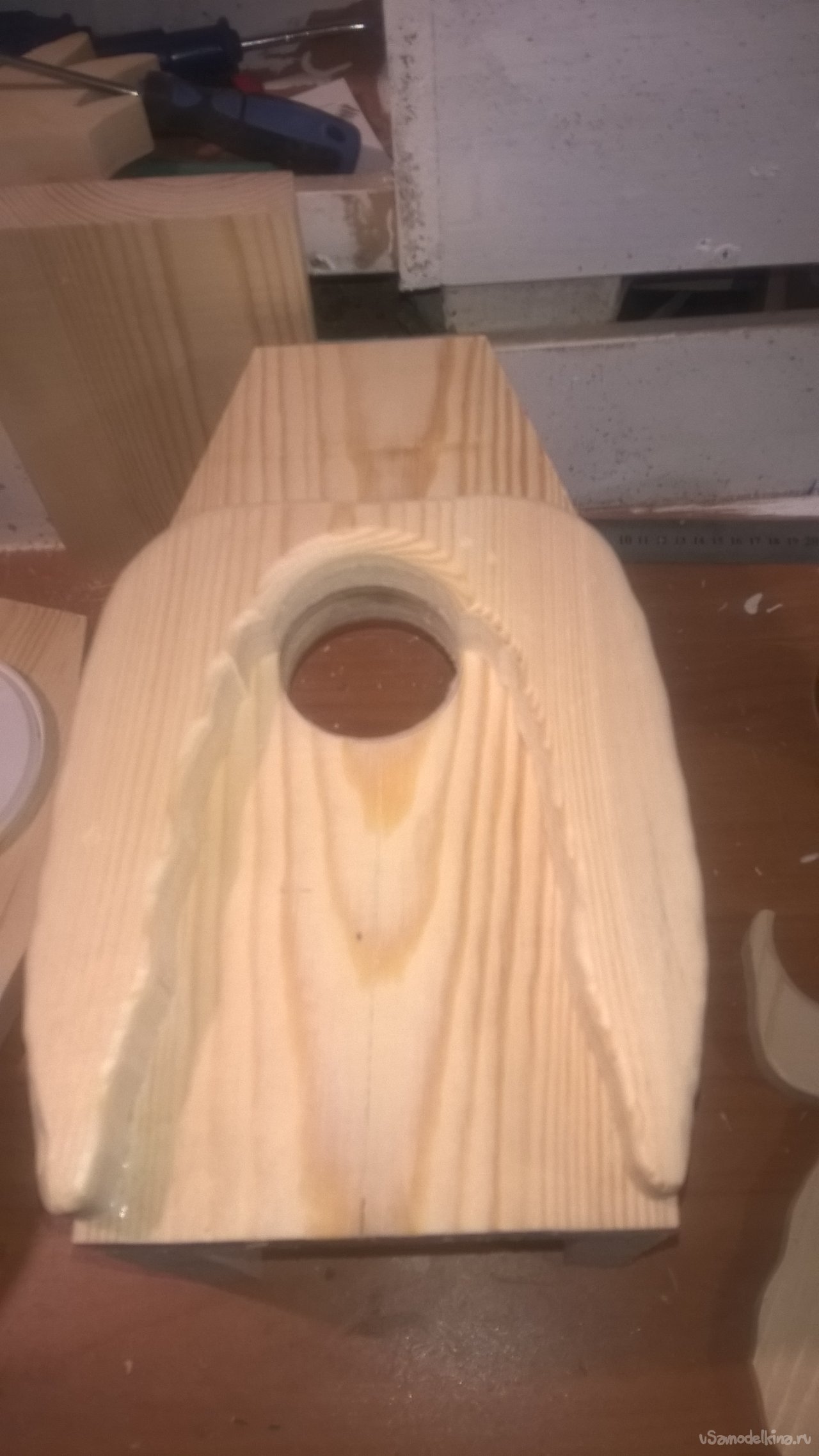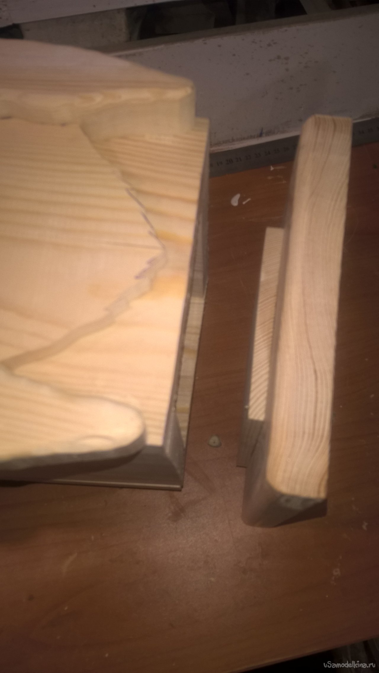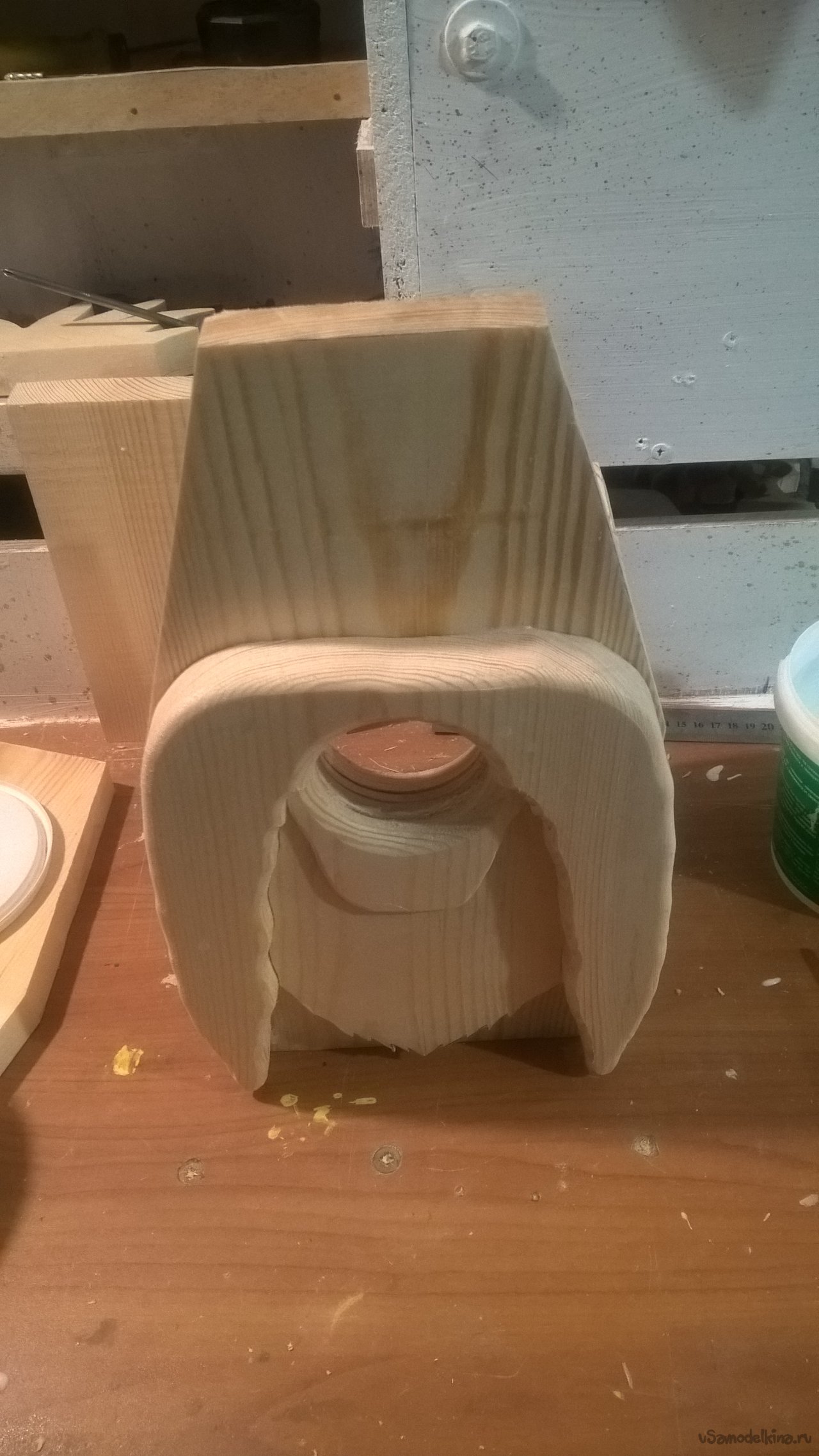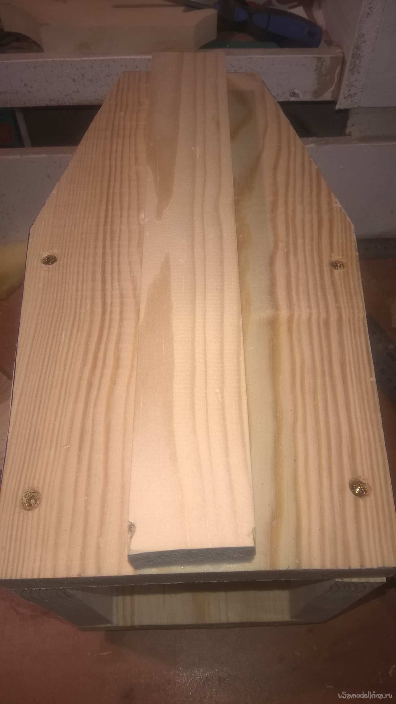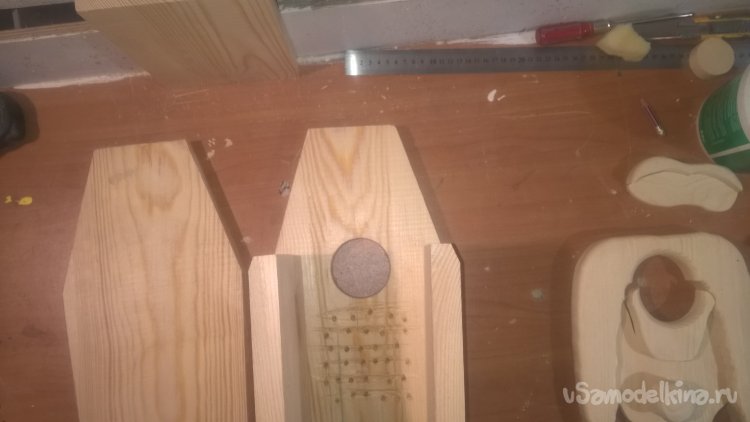 Потом наступил самый волнующий момент — сборка лица. Я разложил все детали на передней стенке, как пазл, двигая их, отходя, смотря со стороны. Сначала занял свое место нос. Потом под ним — борода. Бороду посадил на обильный слой клея, а для верности изнутри, в местах, которые потом закроются крышей и боковинами, притянул короткими саморезами.