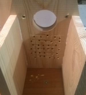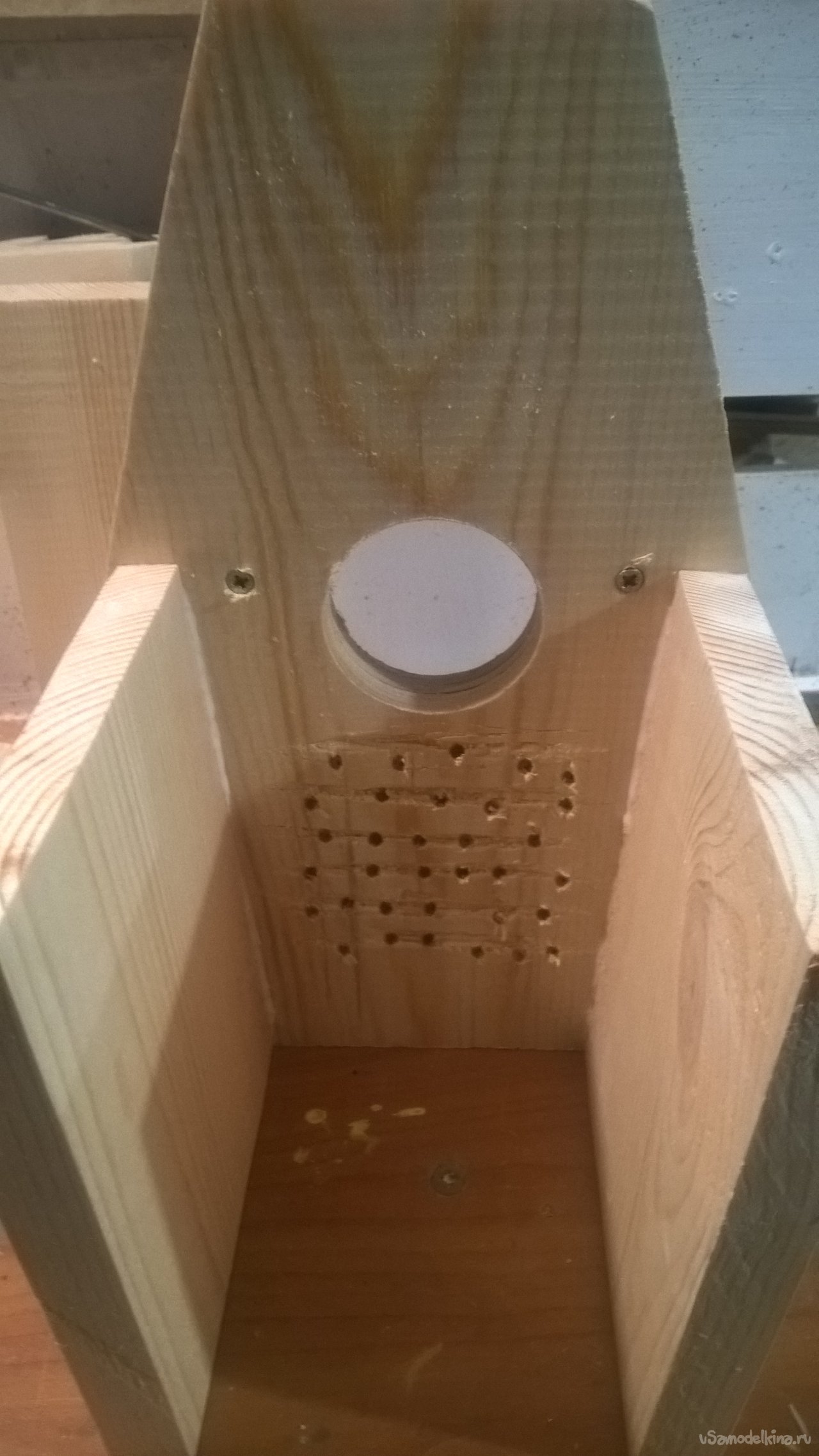 Самый ответственный момент — разметка и сверление летка. Я выбрал место классически: в верхней трети передней стенки. Отмерил от верха (не от верхней точки, а от воображаемой горизонтальной линии) примерно 18-20 см вниз до центра будущего отверстия. Это защитит птенцов от случайного выпадания и от дождя, если крыша будет с небольшим свесом. Я сверлил отверстие не спеша, давая стружке выходить, и когда кончик сверла только показался с обратной стороны, перевернул заготовку и досверлил с изнанки. Это гарантировало чистые края без сколов. Края летка я сразу зачистил фрезой и наждачкой.