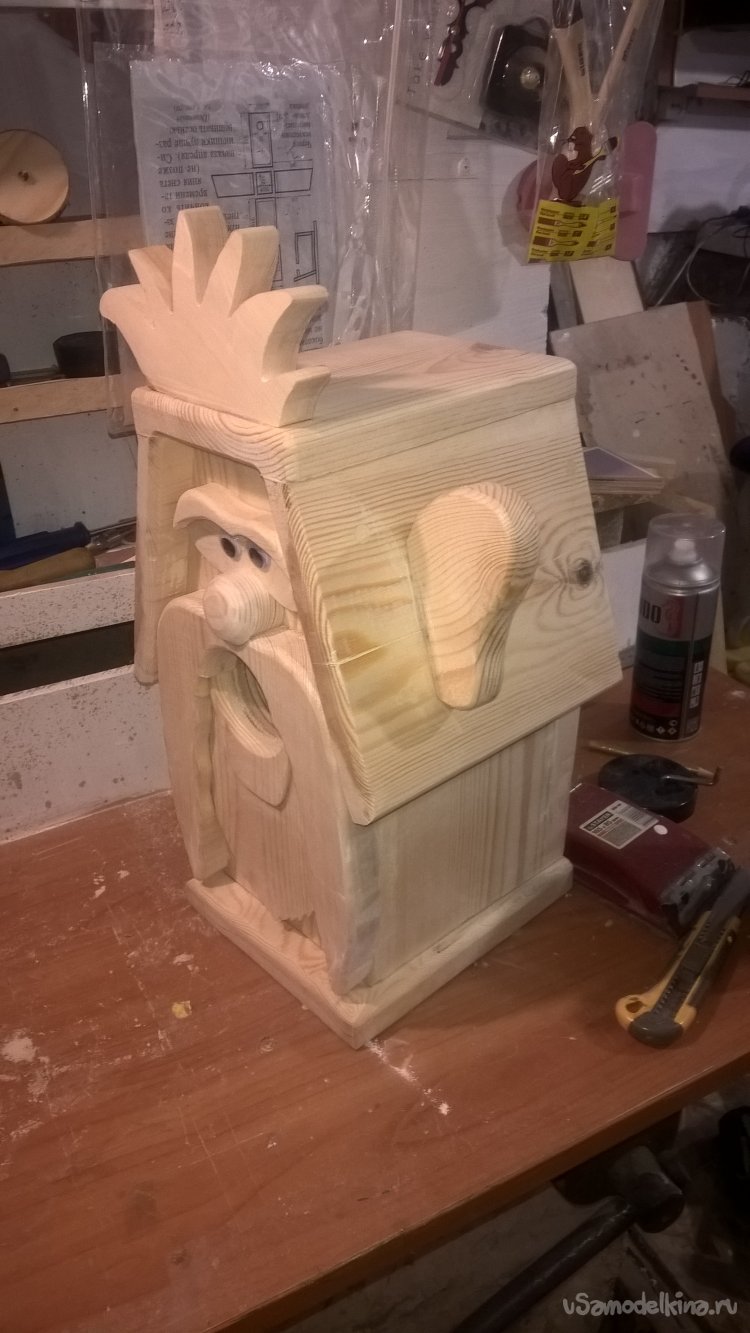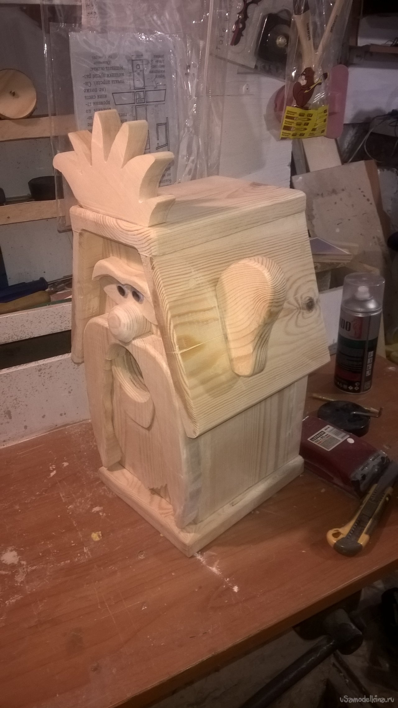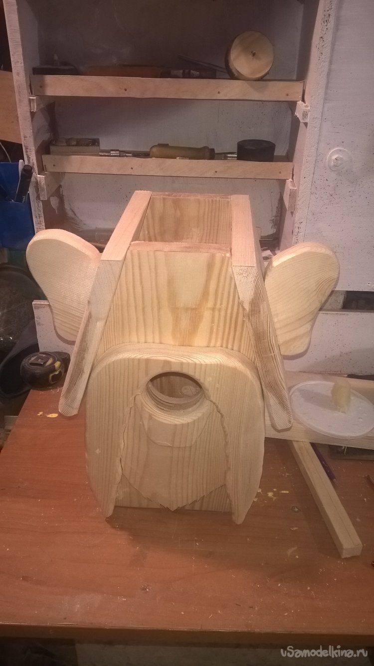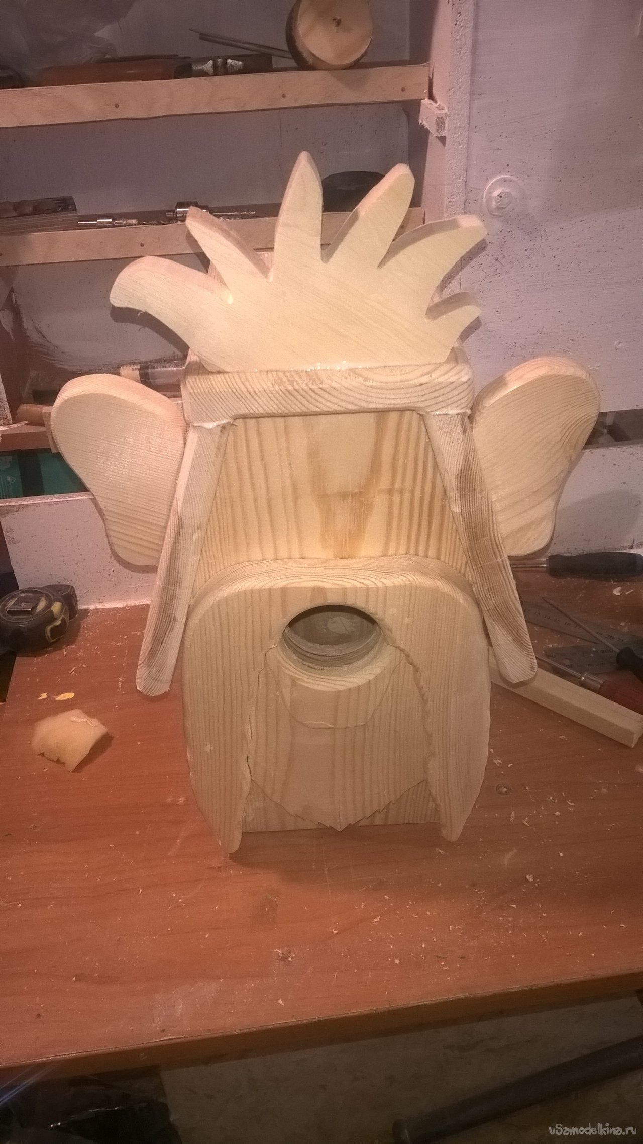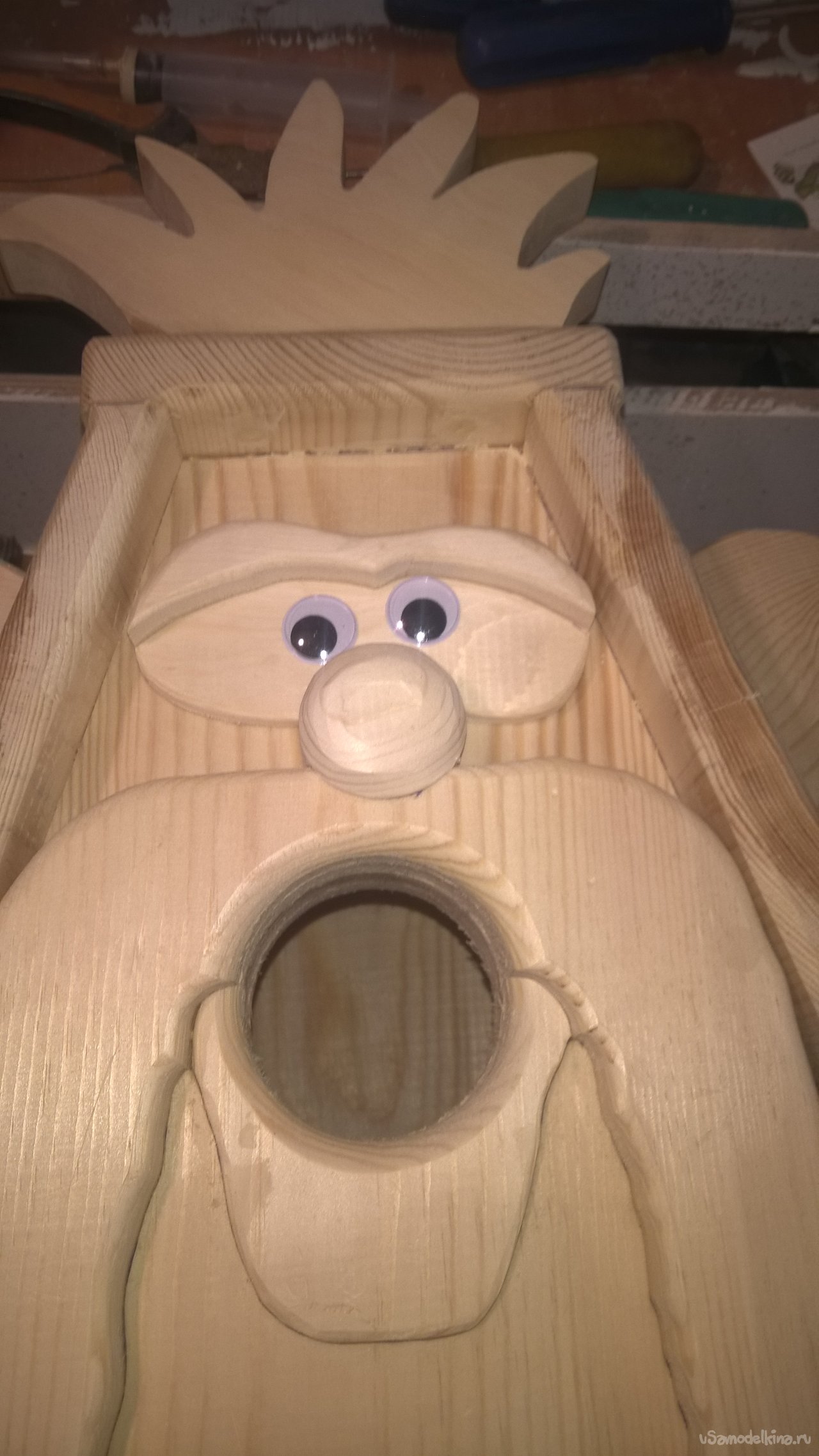 Для глаз я вырезал образ и вклеил в них покупные безопасные глазки для игрушек. Взгляд сразу стал живым и добрым. Уши и корону закрепил последними. Корону прикрутил к самой крыше, чтобы она была ее неотъемлемой частью. Крышу я сделал съёмной на двух длинных шурупах-осях, вкрученных изнутри в фронтоны и входящих в направляющие в крыше. Это проще и надежнее петель, и позволяет легко снять крышу для осенней чистки.