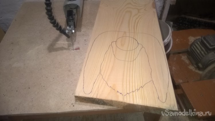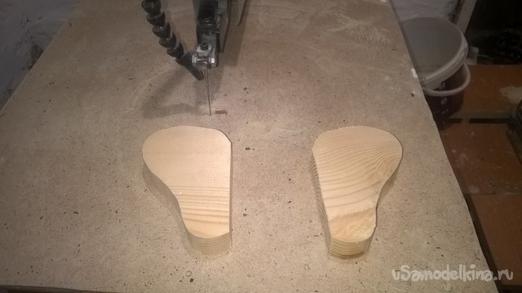 - Усы — штрих элегантности. Сделал их отдельно, в виде двух изогнутых серпов. Важно было сделать их симметричными. Я выпилил один, отшлифовал его, затем приложил к доске, обвел и выпилил второй. Их концы я чуть заострил.