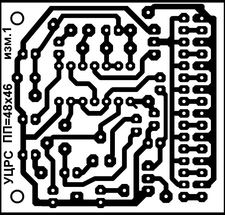 Печатная плата УЦРС выполнена из односторонне фольгированного гетинакса или стеклотекстолита размерами 48 х 46 х 2 мм (см. рисунки 02 и 03). Диаметр отверстий на печатной плате под микросхему - 0,7 … 0,8 мм, под остальные радиоэлектронные компоненты – 0,8 … 0,9 мм, под соединительные проводники – 1 … 1,2 мм., под крепёжные отверстия – 3,0 … 3,2 мм.