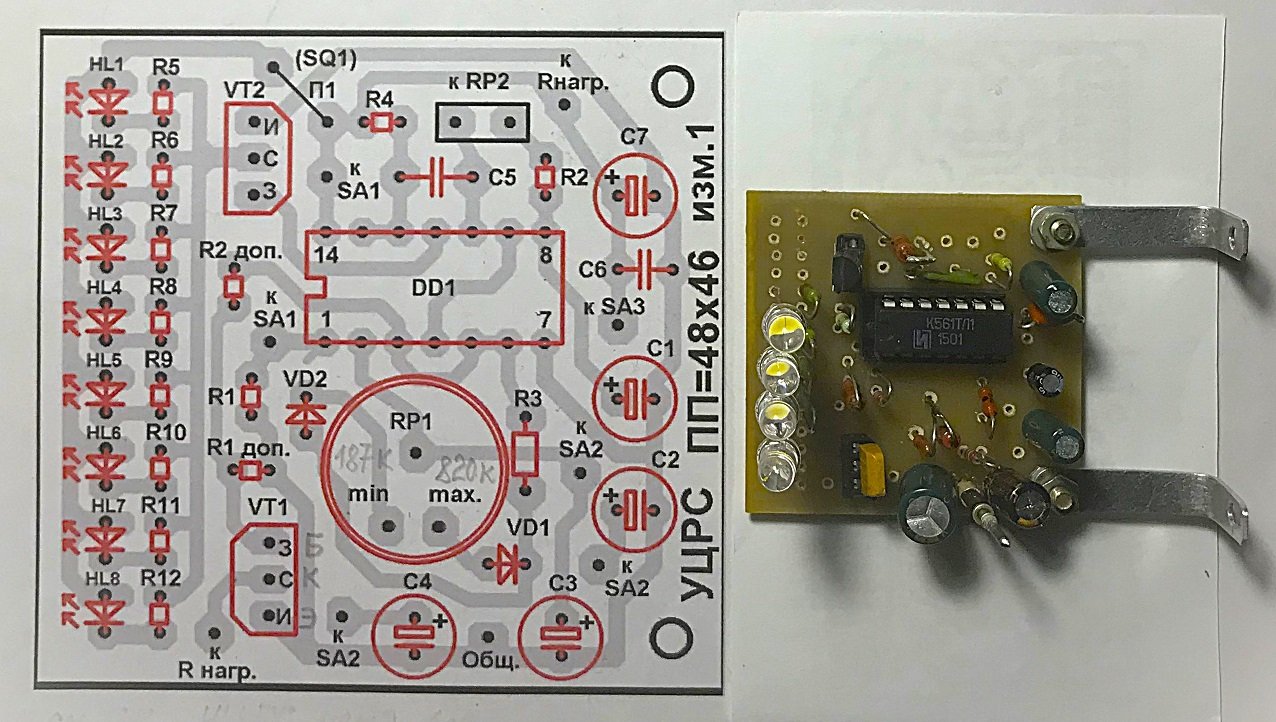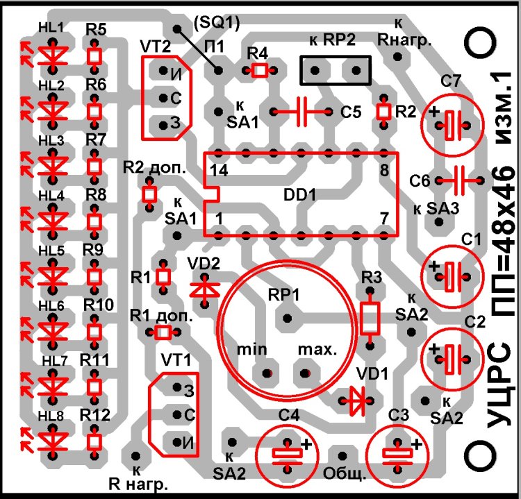 Яркость свечения HL1 … HL8 в УЦРС выбрана одинаковой – 20 мА. Однако если есть желание изменить яркость стробоскопа (некоторые LED допускают максимальный ток до 30 мА), то до впайки всех восьми резисторов R5 … R8 в плату достаточно проверить рабочий ток для одного светодиода. Вроде бы само собой разумеющееся решение, но иногда «хорошая мысля приходит апосля» (когда резисторы «не тех» номиналов уже впаяны в плату). Транзистор VT2 одинаково стабильно работает как с одним, так и с 8 светодиодами. Более того, КП505А имеет максимальный ток стока 1,4 Ампера и при коэффициенте нагрузки по току = 0,7, может коммутировать ток 0,98 Ампера, то есть количество светодиодов может быть пропорционально увеличено. Максимальное количество светодиодов, включённых параллельно, может достигать 49 штук.