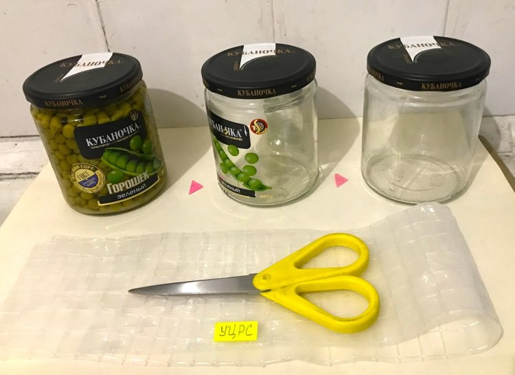 Купленную банку с горошком освобождают от продукта. Этикетку медленно отлепляют со стеклянной поверхности банки. Остатки клея отмывают ветошью, смоченной спиртом или ацетоном 647 (проветривать!!!). Можно также воспользоваться, например, средством «Океан» для чистки и мытья стекол и зеркал. Очищенную банку высушивают. Для увеличения скорости сушки можно воспользоваться феном.