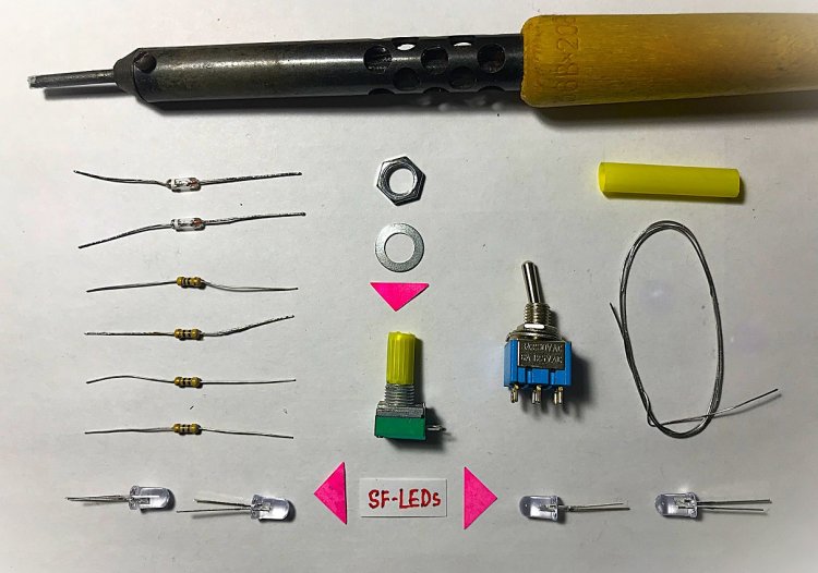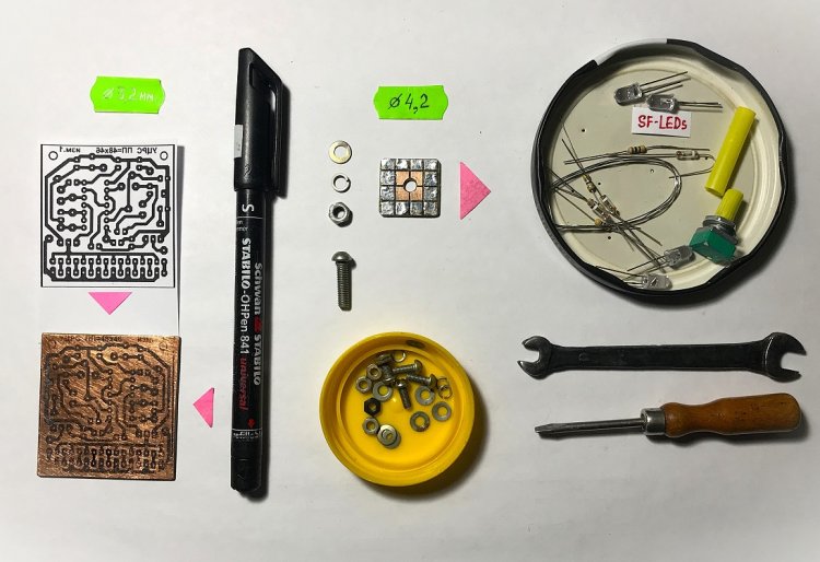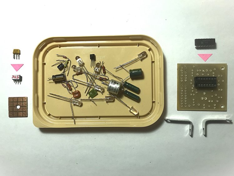 Детали, предназначенные для ЦМУ (более крупным планом): Д9Д х 2 штуки, 4 резистора 0,25 Вт, 4 SF-LEDs «Перелив»... «Ручка» потенциометра сделана из отрезка жёлтой коктейльной трубки диаметром 6,5 мм. Кстати, не все SF-LEDs из упаковки в 50 штук оказались целыми! Из 10 проверенных один светился только красным цветом и не переливался, а второй просто перестал светиться. Так что прежде, чем впаять их в схему, рекомендуется проверить их работоспособность и желательно после облуживания (с пинцетом - теплоотводом).