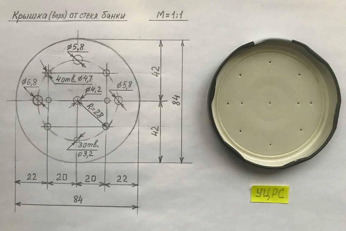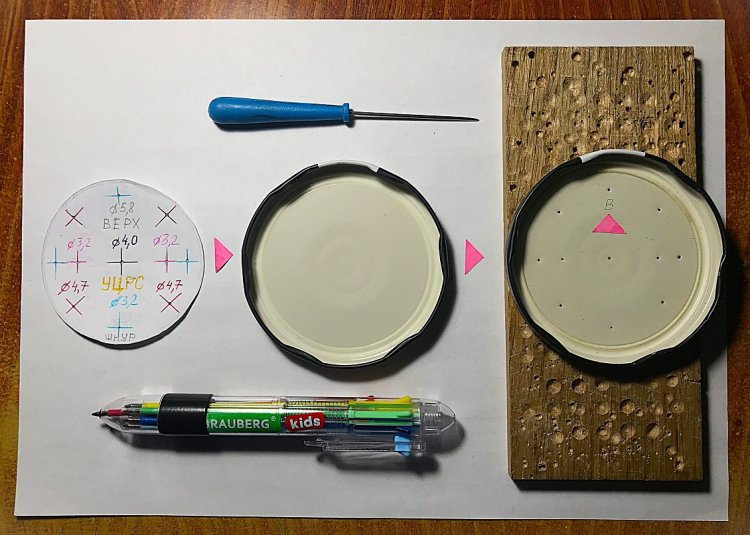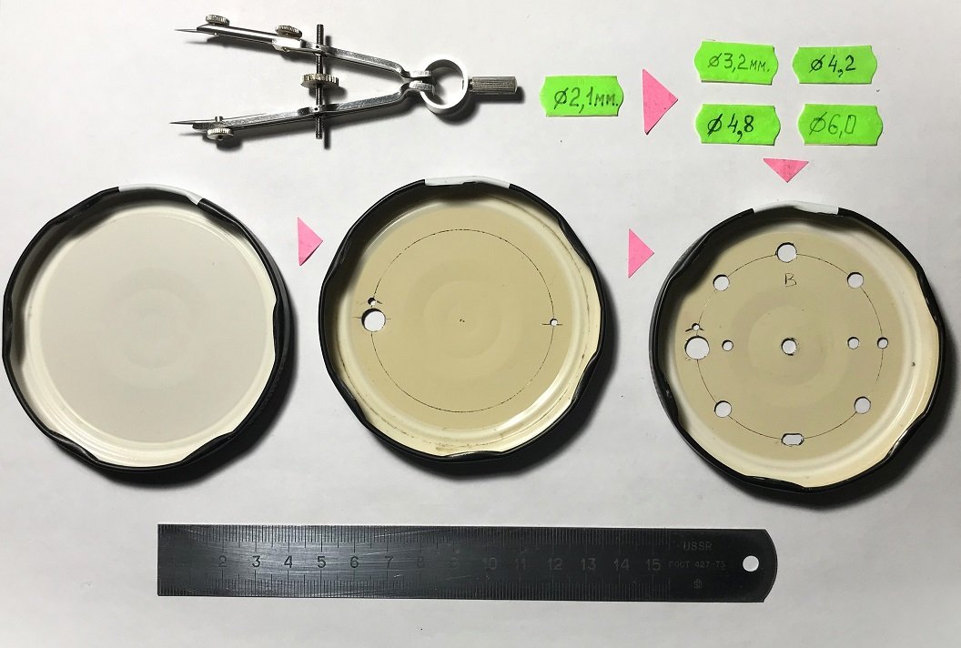 Разметку центров отверстий на крышке удобнее (и точнее получится) сделать по цветному бумажному трафарету.