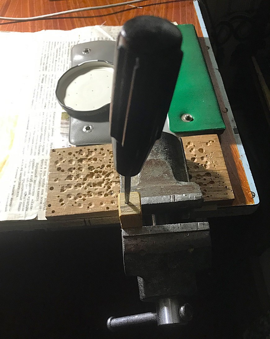Для проделывания дополнительного отверстия в уже собранной крышке, в слесарные тиски в вертикальном положении зажат деревянный брусок сечением 16х16 мм. Левой рукой удерживаем крышку на бруске. А правой рукой (толстым шилом) делаем в крышке вытянутое отверстие. Для шнура питания получится своеобразный нипель. Внутрь шнур вставить легко, а обратно лучше не вынимать. Ход шнура питания внутрь крышки ограничен 4-5 витками жёлто-зелёной изоленты.