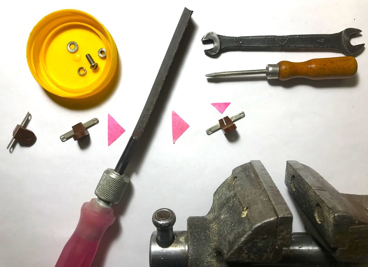 Оба лепестка с двух сторон коричневого пластмассового держателя лепестка имеют сопротивление 0 Ом. То есть это единый лепесток. Для крепления вводимого в корпус-крышку шнура питания необходимо два электрически разделённых лепестка. Держатель зажимается в слесарные тиски и распиливается приблизительно до половины высоты держателя. При этом лепесток оказывается полностью разделённым. Т.е. один лепесток превращается в два независимых лепестка (для выводов «+» и «-») шнура питания. Для возвращения былой механической прочности держателя, пропиленный паз заливают эпоксидной смолой. Для большей прочности - желательно с порошкообразным наполнителем.