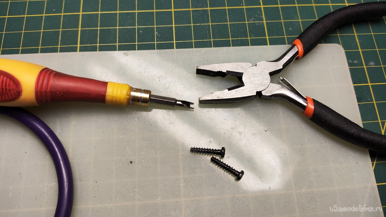 С чего начать разборку? Осмотр привел к двум саморезам на ручке. Попробуем начать с них.