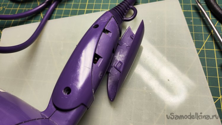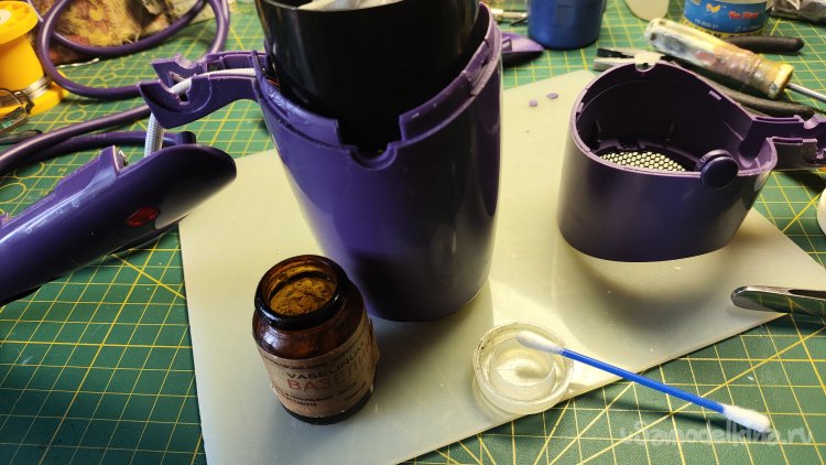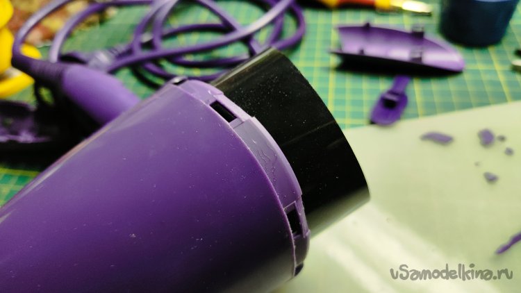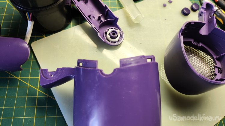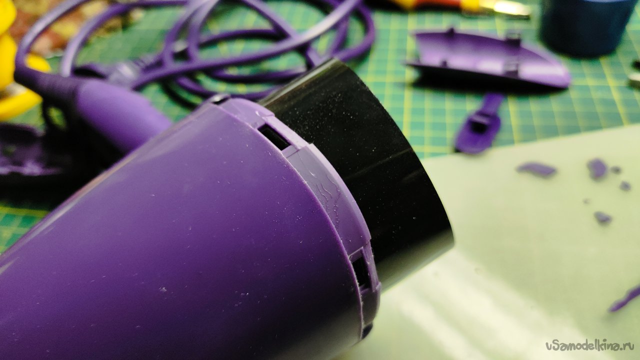 Располовиниваю корпус горячей части фена. Внутри до сих пор осталось липкое покрытие. Руки моментально начинают липнуть после контакта с этим покрытием.