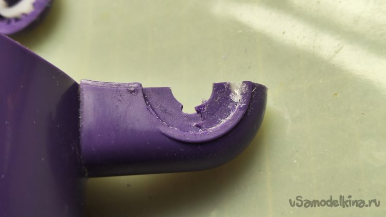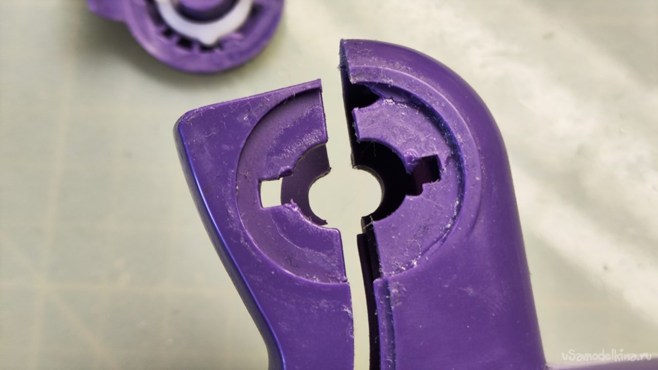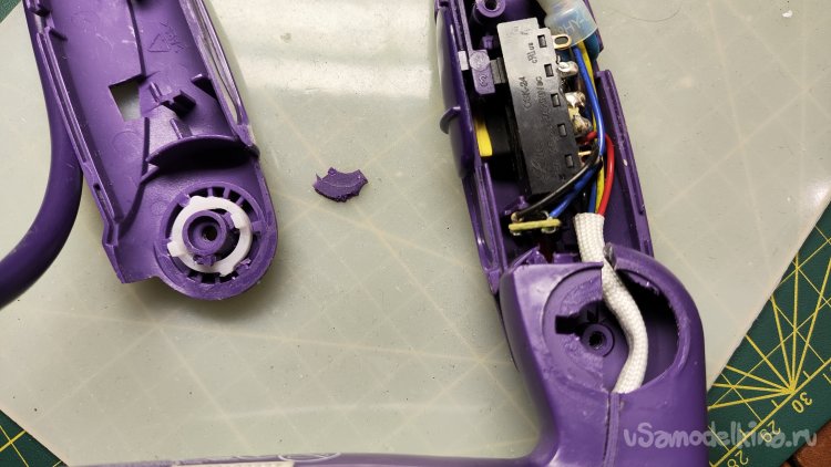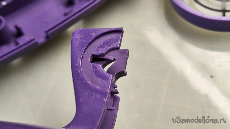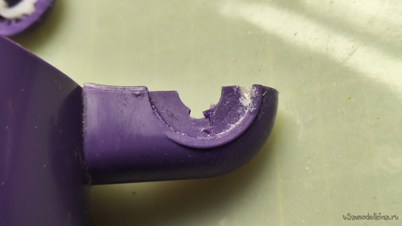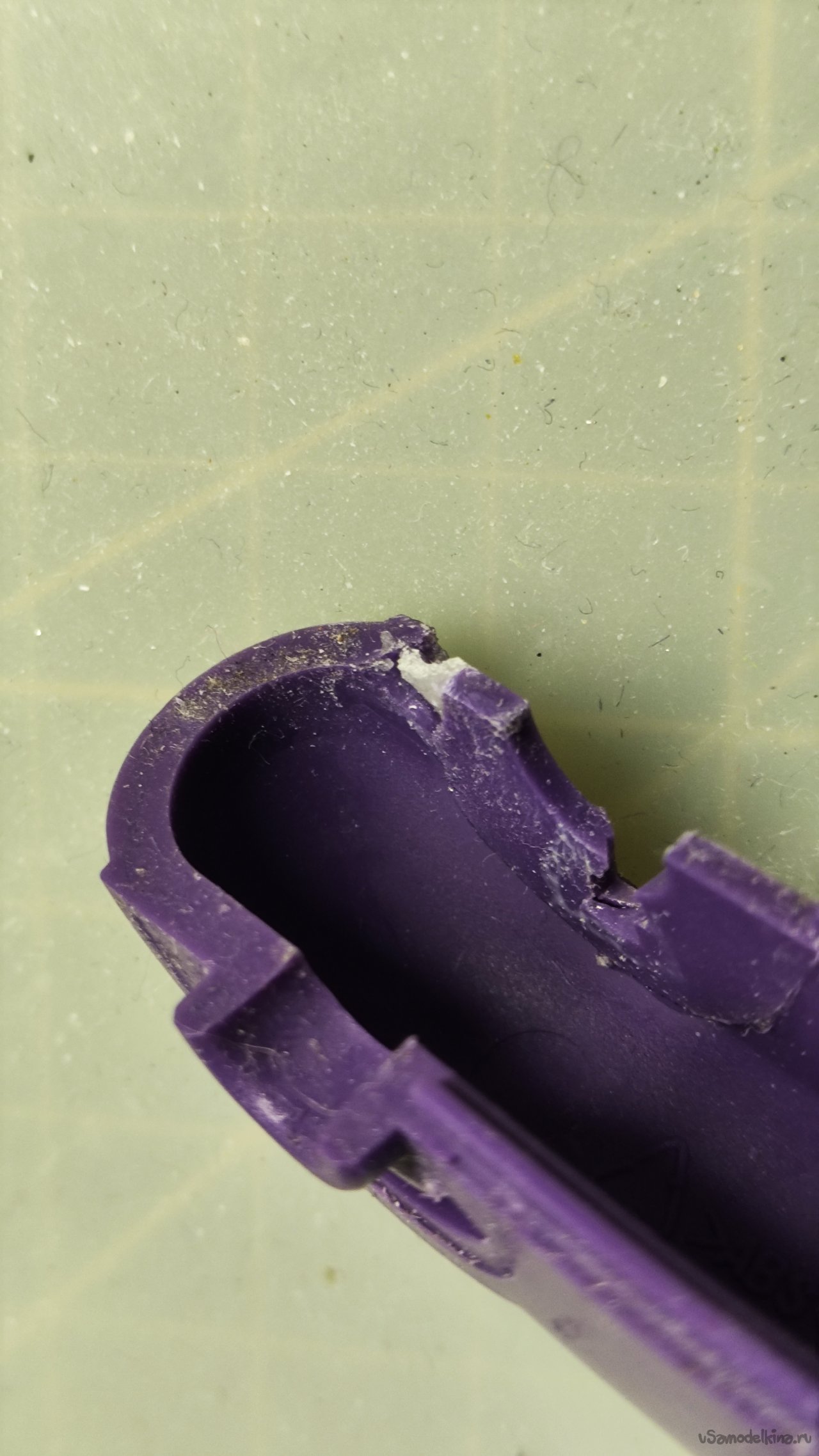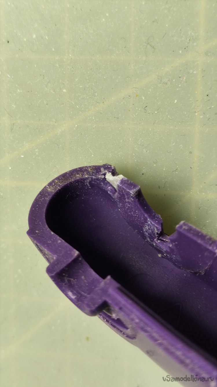 Ручка располовинена. Сразу обнаружились мелкие отколотые кусочки пластика.