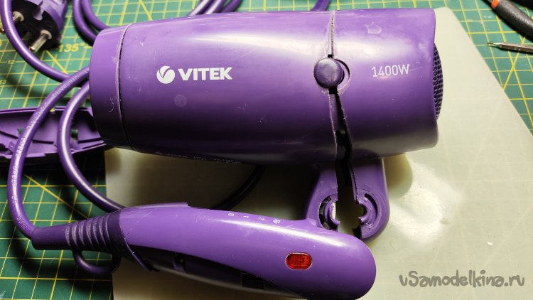 На корпусе отсутствуют куски пластика. Возможно, фен когда-то роняли. Но больше похоже на деградацию пластика.