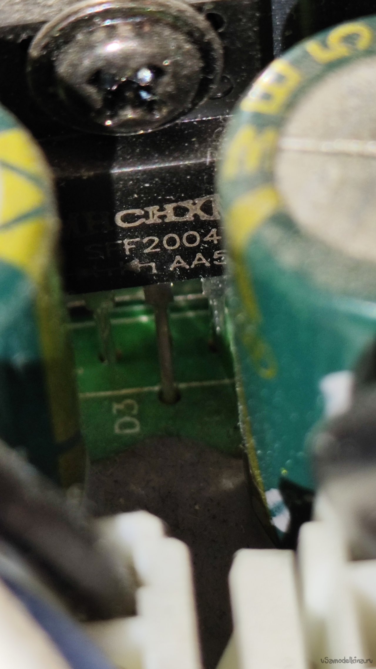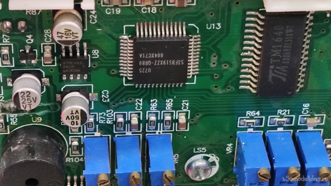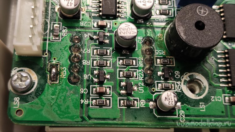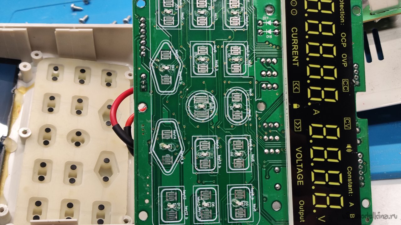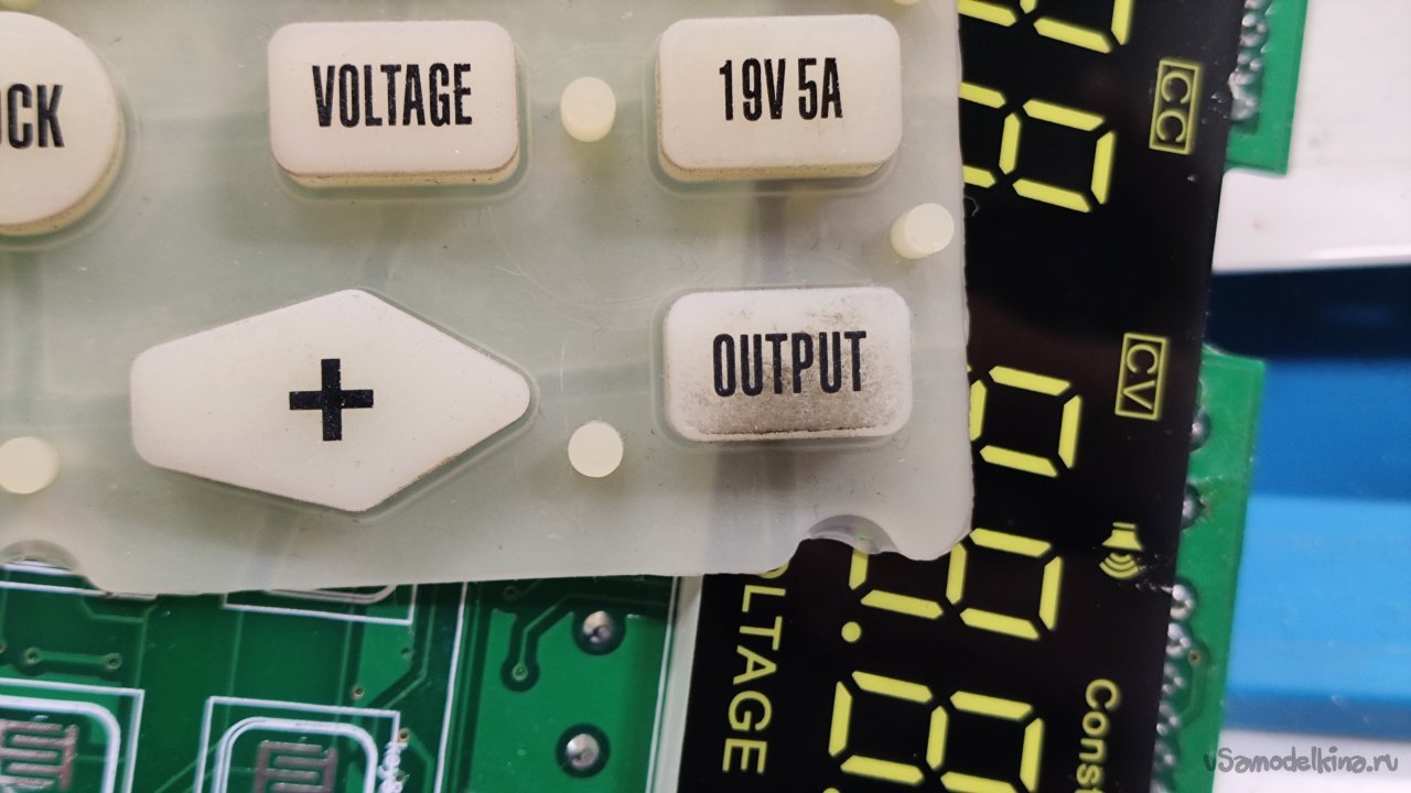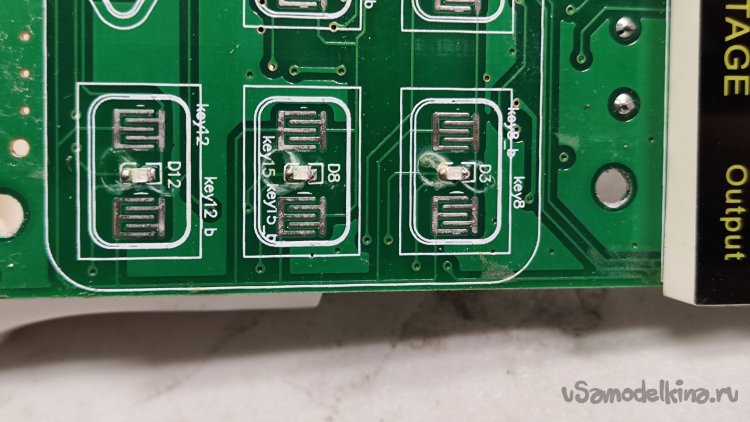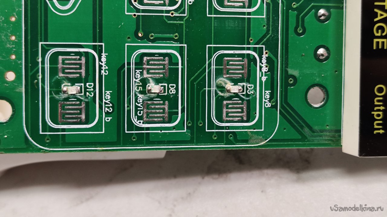 Нам надо добраться до кнопки включения выхода. Выкручиваю восемь саморезов, которыми прикручена плата передней панели. Обратная сторона платы. Здесь флюс тоже не отмыт.