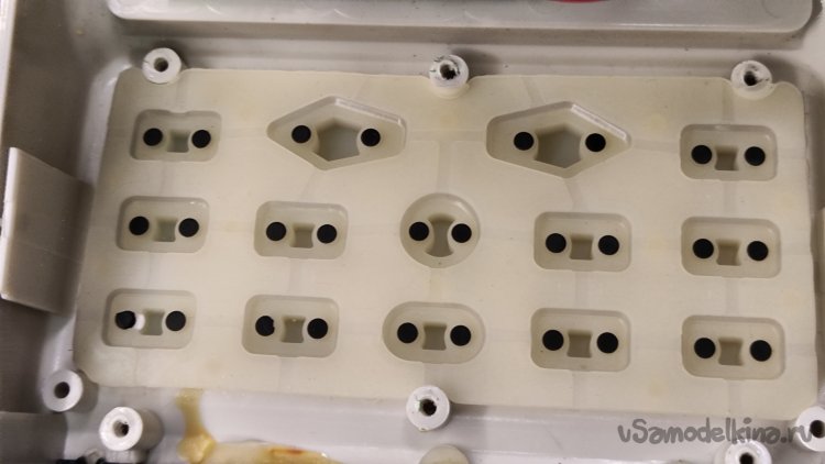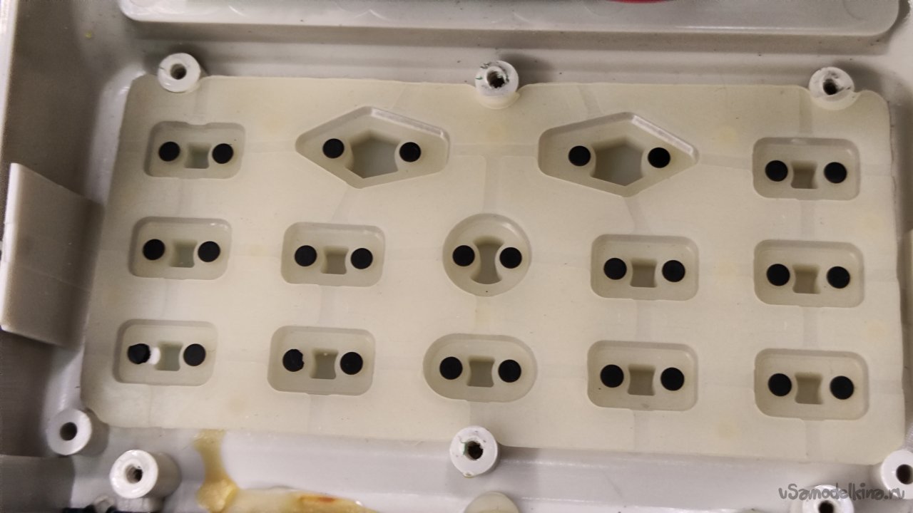Протер контакты кнопок на плате ветошью, смоченной спиртом. Контактные графитные пятачки кнопки протер сухой чистой ветошью. Почистил грязные кнопки с лицевой стороны ветошью со спиртом, протек корпус. Собрал переднюю панель для проверки. Кнопка стала нажиматься намного лучше. Не так, как новая, но близко. Возможно, надо было немного зачистить контакты на плате мелкой наждачной бумагой. Не захотелось опять выкручивать восемь соморезов. И так получилось хорошо. Проверил остальные кнопки, все работают, мусор под них не попал, хуже я не сделал.