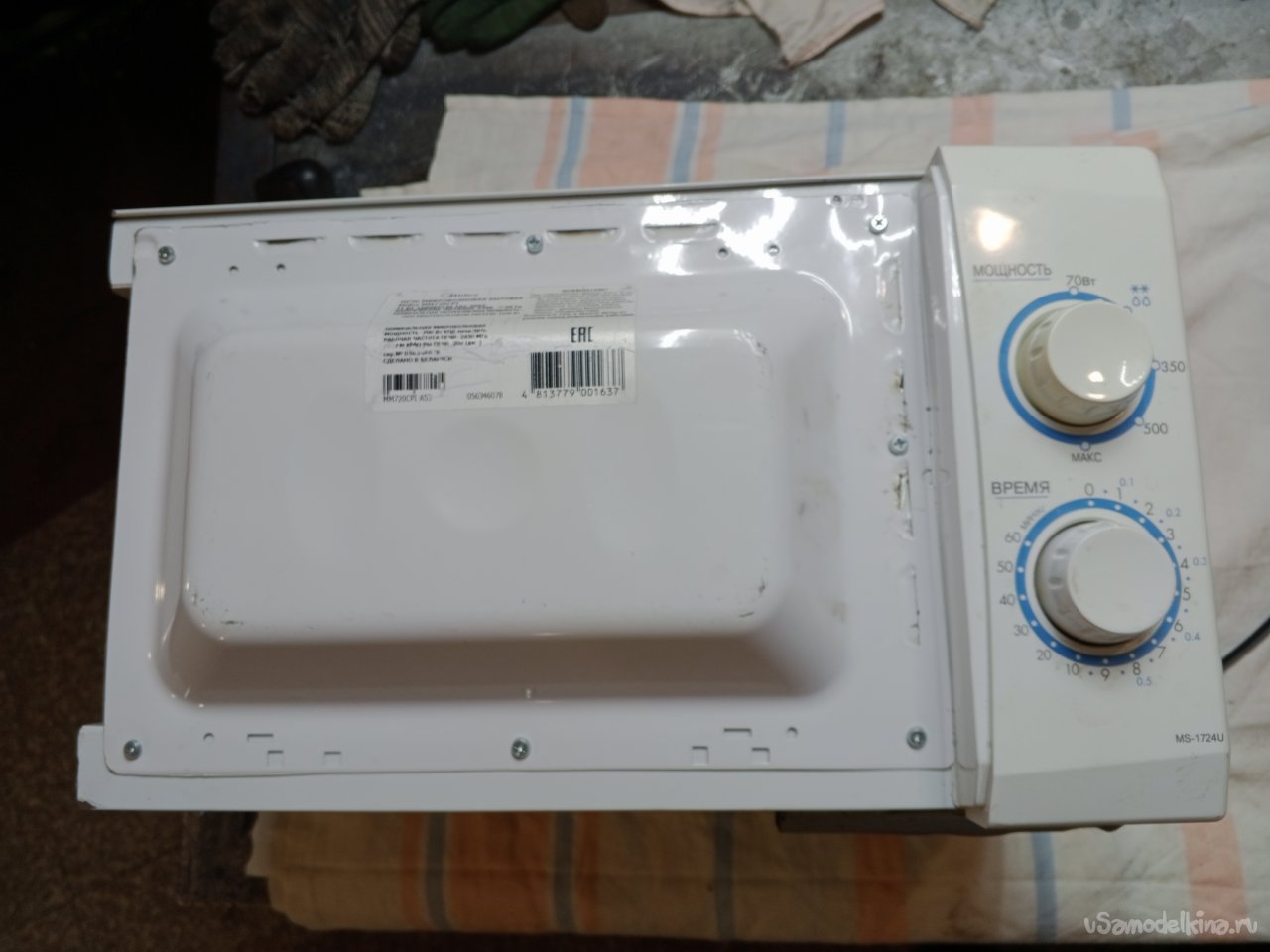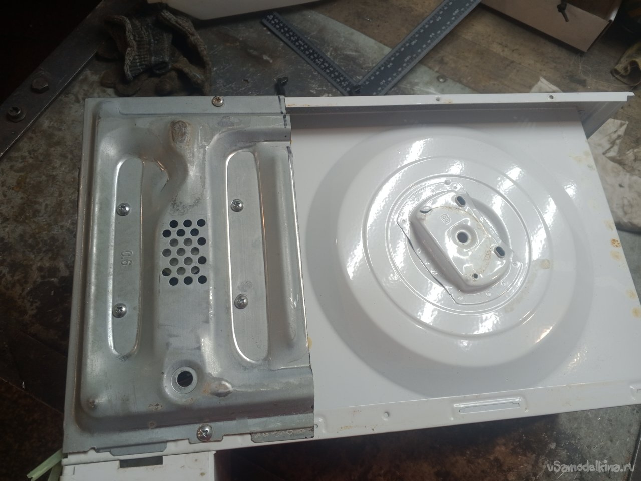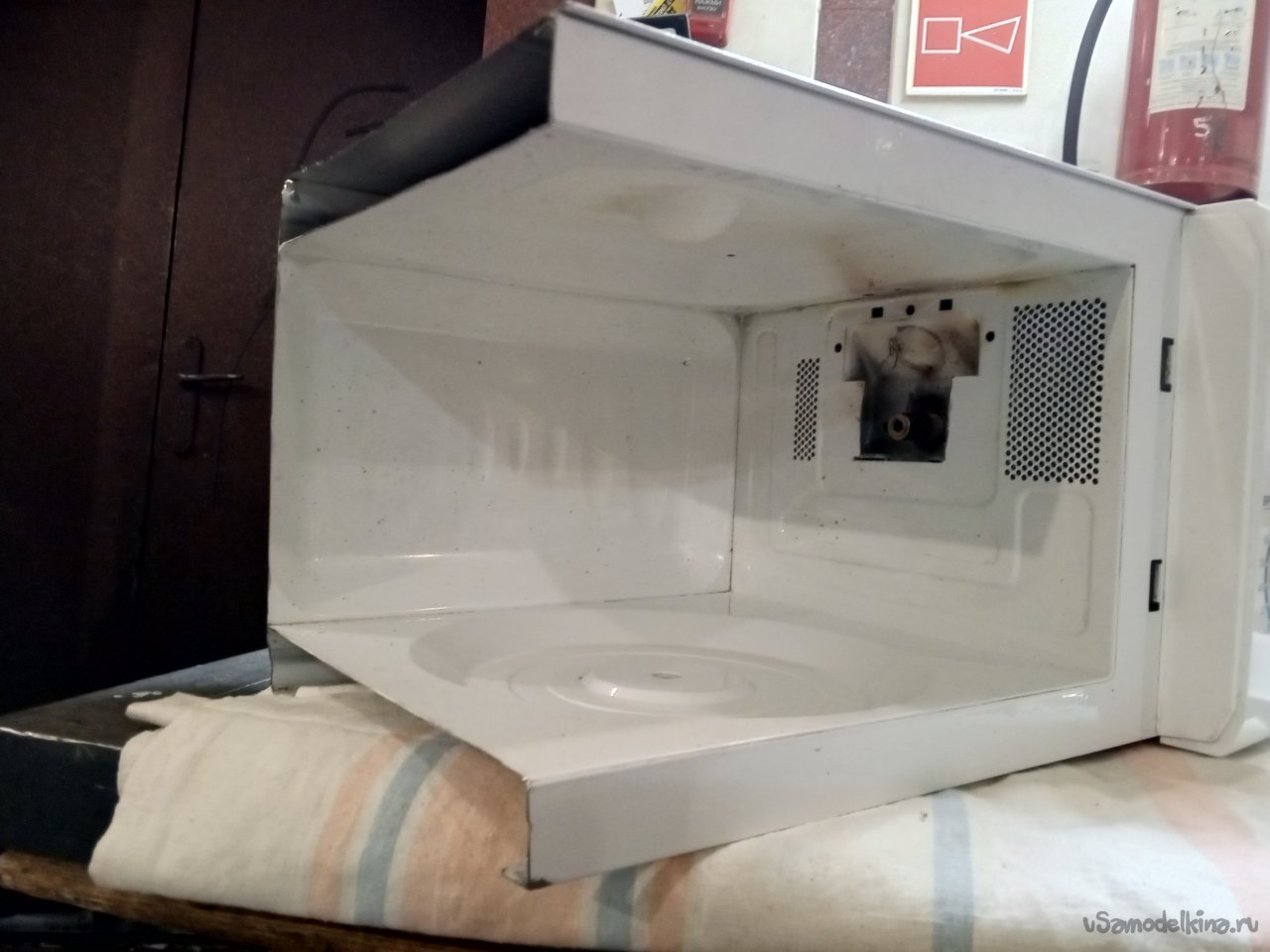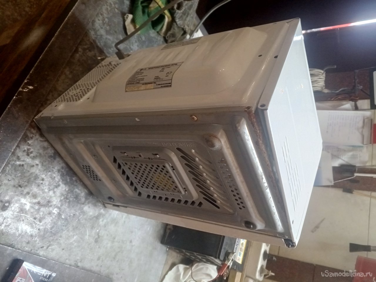 Давно валялась сгоревшая микроволновка, причины ее поломки были визуально видны и разбирать я ее стал не задумываясь, а не включать в розетку и смотреть что будет, вскрытие покажет. Еще имелись запчасти от другой микроволновки, уже разобранной. Разборку расписывать не буду, все логически понятно, единственное, для ускорения, банально спилил УШМкой петли дверцы и отрезал кусок задней внешней стенки, оставив часть, на которую крепится электрическое «нутро».