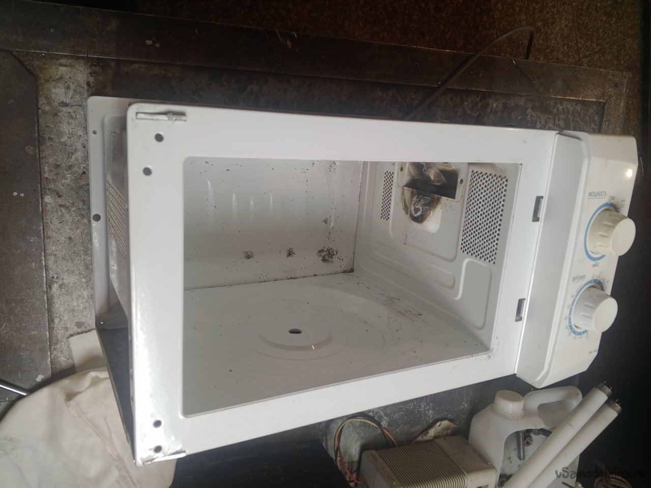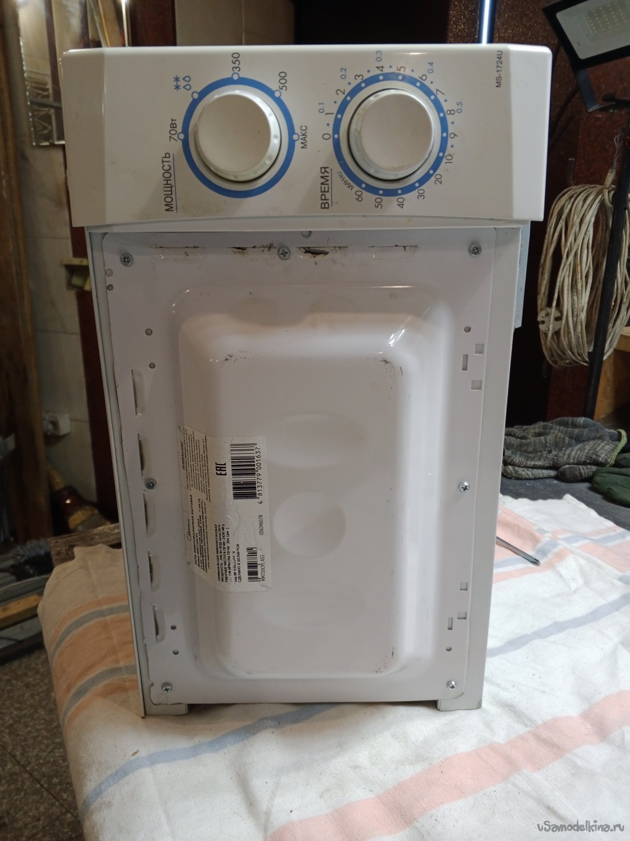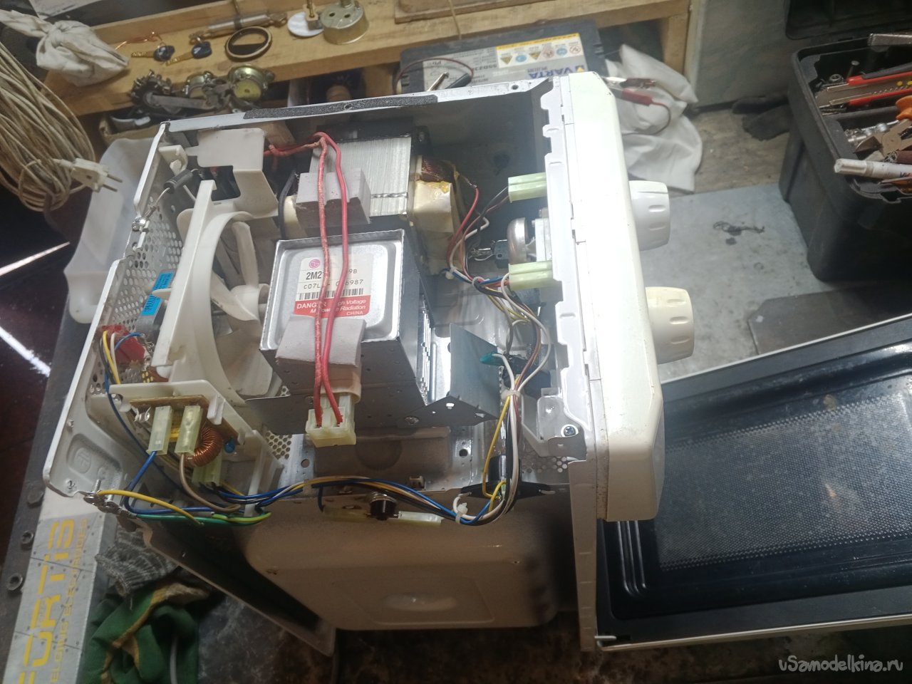 Давно валялась сгоревшая микроволновка, причины ее поломки были визуально видны и разбирать я ее стал не задумываясь, а не включать в розетку и смотреть что будет, вскрытие покажет. Еще имелись запчасти от другой микроволновки, уже разобранной. Разборку расписывать не буду, все логически понятно, единственное, для ускорения, банально спилил УШМкой петли дверцы и отрезал кусок задней внешней стенки, оставив часть, на которую крепится электрическое «нутро».