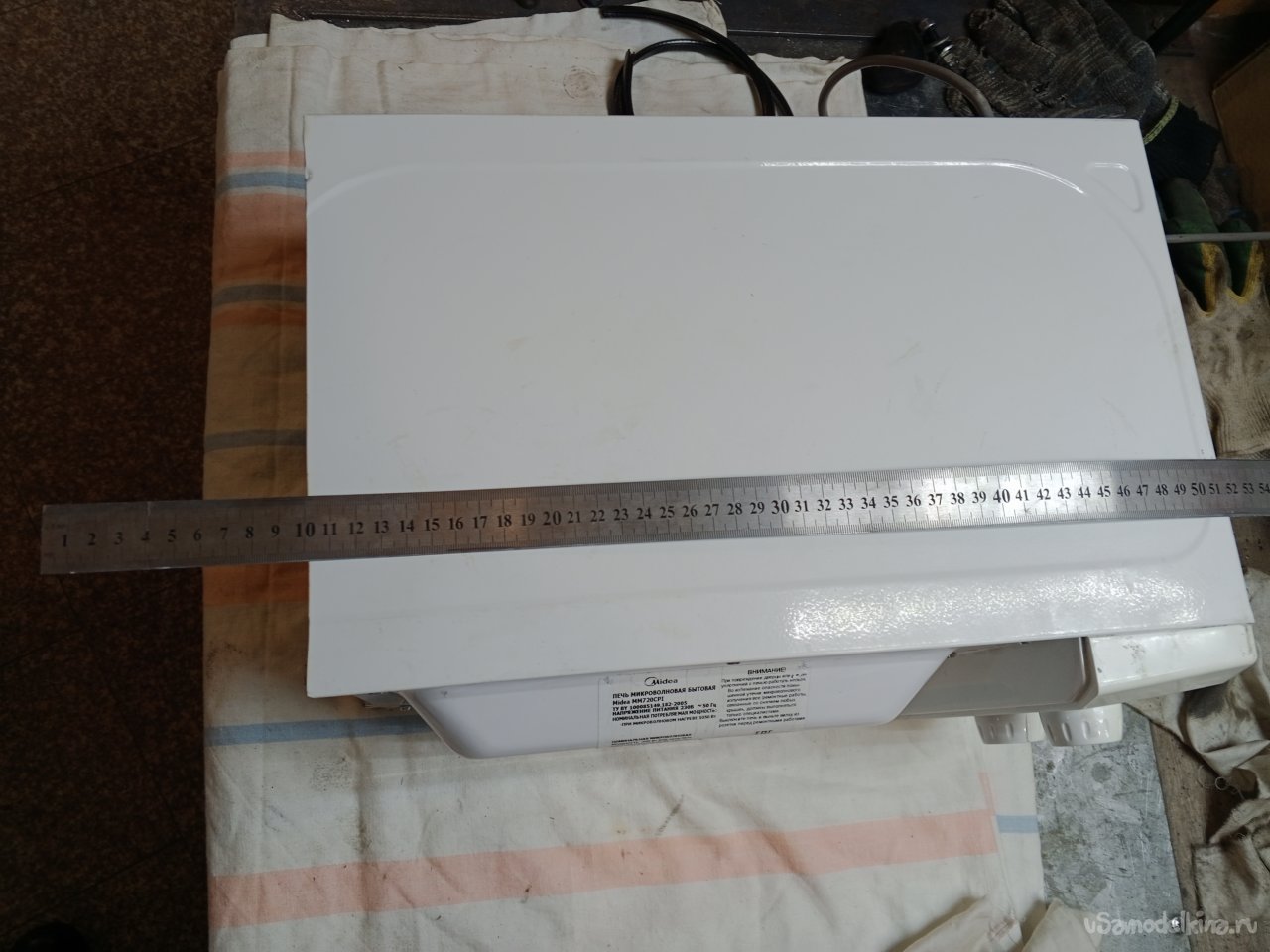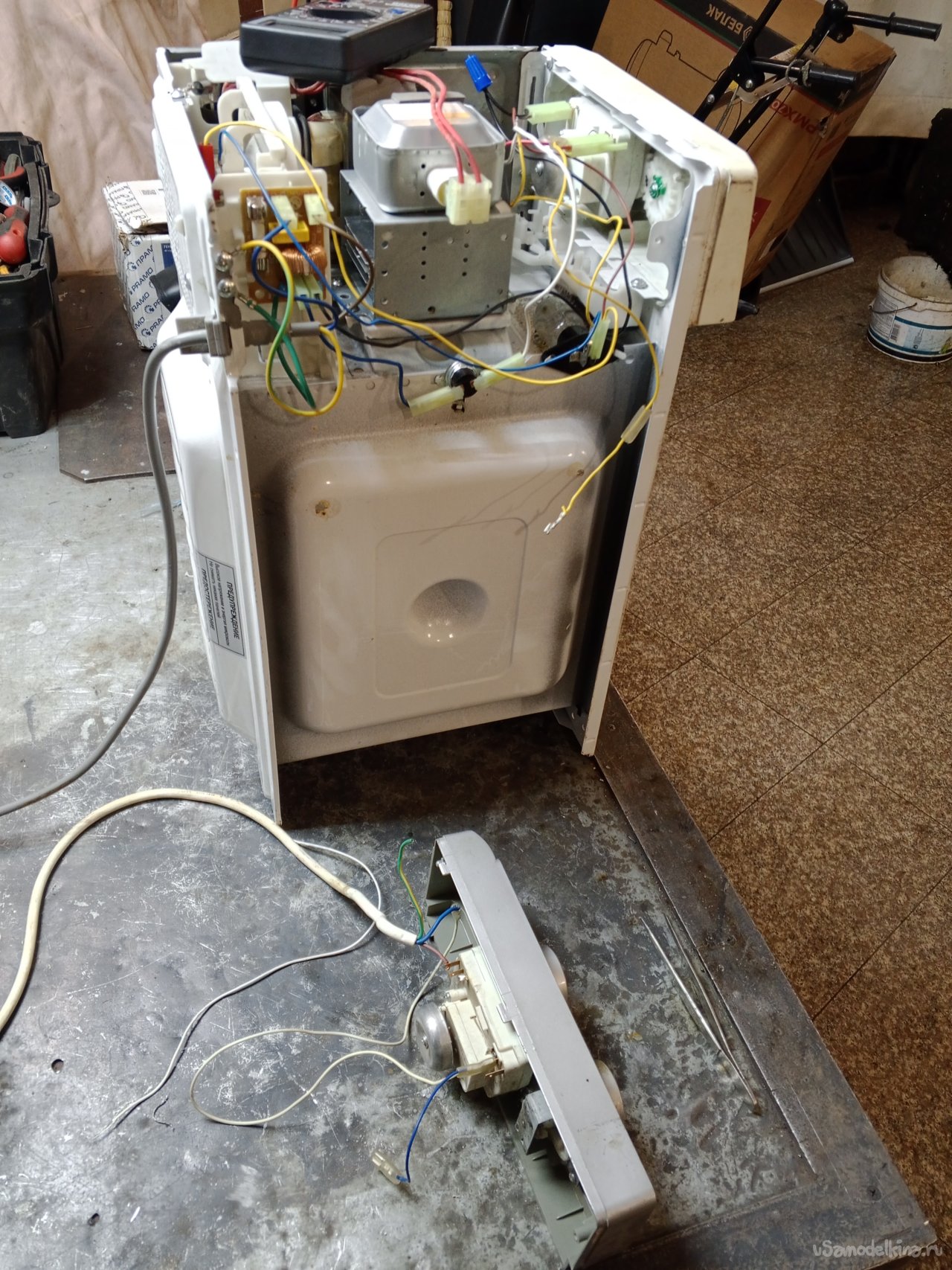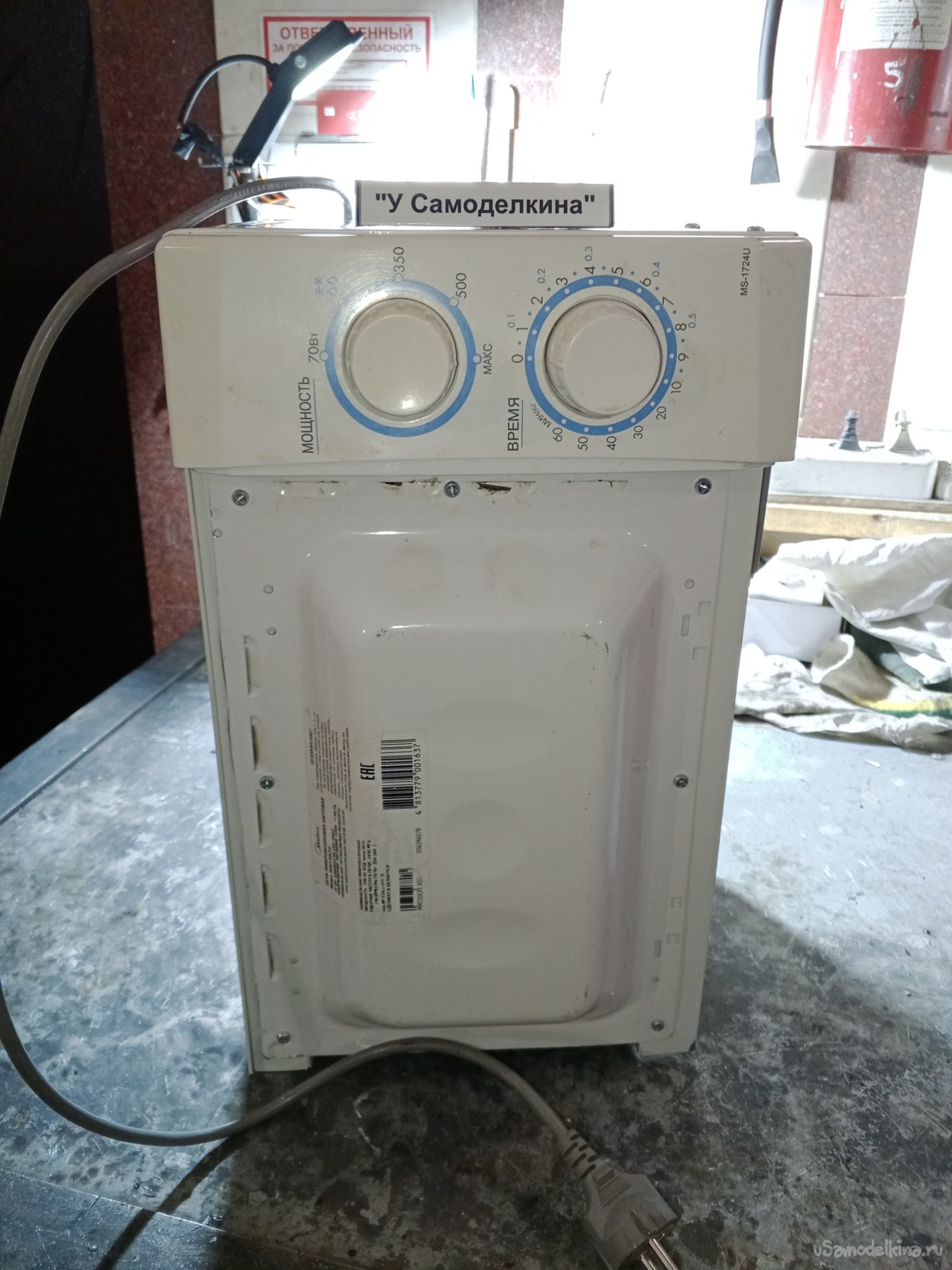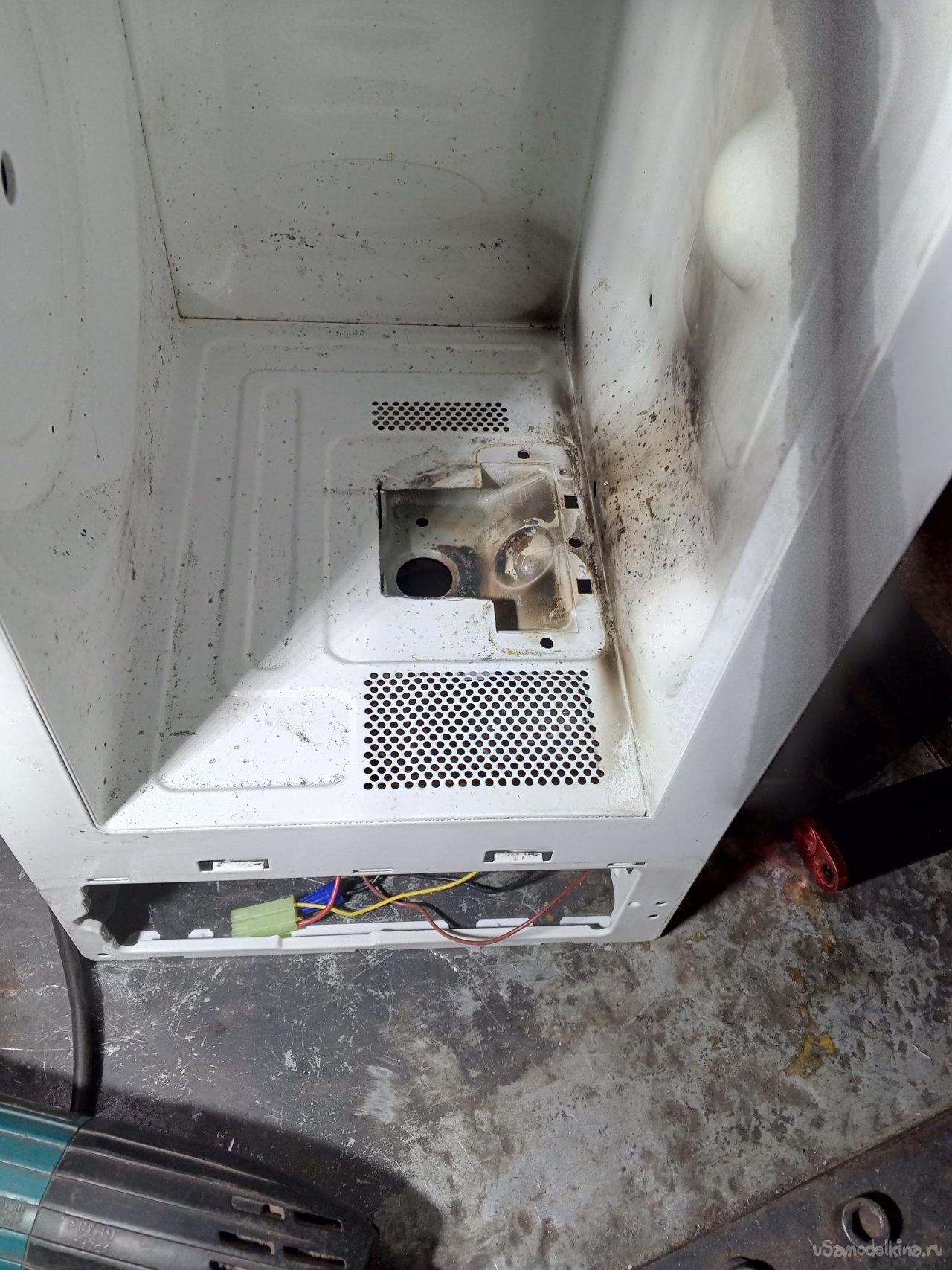 Давно валялась сгоревшая микроволновка, причины ее поломки были визуально видны и разбирать я ее стал не задумываясь, а не включать в розетку и смотреть что будет, вскрытие покажет. Еще имелись запчасти от другой микроволновки, уже разобранной. Разборку расписывать не буду, все логически понятно, единственное, для ускорения, банально спилил УШМкой петли дверцы и отрезал кусок задней внешней стенки, оставив часть, на которую крепится электрическое «нутро».
