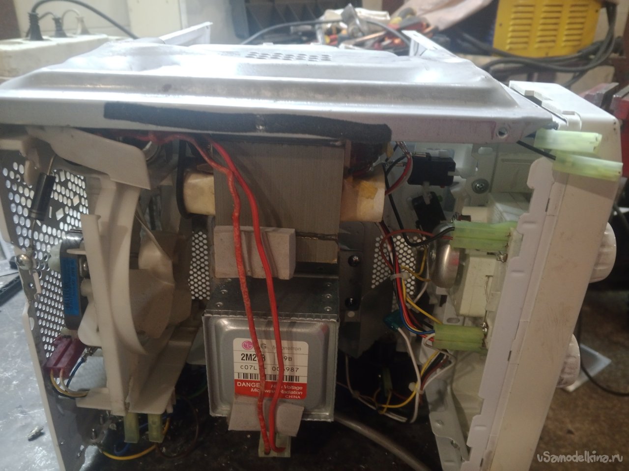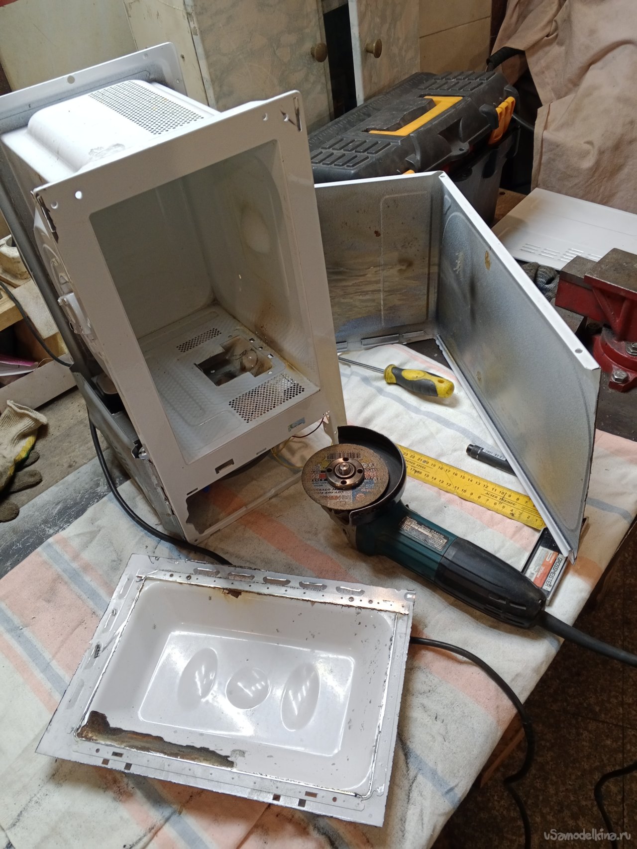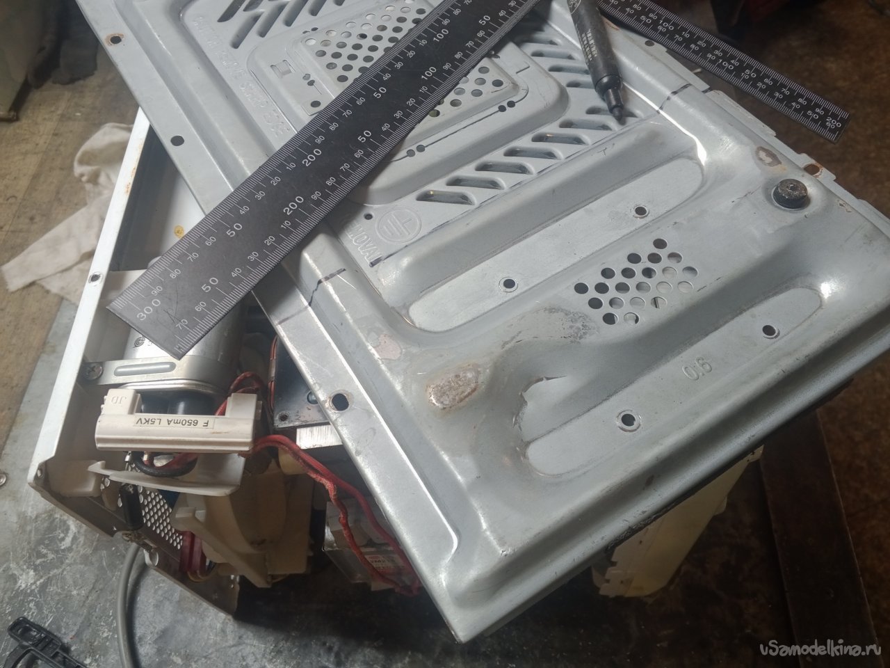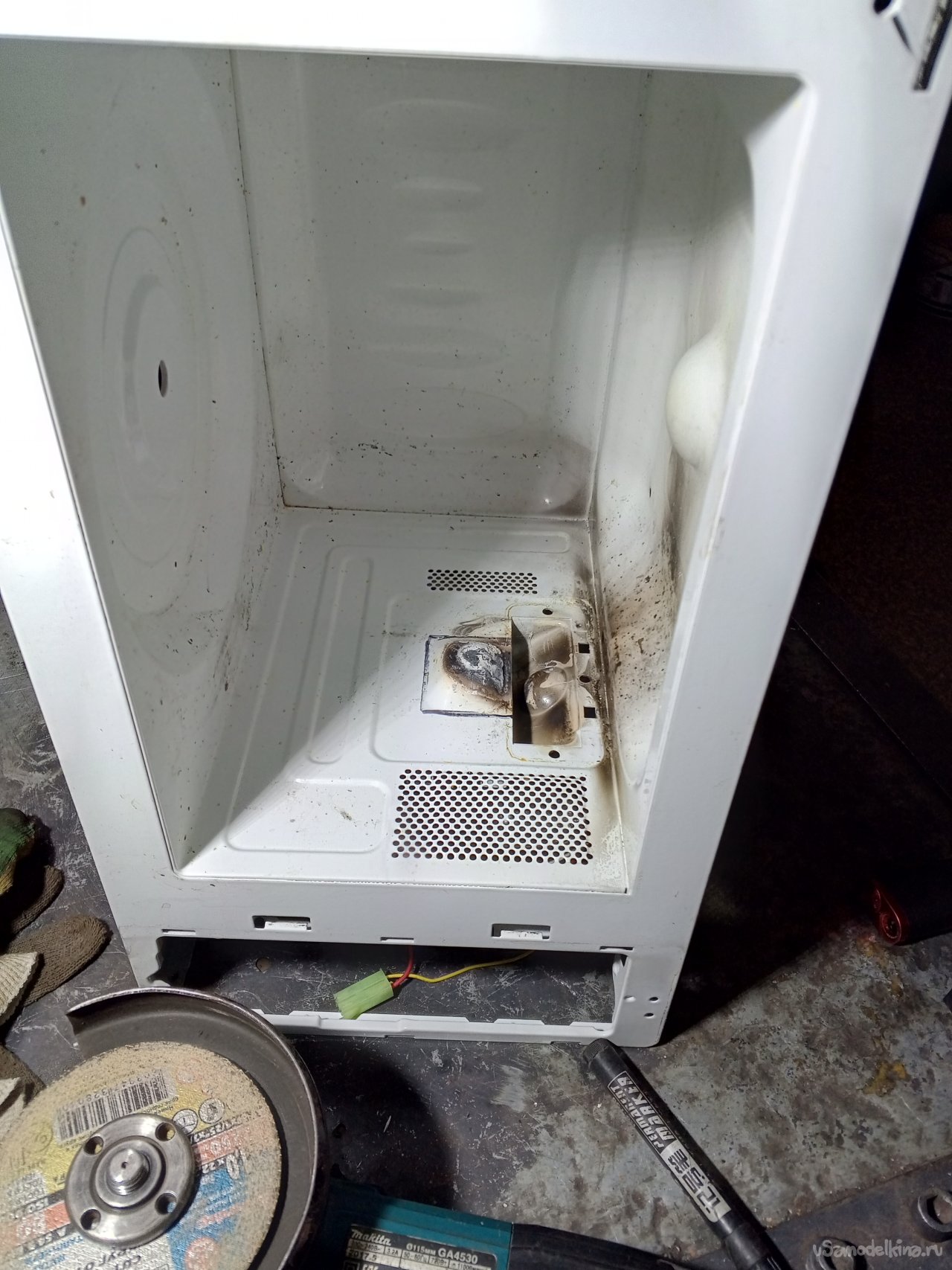 Начал перекраивать внутренний корпус микроволновки. Так как работы будут проводиться при помощи УШМ, образуются мелкие частицы металла при резке. Магнетрон конструктивно имеет два неплохих магнита и часть металлической стружки будет просто намагничивается на них. На этот этап работ магнетрон был снят. Так же был снят блок управления.