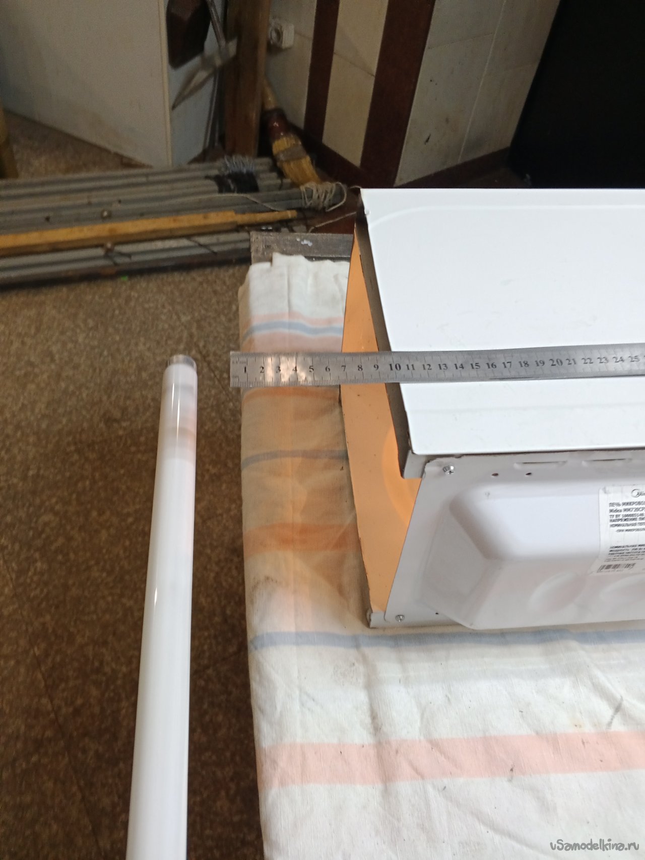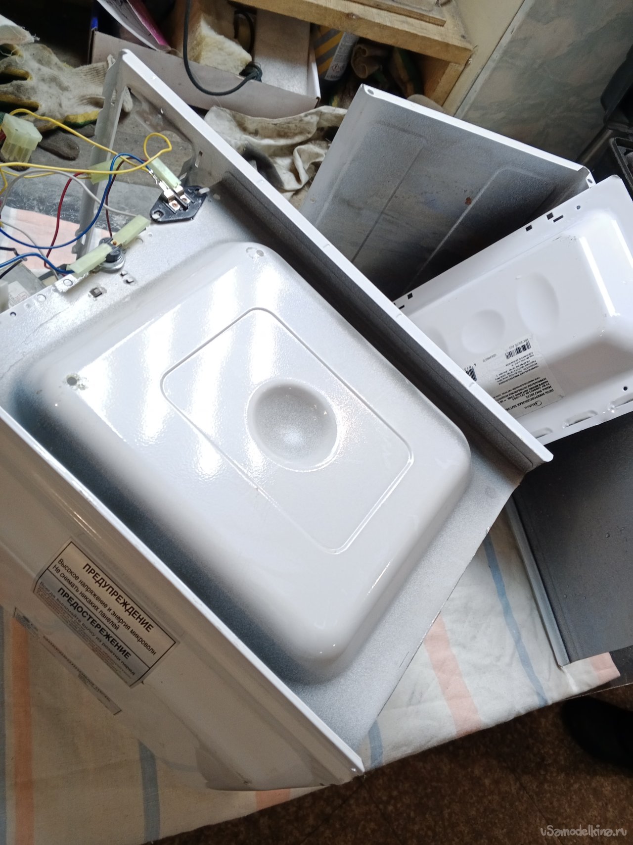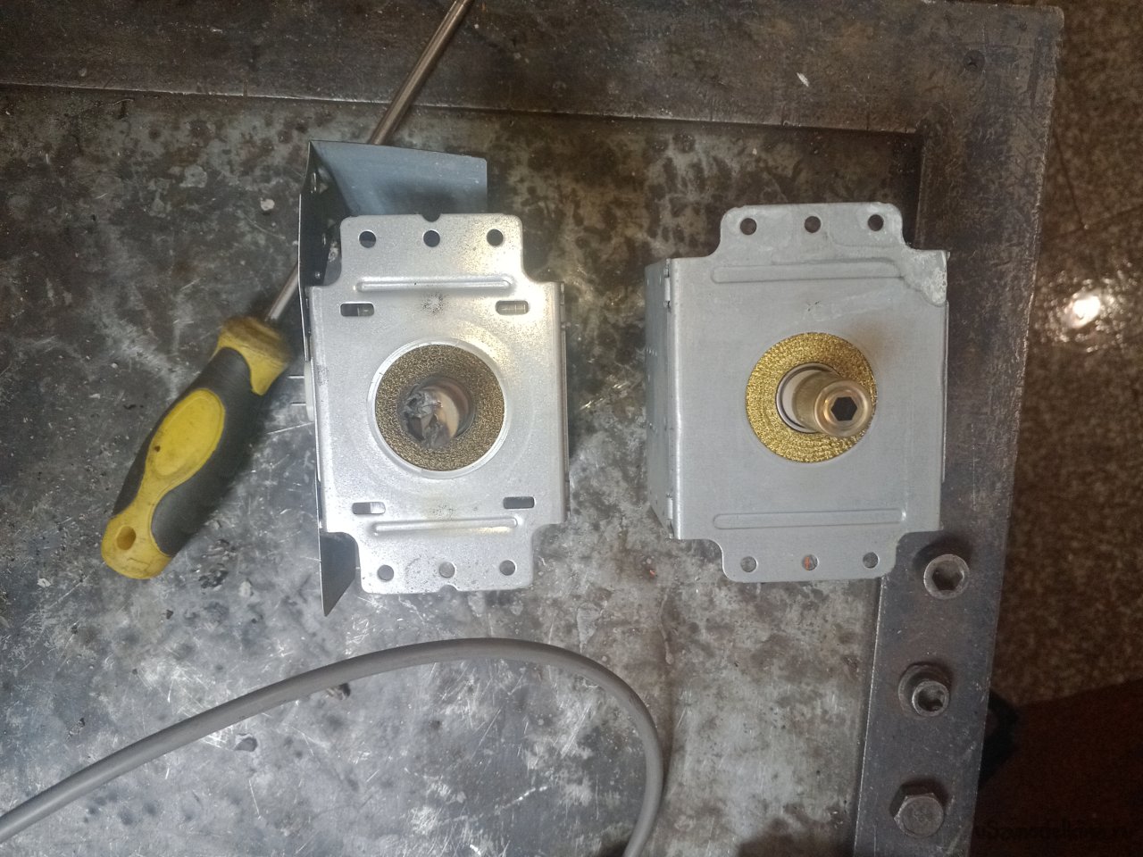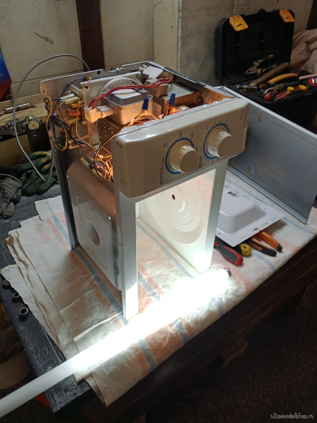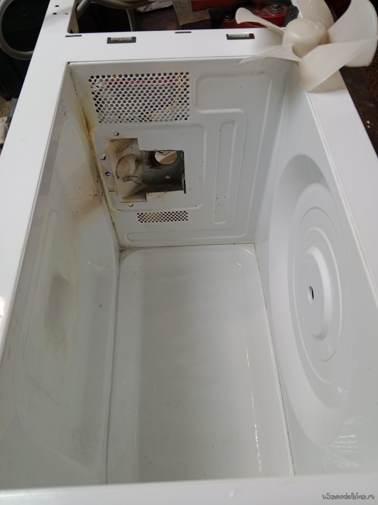Начал перекраивать внутренний корпус микроволновки. Так как работы будут проводиться при помощи УШМ, образуются мелкие частицы металла при резке. Магнетрон конструктивно имеет два неплохих магнита и часть металлической стружки будет просто намагничивается на них. На этот этап работ магнетрон был снят. Так же был снят блок управления.
