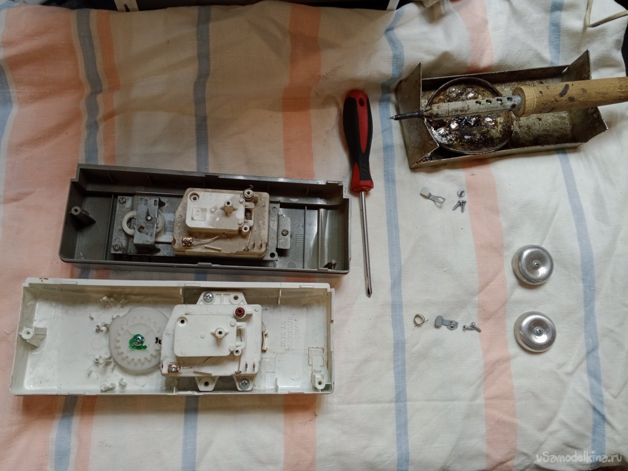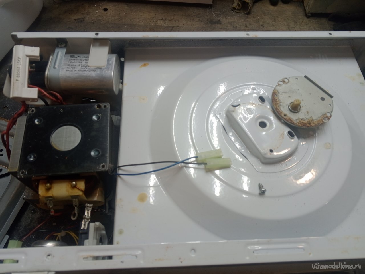 Еще раз «прошелся» по проводке, убрал лишнее, в том числе провода на моторчик тарелки, сделал новые технологические скрутки, проверяя работоспособность на «донорах». Включение – гудит, крутится и светит. Выявил следующую неисправность – не работает моторчик, часового механизма таймера. Моторчик «донор» в помощь. ФОТО 38 Для наглядности на графике, постарался изобразить работу микроволновки при нагреве пищи и разводку проводов блока управления, может кому пригодится.