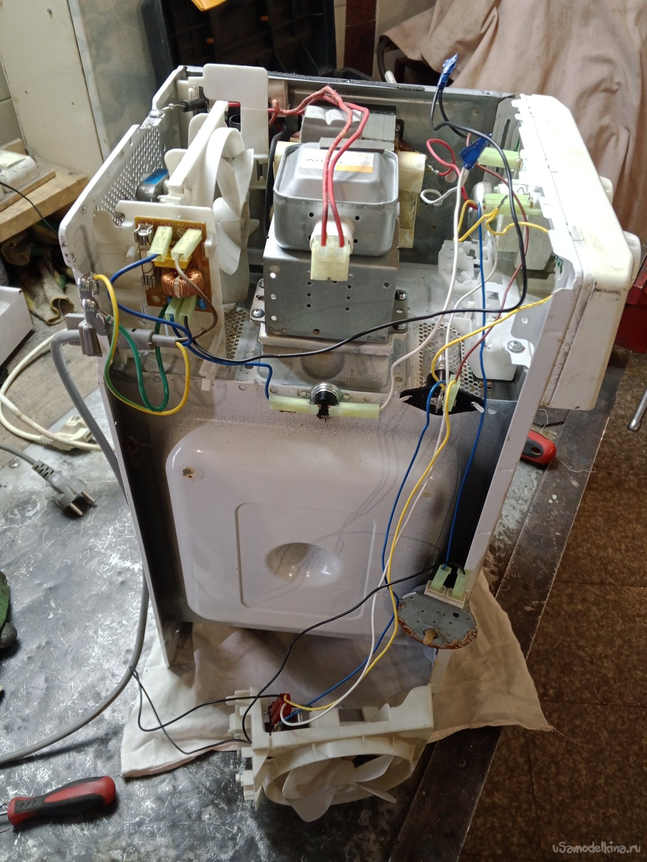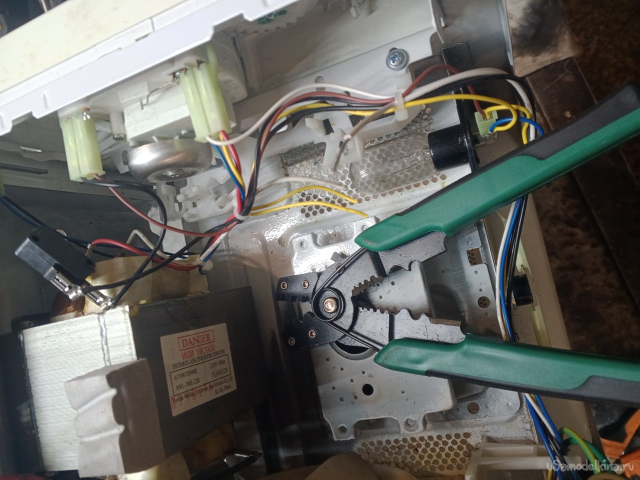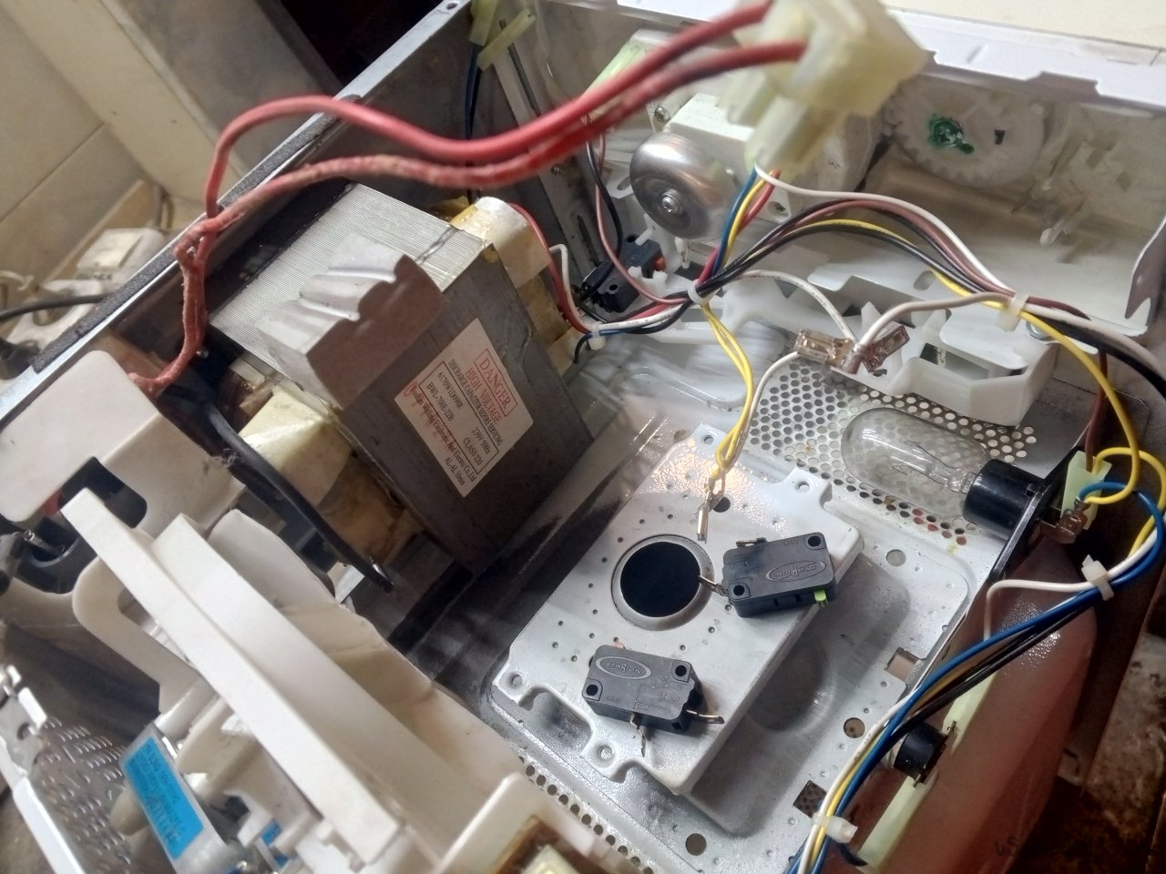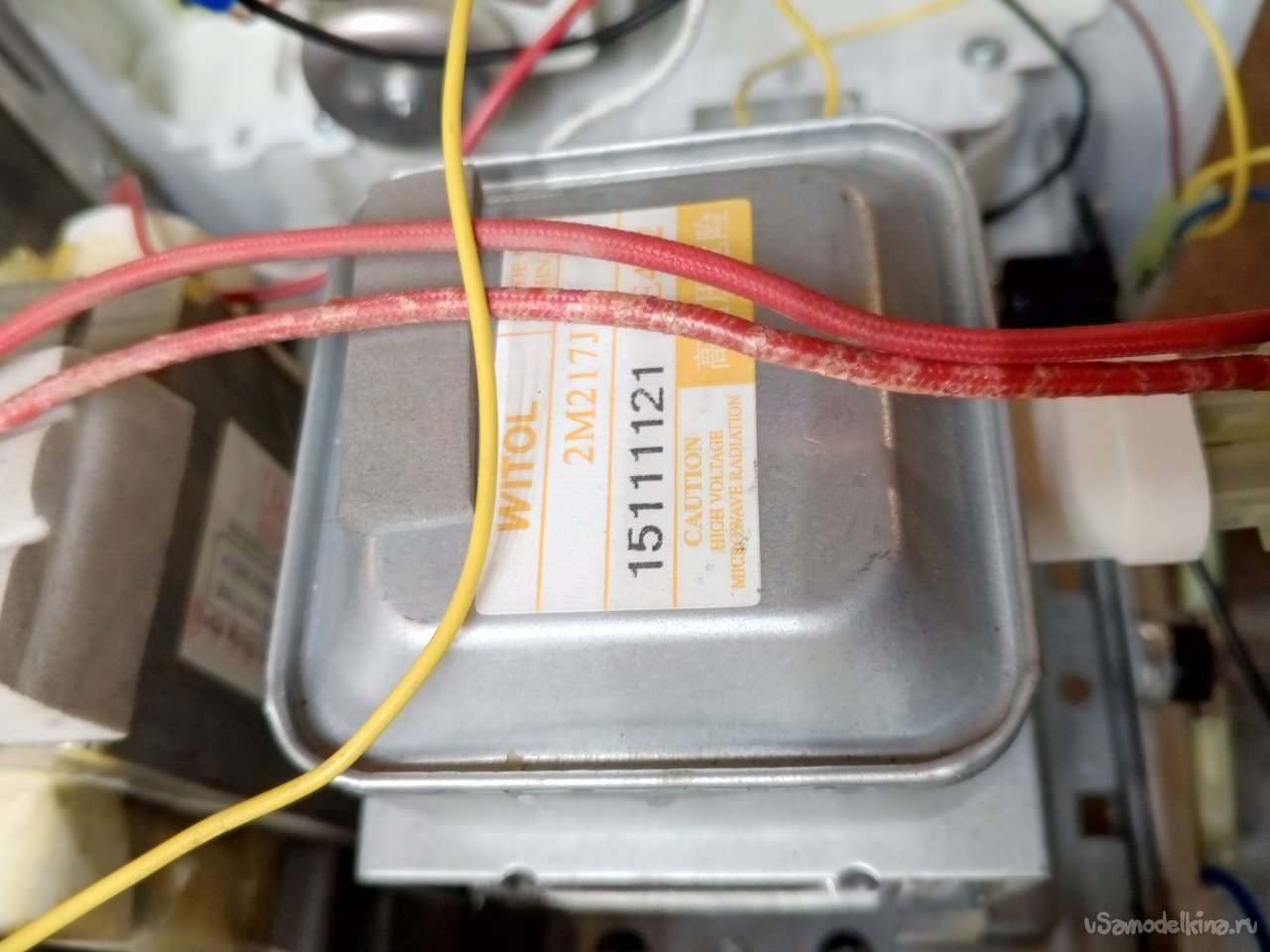 , а заменил на другой рабочий. По мощности указанных в ТТХ трансформатора и магнетрона, они подходили друг к другу. Далее демонтировал «концевики», замыкающие электроцепь, при закрывании дверки микроволновки, а из проводов сделал скрутки напрямую.