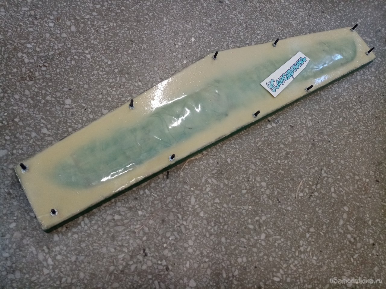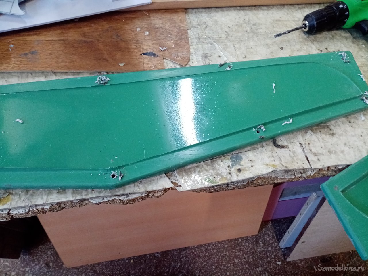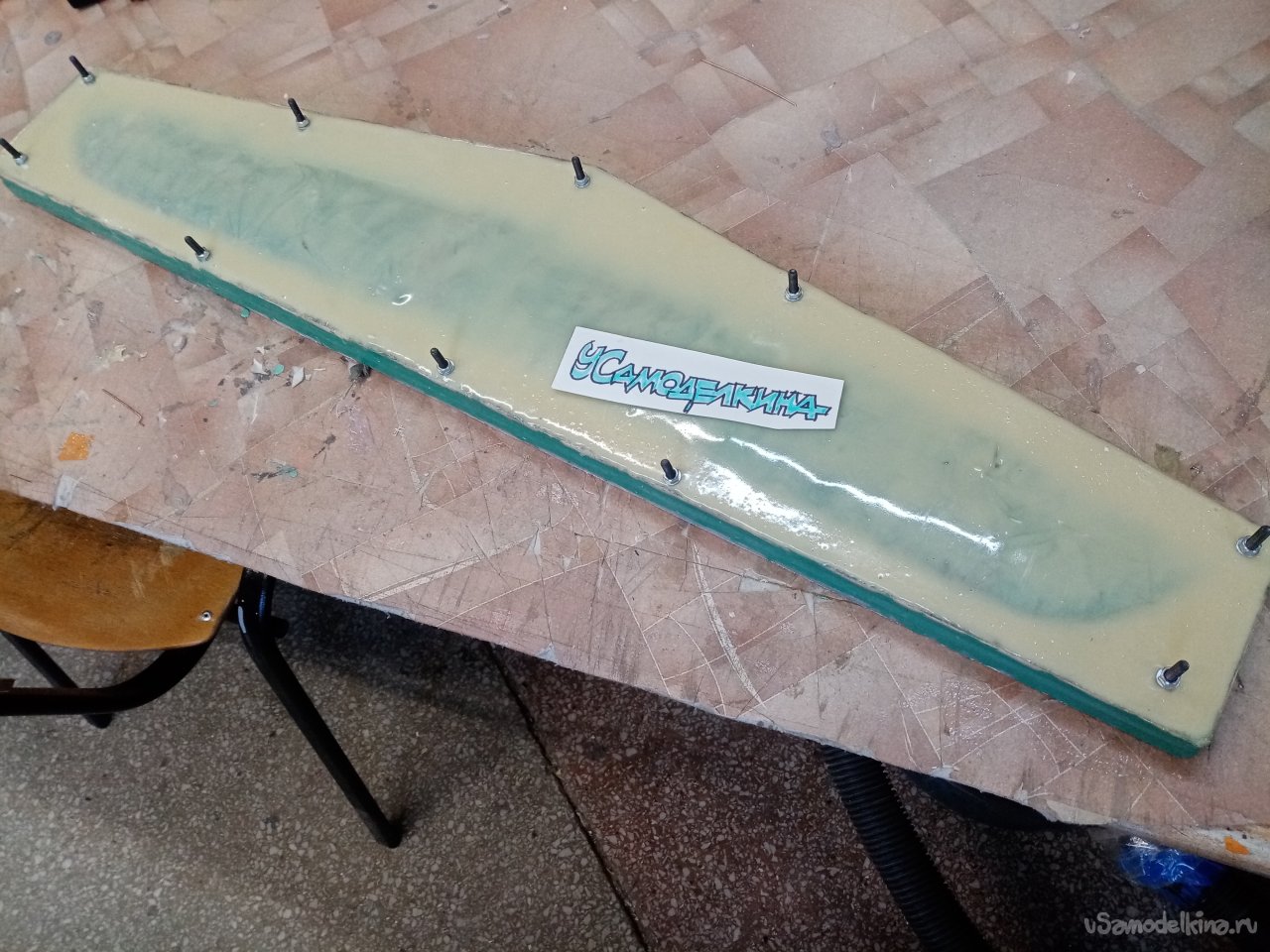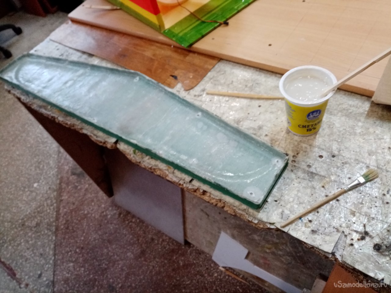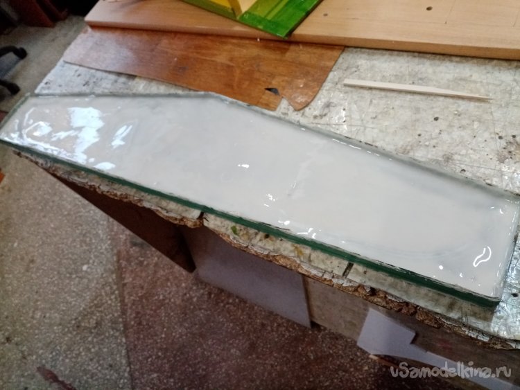 Устанавливаю в дрель самую крупную фрезу и начинаю резать слой смолы и стеклоткани на верхней части половинок матрицы. Наношу штрихи прямо и под наклоном. Тешу себя мыслью что таким способом добьюсь хорошей склейки старого слоя с новым. Перед самым замесом вспомнил. Что остались отверстия от винтов стяжки половинок матрицы. Аккуратно заклеиваю пластилином. Из остатков стеклоткани нарезаю кусочков в размер. Главное попасть в ширину. На бортики не нужно наклеивать. Вот теперь все готово. Замешиваю сто грамм смолы. Почему именно этот вес?. Для меня комфортно работать. Не торопясь и тщательно пропитывая стеклоткань смолой. Есть тонкость. Пропитывается не сразу. С некоторой задержкой. Как раз времени хватает размазать сто грамм и нанести три слоя стеклоткани до начала загустевания состава. Затем еще замешиваю такое же количество. Укладываю три слоя стеклоткани.