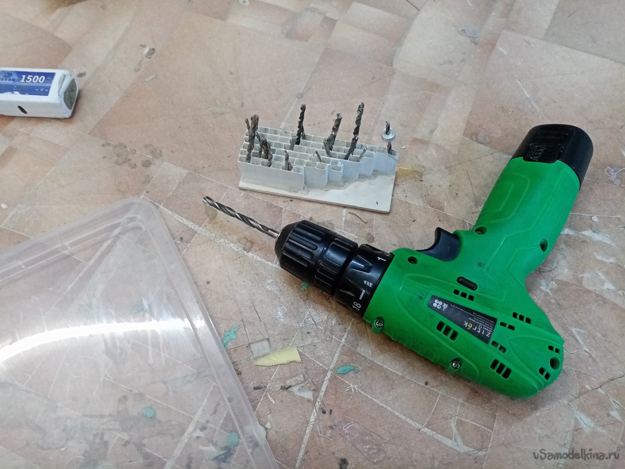 Моя небольшая модернизация полностью застыла. Нужно досверлить замазанные пластилином отверстия до места. Подбираю из набора сверло нужного диаметра.