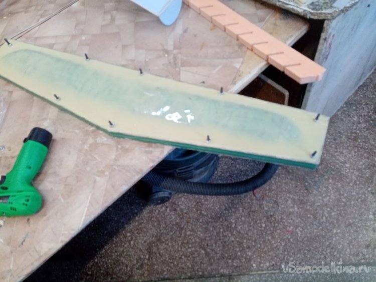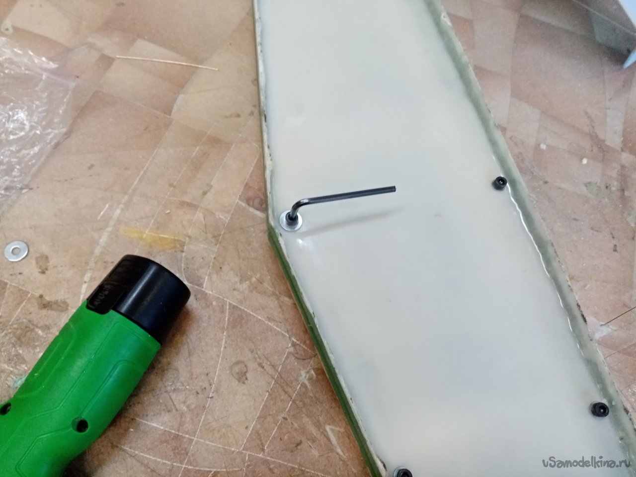 Режем новое ядро крыла из пенопласта укладываем в матрицу и от души закручиваю болты фиксации. Сомнения гложут. Вдруг треснет все. Прямо руки тряслись. Но все закончилось хорошо. Крыло обжалось как нужно и склеилось.