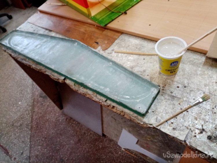 Корка матрицы получилась не жесткая. При формировании крыла нужно достаточно жестко обжать бутерброд, помещенный внутрь изделия. Поскольку для лучшего формования ядро крыла вырезается для оклейки стеклотканью со смолой на микрон больше нужного размера. Затем вся конструкция из пенопластового ядра с усилениями и оклеенное стеклотканью или углетканью помещается в матрицу и все это хозяйство сжимается. Желательно сильно. Что улучшает склейку ядра с обшивкой. Вот в этом моменте была недоработка. Матрица немного изгибалась и не позволяла увеличить внутреннее давление. Нужно увеличить жесткость половинок матрицы. Придется слегка нарастить слой стеклоткани и эпоксидной смолы на внешней поверхности верхней и нижней половинки матрицы. Казалось бы просто. Укладывай стеклоткань и наноси смолу. Но есть риск, что внешний слой при нагрузке может отслоиться от уже готовой корки. Но делать нечего попробую, что получится.