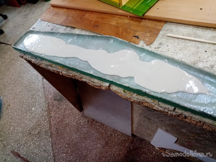 После укладки стеклоткани на двух половинках формы. Решил еще немного увеличить толщину слоя. Замешиваю смолу с пудрой мрамора и заливаю поверх. Немного разгоняю кисточкой по форме. Укладываю половинки на ровную поверхность. Состав сам растечется по ванночке формы.