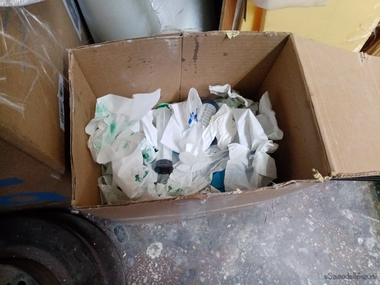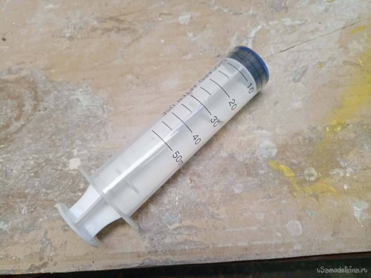 Очень тщательно размешиваю краску в банках. Для работы нужно перелить в более удобные ёмкости. Для этой цели вполне подойдут баночки от медицинских жидкостей. Есть тонкий носик, удобно наливать в аэрограф. Переливаю при помощи большого медицинского шприца. Немного разбавляю растворителем и состав готов к применению.
