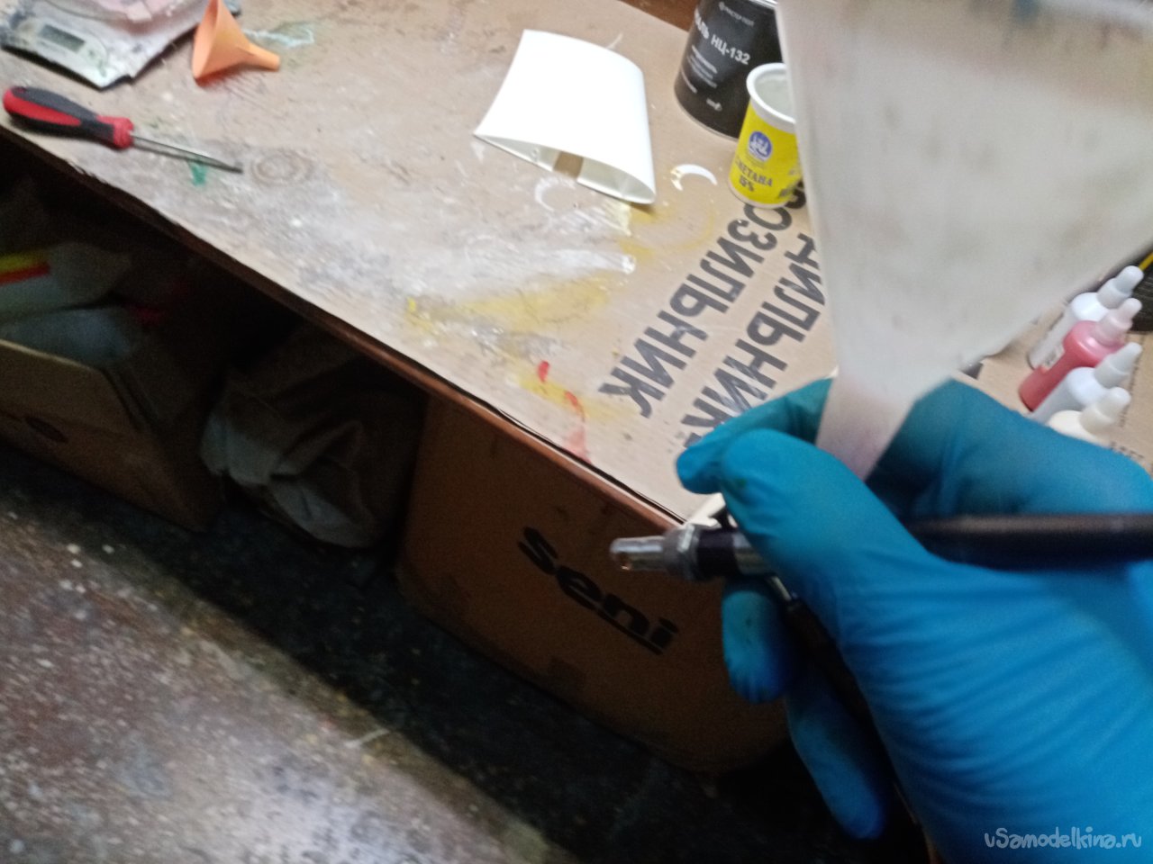 Для начала заказал мой любимый желтый цвет. Посылочка пришла довольно быстро. Нужно попробовать. Как по свойствам, не сильно отличается от старого варианта. Приготовил советский аэрограф с самым большим соплом. Немного разбавил растворителем 650м, покрасил немного. Качество не плохое.
